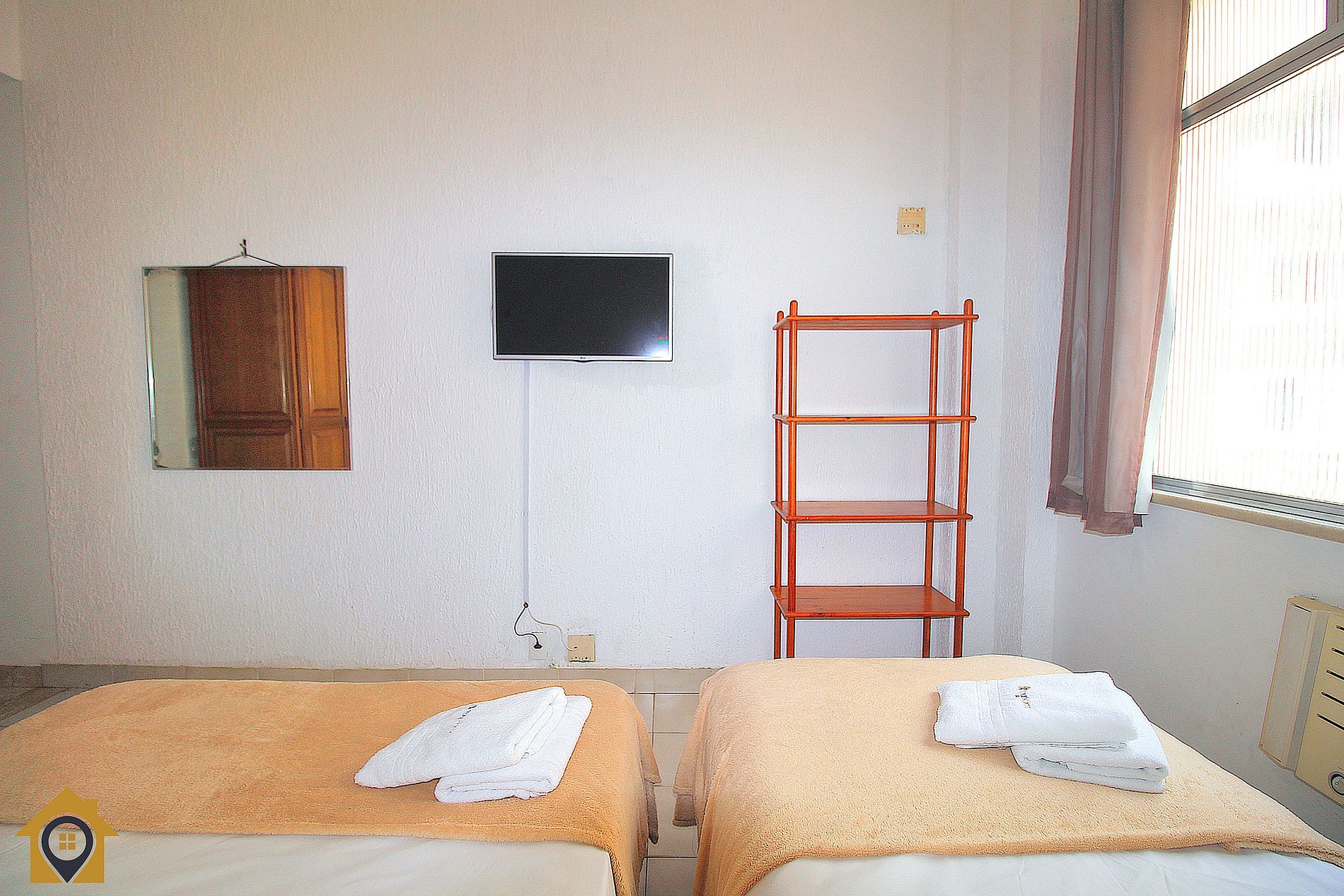 Studio econômico para 3 pessoas a uma quadra da praia de Copacabana. Próximo a mercados, farmácias, padarias e caixa eletrônico 24h No studio de 37m2, temos: •Quarto: Cama de casal Cama de solteiro Tv LCD 32’ Ar condicionado •Banheiro: Chuveiro elétrico Blindex Espelho •Cozinha: Microondas Geladeira Fogão Máquina de lavar Pratos, copos, panelas e talheres Sanduicheira e cafeteira Roupas de cama e toalhas de banho brancas