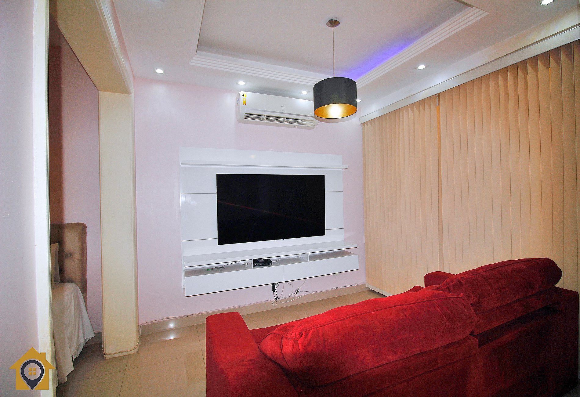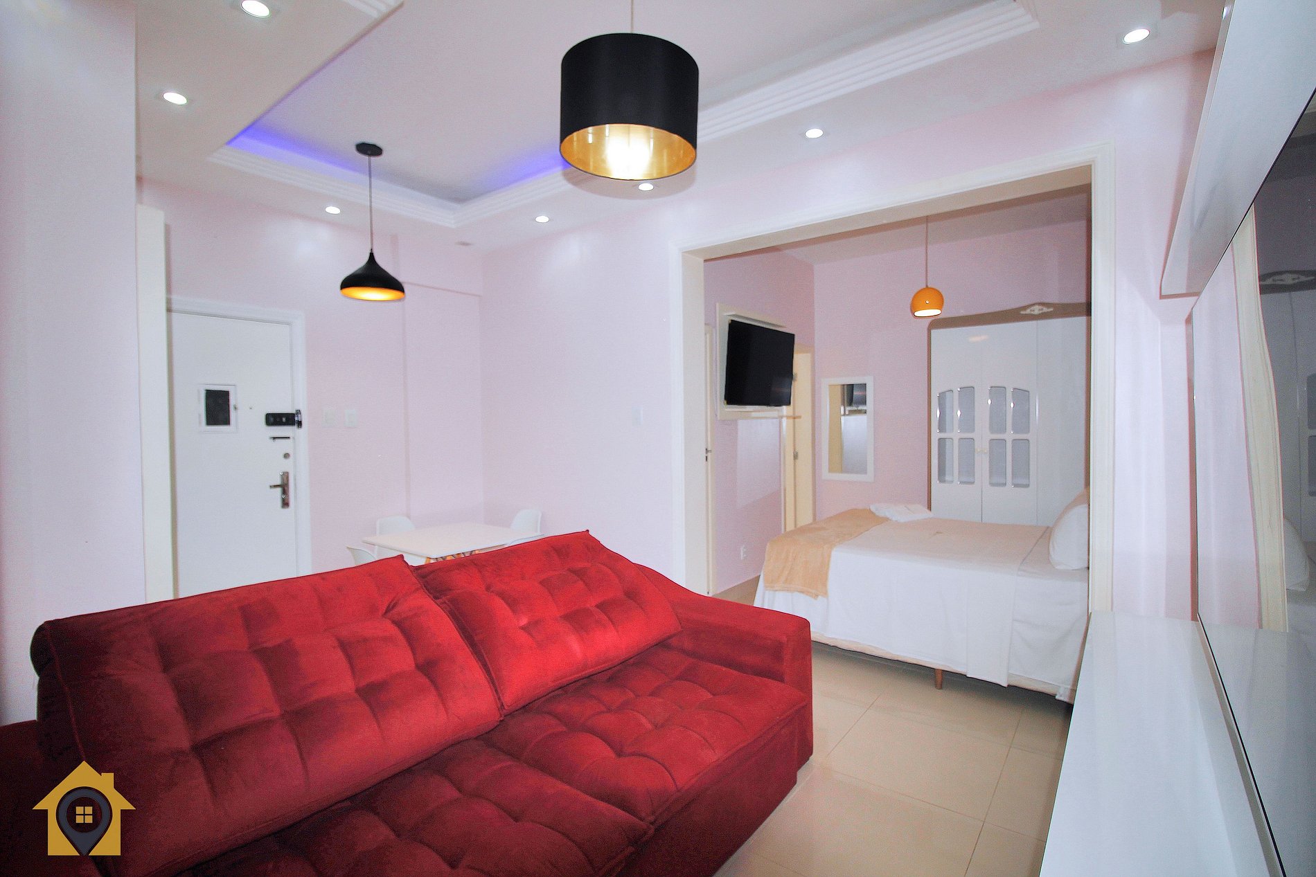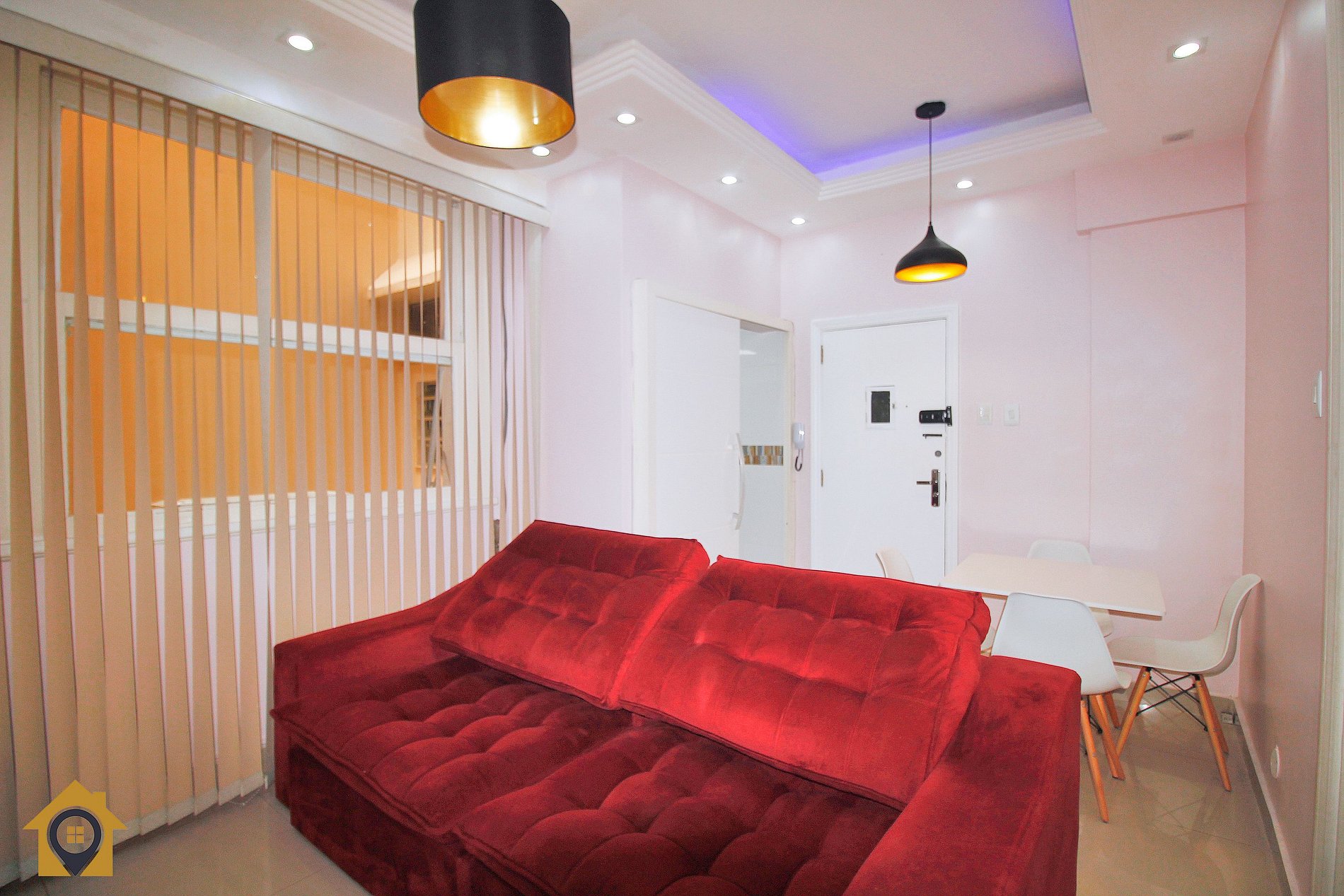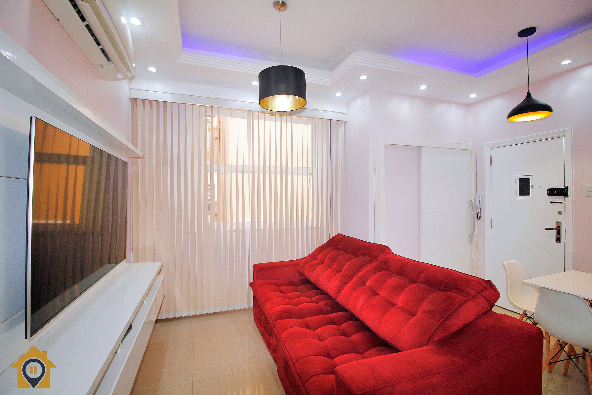 A sala é ampla e aconchegante, com sofá retrátil que pode acomodar uma pessoa ou ser usado com colchão extra, TV Smart de 65 polegadas, mesa com quatro cadeiras e teto com iluminação em LED, criando um ambiente moderno e confortável.