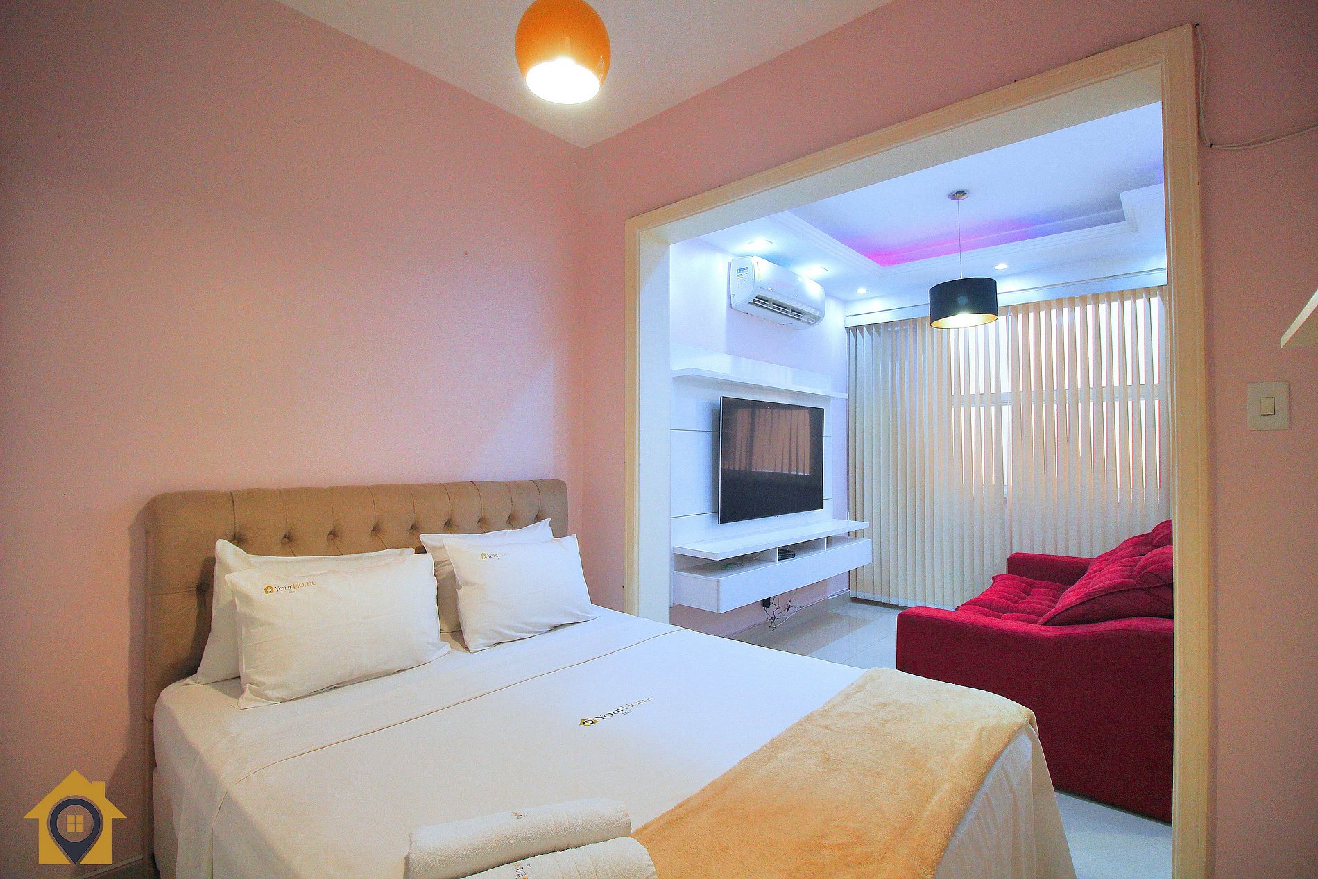 O quarto conta com cama de Queen, TV Smart de 50 polegadas e decoração acolhedora.