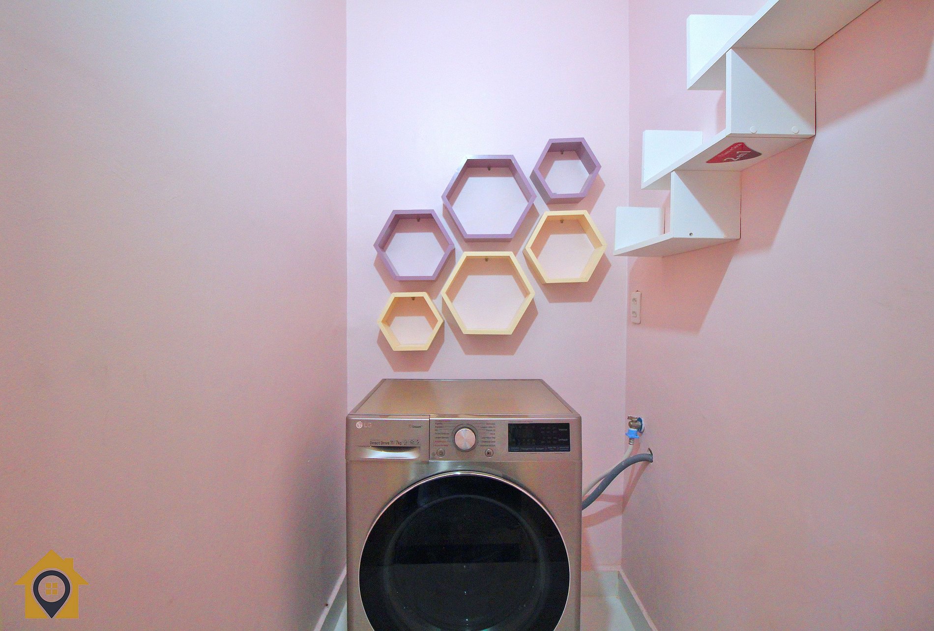 Apartamento dividido em quarto, sala, cozinha, banheiro e pequena área de serviço com máquina lava e seca.