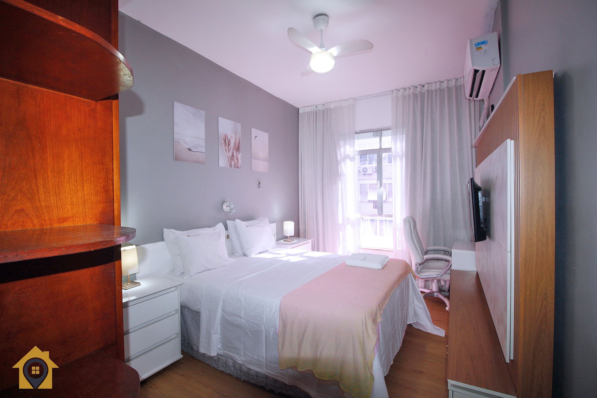 Imóvel com quarto equipado com cama de casal, guarda roupa, cabeceira com luminária, ar-condicionado, espelho grande, TV Smart e escrivaninha com cadeira. Banheiro com chuveiro elétrico. Cozinha com bancada com 2 cadeiras altas, fogão por indução 4 bocas, geladeira, micro-ondas, forno elétrico, filtro de água e utensílios para cozinhar.