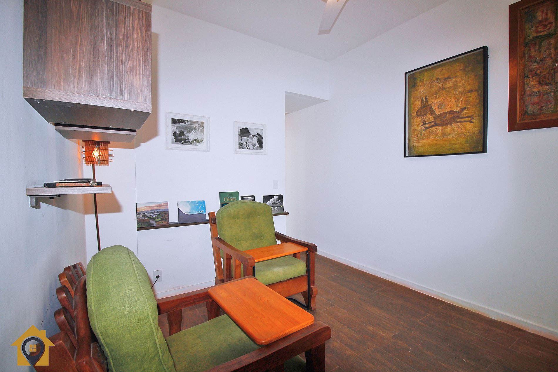 A sala é aconchegante e funcional, equipada com Smart TV, duas poltronas, mesa alta com três banquetas, ar-condicionado e ventilador de teto — perfeita para relaxar após um dia de praia ou trabalho.