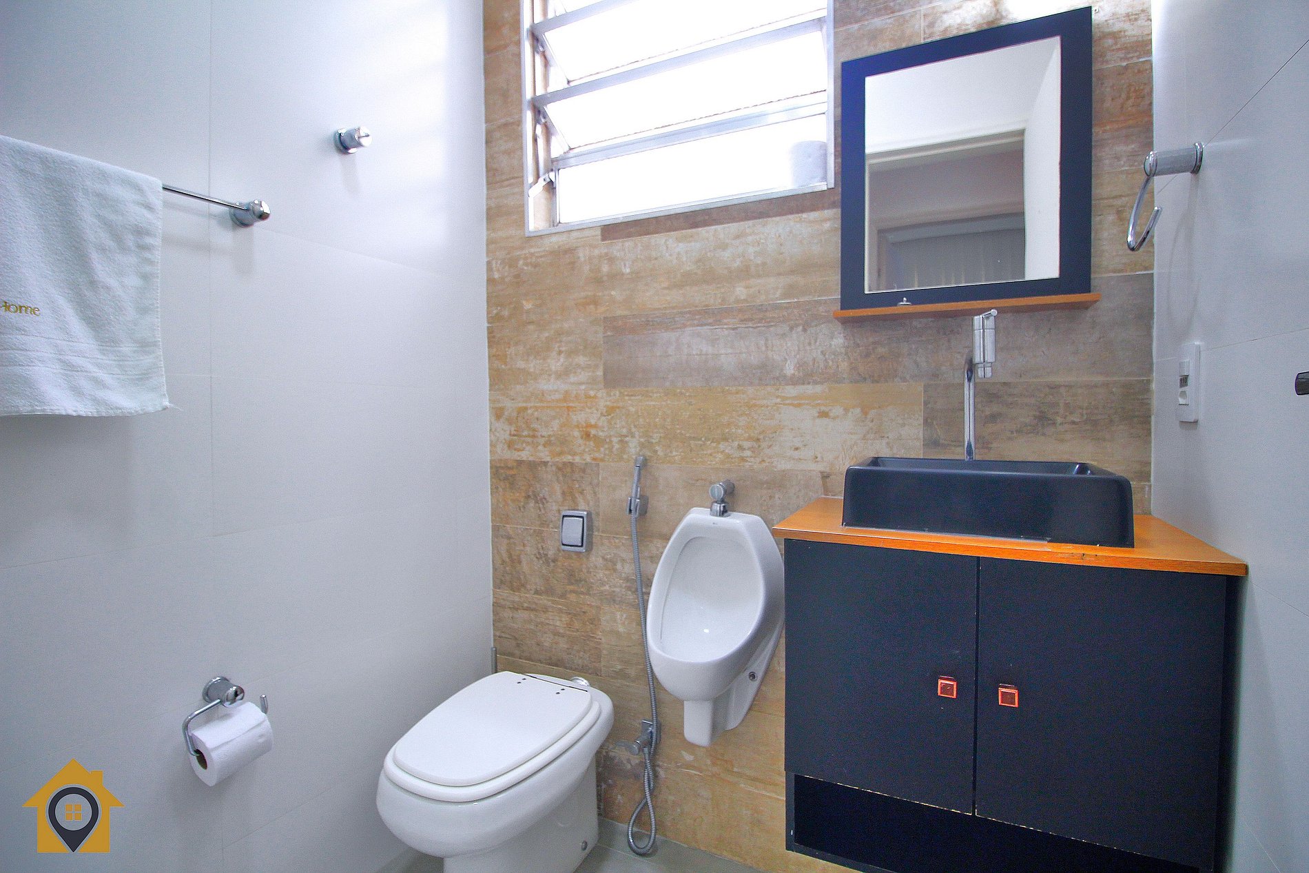 O banheiro é completo, contando com vaso sanitário, mictório, espelho e chuveiro elétrico.