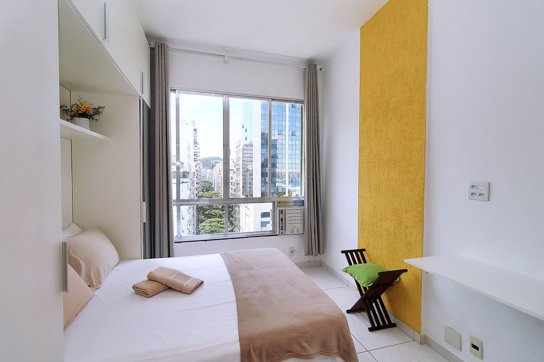 Studio com vista mar incrivel para 4 pessoas na quadra da praia em Copacabana. Imóvel de 37m2 dividido em sala, quarto, cozinha e banheiro. No quarto, temos uma cama de casal, mesa dobrável e ar condicionado. A cozinha americana dispõe de geladeira, fogão 2 bocas, microondas e 2 banquetas. Banheiro com chuveiro a gás. TV basica e Wi-fi incluido no preço. Portaria 24 horas. Disponibilizamos roupa de cama e banho