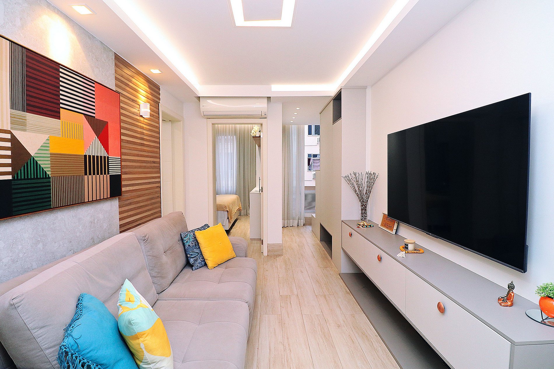 A sala dispõe de um sofá retrátil bastante aconchegante, mesa com 4 cadeiras, SmartTV de 65", ar condicionado split.