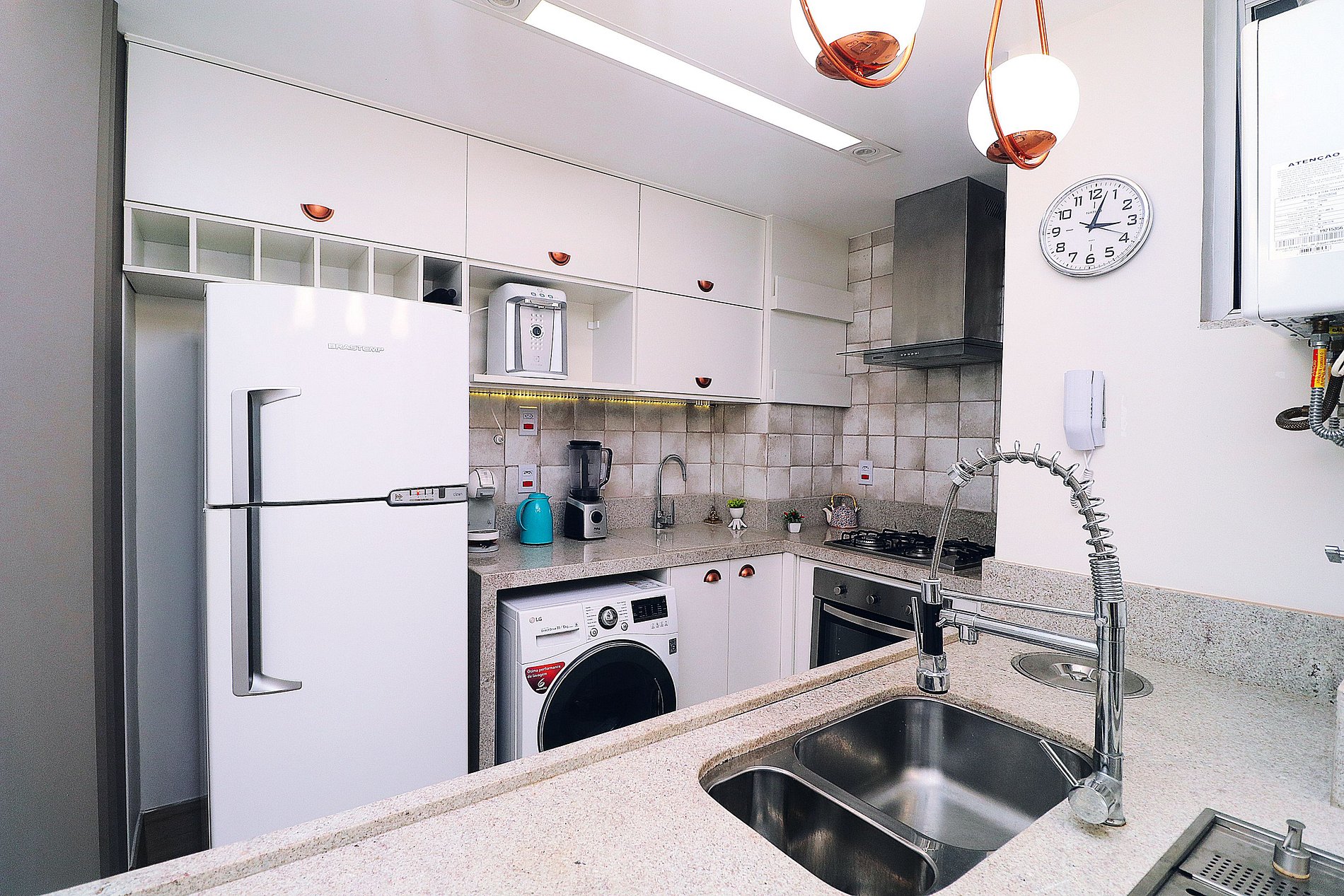 Cozinha com geladeira, microondas, fogão 2 bocas, forno e utensílios para cozinhar.