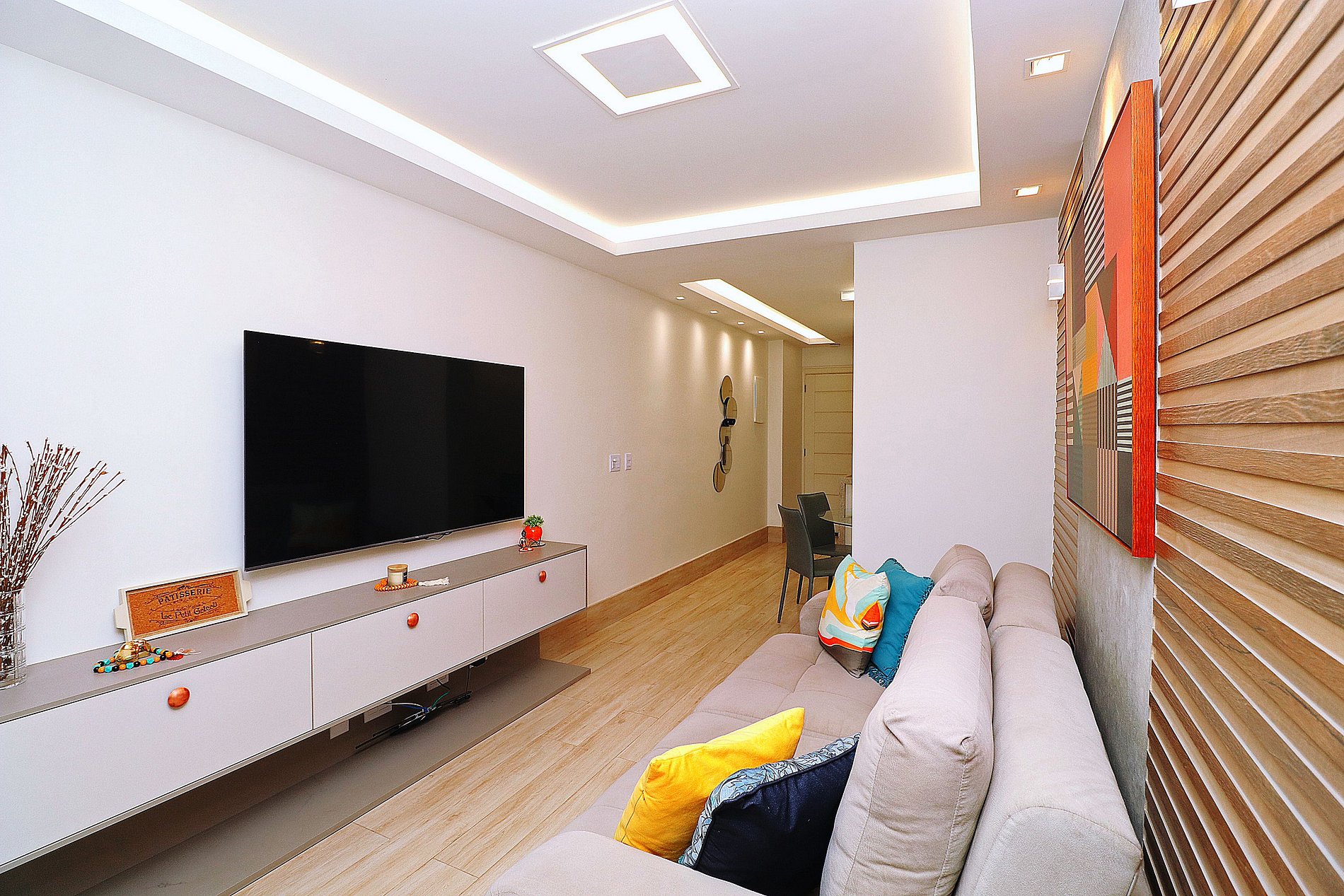 A sala dispõe de um sofá retrátil bastante aconchegante, mesa com 4 cadeiras, SmartTV de 65", ar condicionado split.