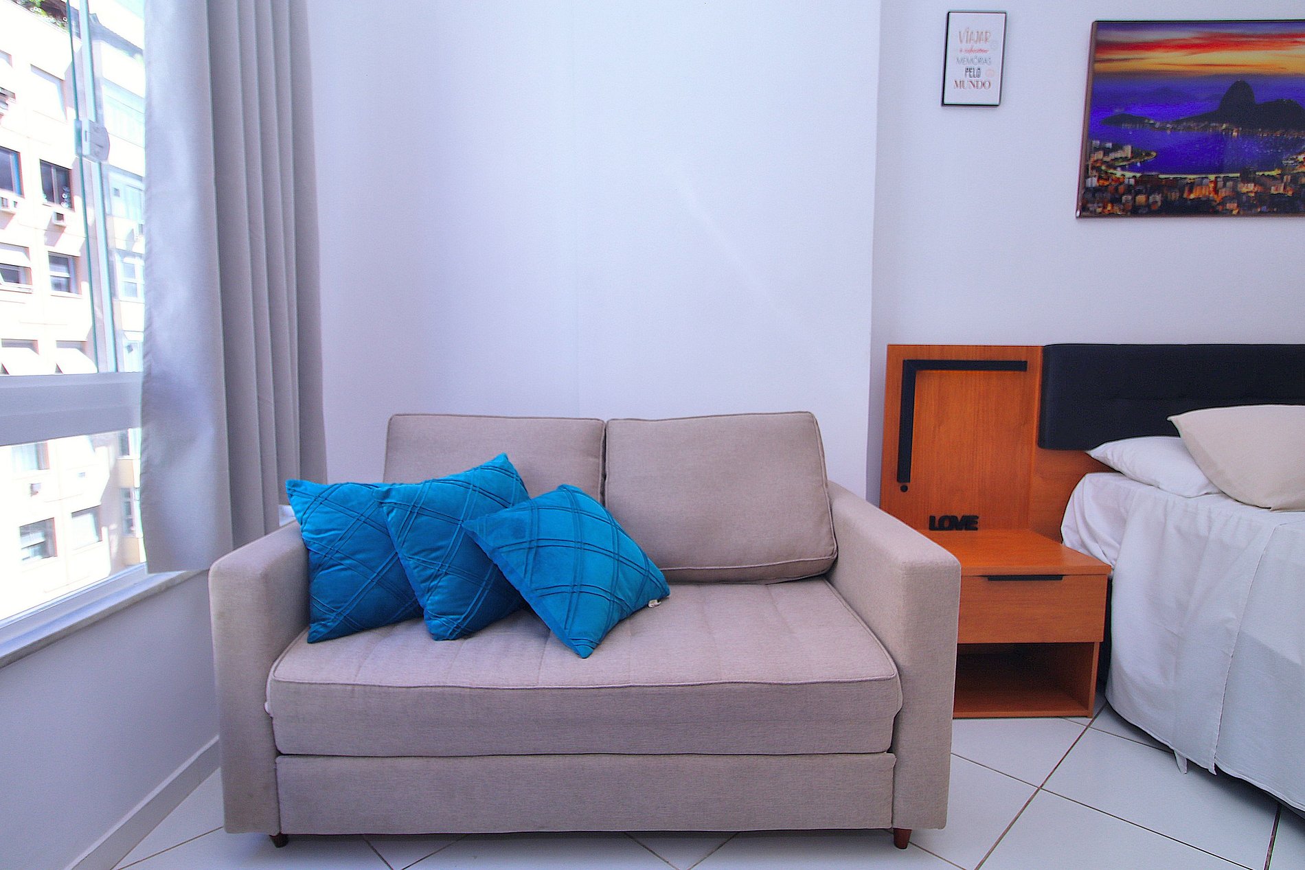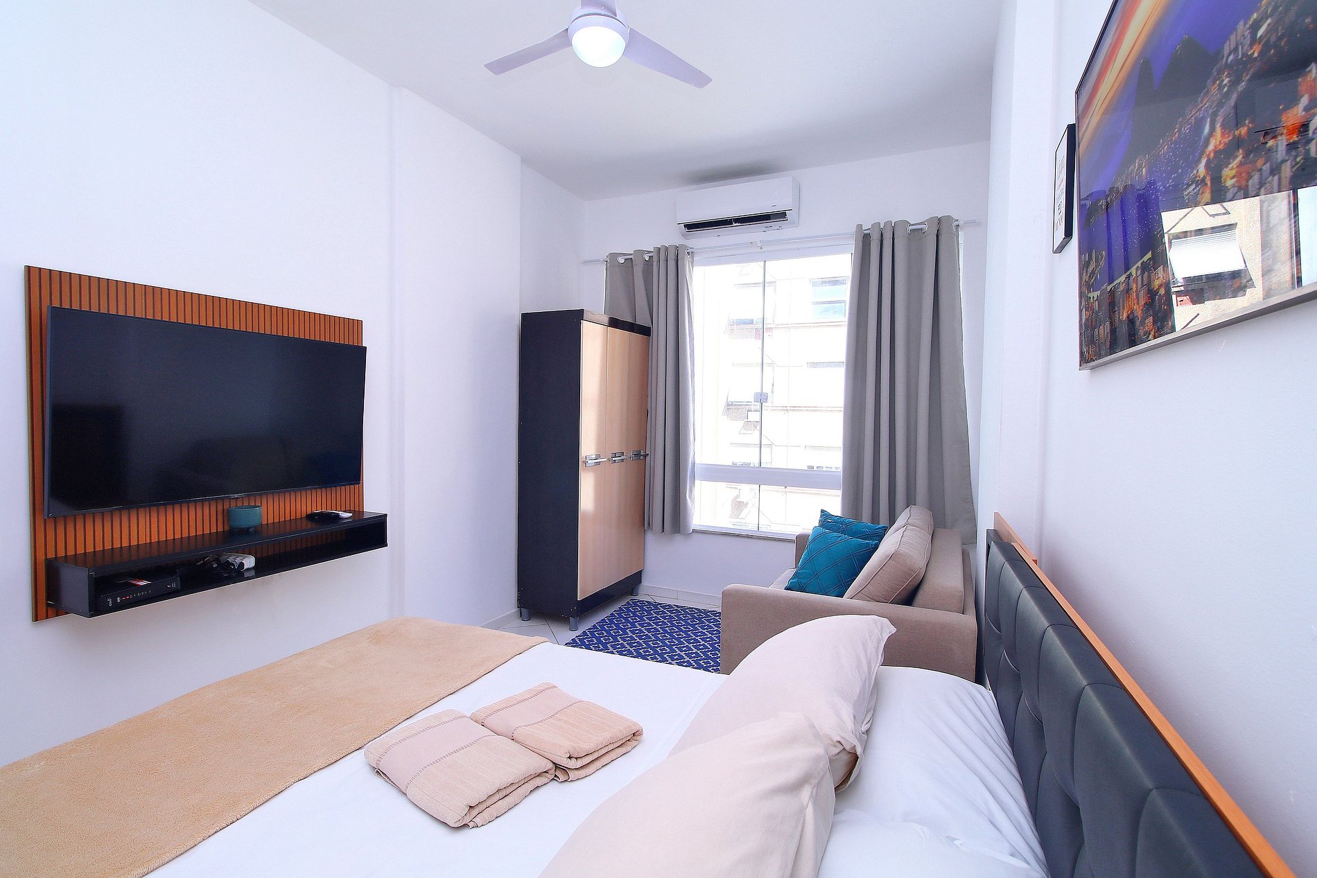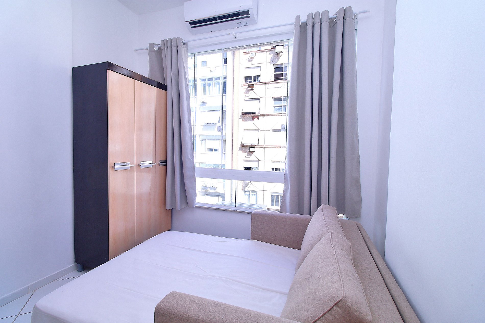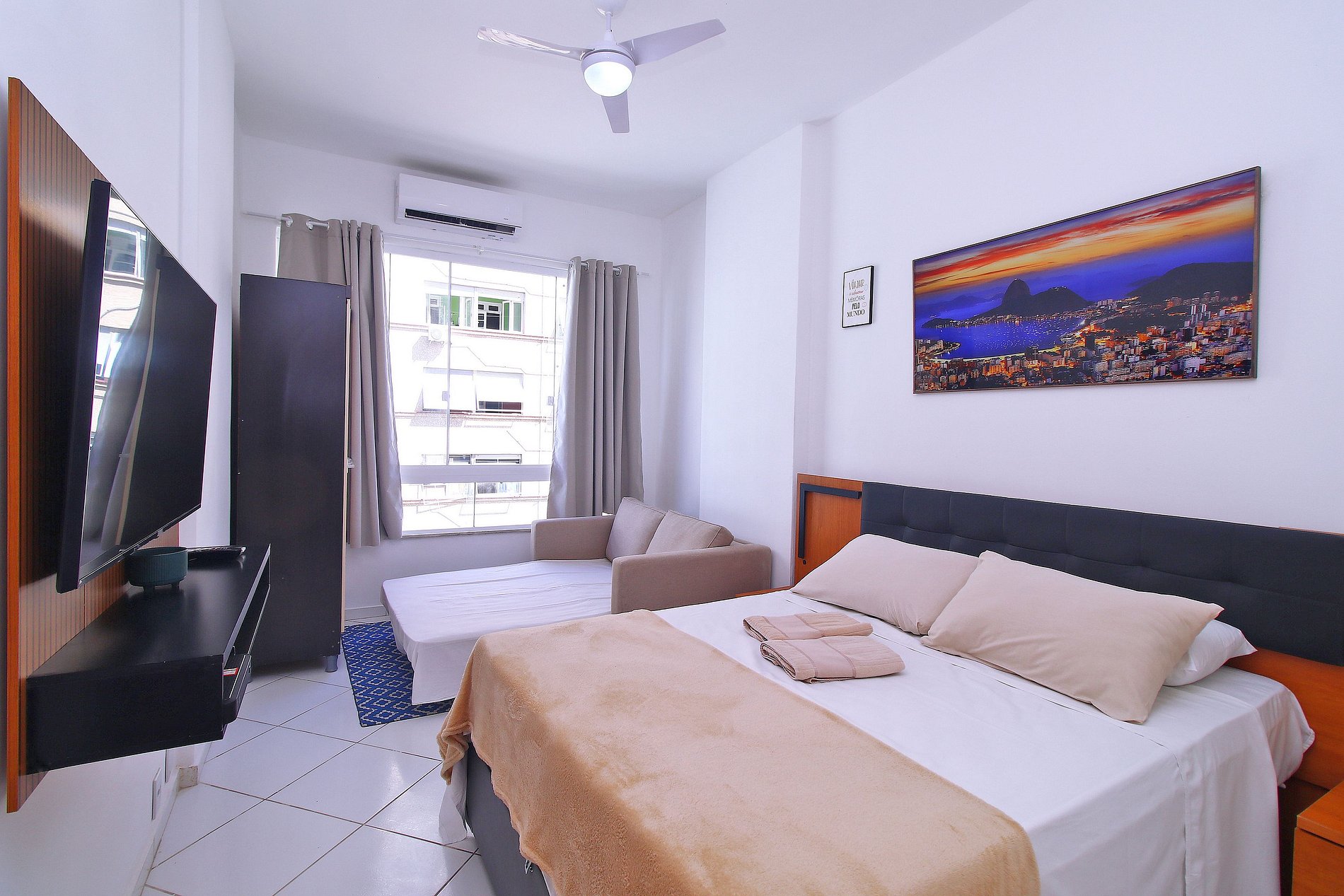 Studio reformado com vista mar para 4 pessoas na quadra da praia em Copacabana. Poucos passos da praia de Copacabana, cercado de comércio; Imóvel de 37m2 dividido em quarto, cozinha e banheiro.