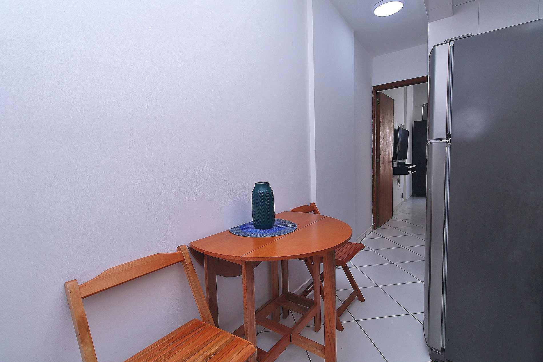Cozinha dispõe de geladeira Frost free, cooktop 2 bocas, microondas e mesa com 2 cadeiras.