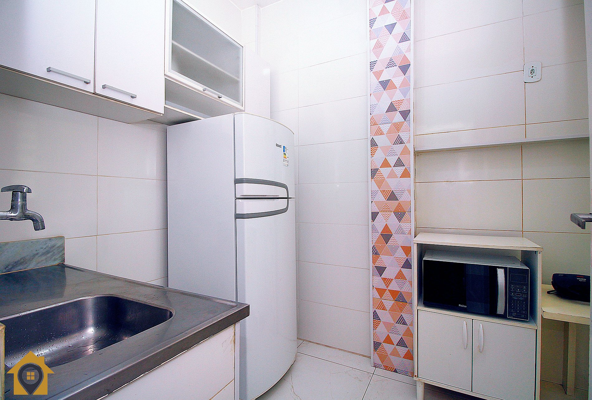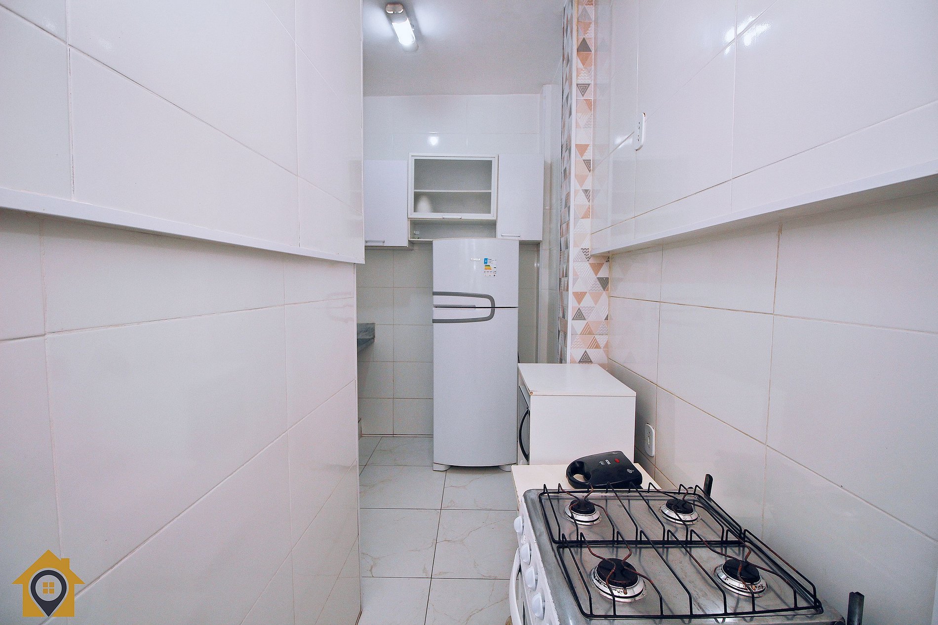 A cozinha é equipada com geladeira duplex, micro-ondas, fogão 4 bocas e utensílios para cozinhar, garantindo praticidade. A sala dispõe de um confortável sofá-cama de casal, smart TV 43" e mesa com 2 cadeiras, perfeita para relaxar ou trabalhar.