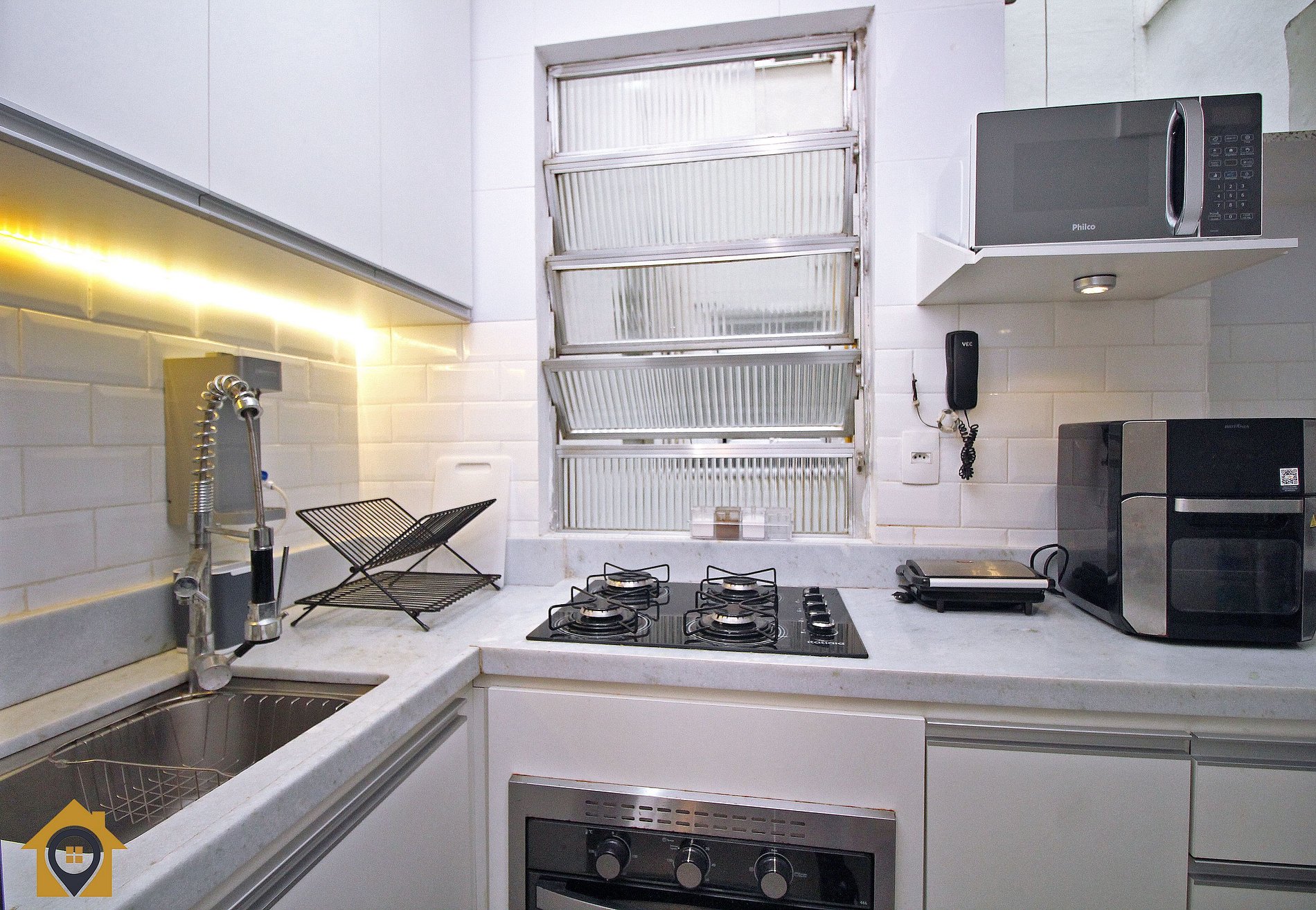 Cozinha moderna e completa, equipada com cooktop 4 bocas, forno elétrico, geladeira, micro-ondas, airfryer, sanduicheira e utensílios para cozinhar, integrada a uma pequena área de serviço com máquina lava e seca e tanque. Banheiro moderno com espelho amplo e água aquecida a gás.