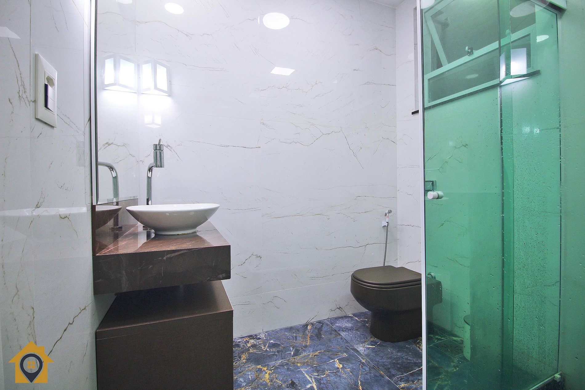 Banheiro moderno, com chuveiro a gás e totalmente equipado.