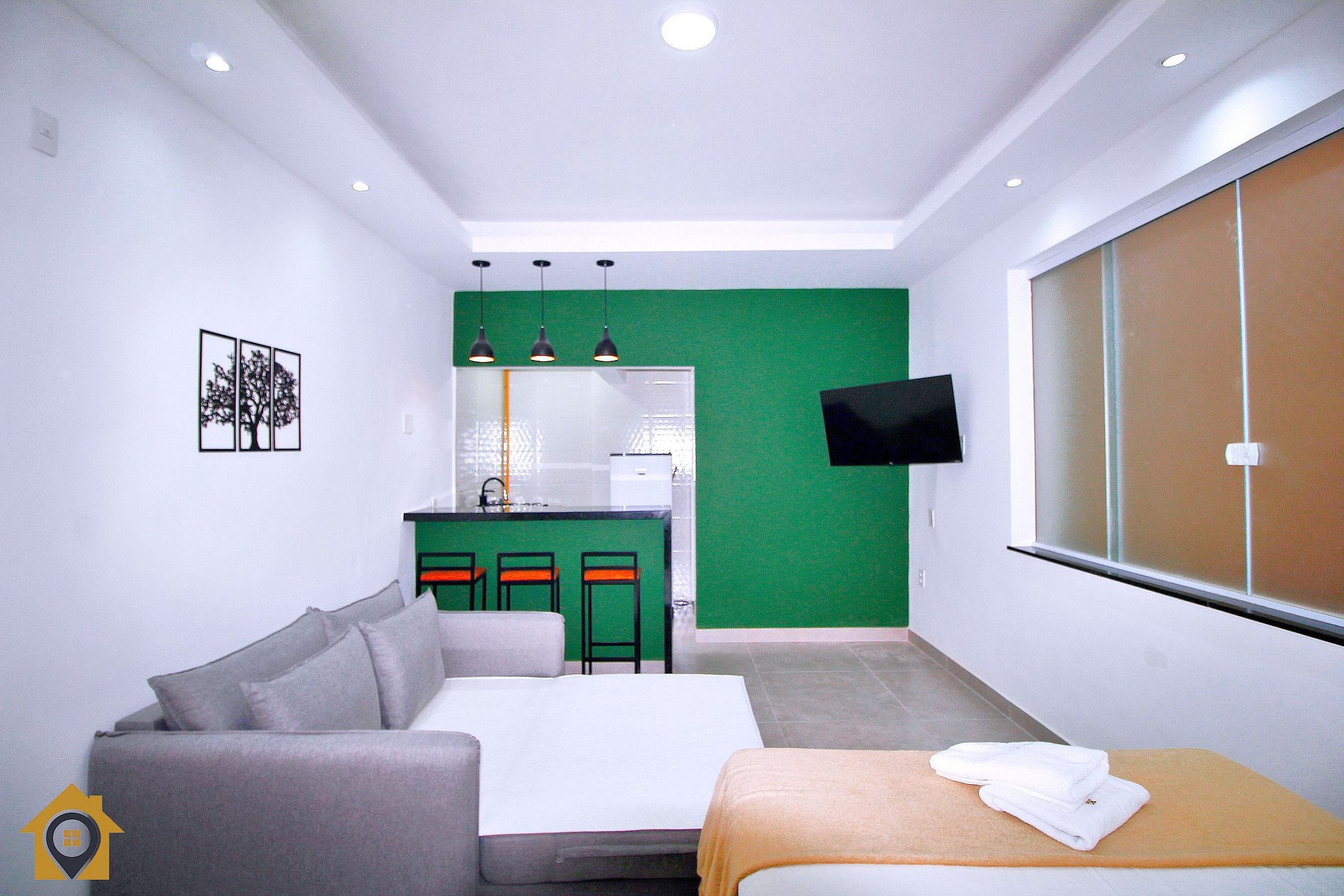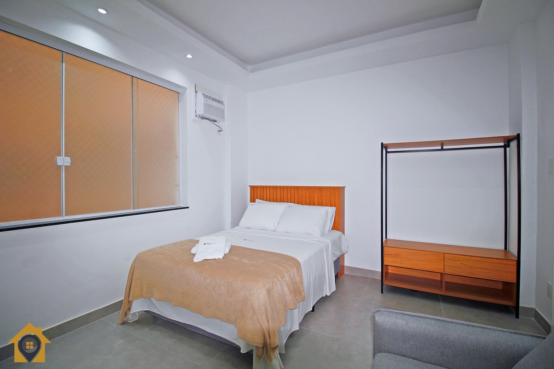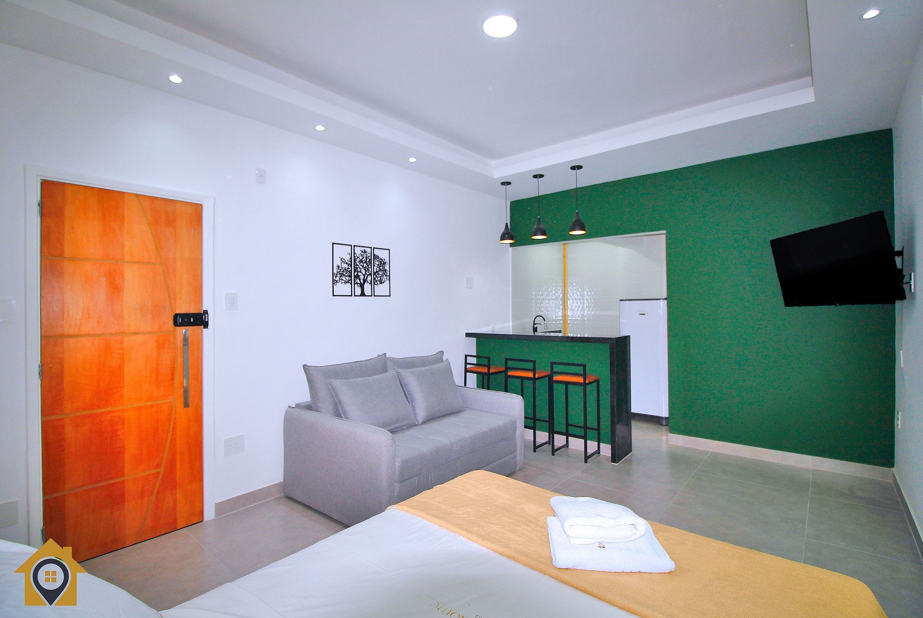 Este studio recém-reformado acomoda até 4 pessoas com conforto e praticidade. O quarto conta com cama de casal com cabeceira, ar-condicionado, armário, sofá-cama e uma TV de 43’’, oferecendo um ambiente aconchegante para descansar após um dia de praia ou passeios.