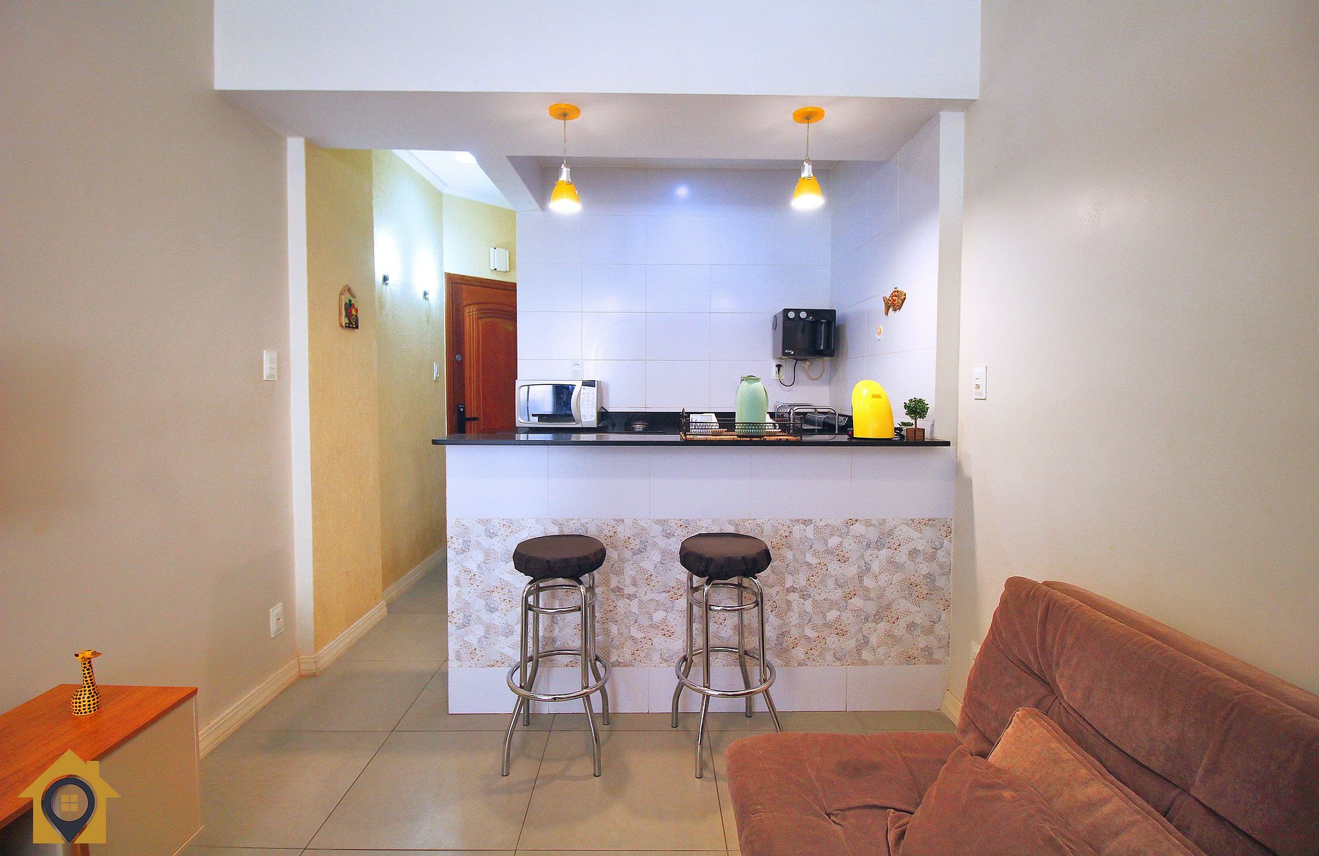 A cozinha americana conta com bancada, filtro de água quente e gelada, cooktop 2 bocas, micro-ondas, frigobar, cafeteira de cápsulas, garrafa térmica e utensílios básicos para cozinhar.