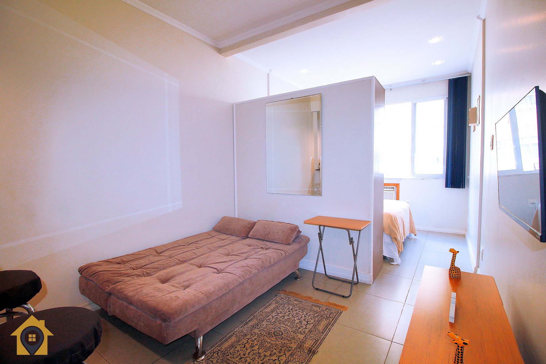 Na sala, você encontra um sofá-cama para duas pessoas, pequena mesa, TV Smart, rack, espelho, bancada com duas cadeiras – ideal para refeições ou trabalho rápido.