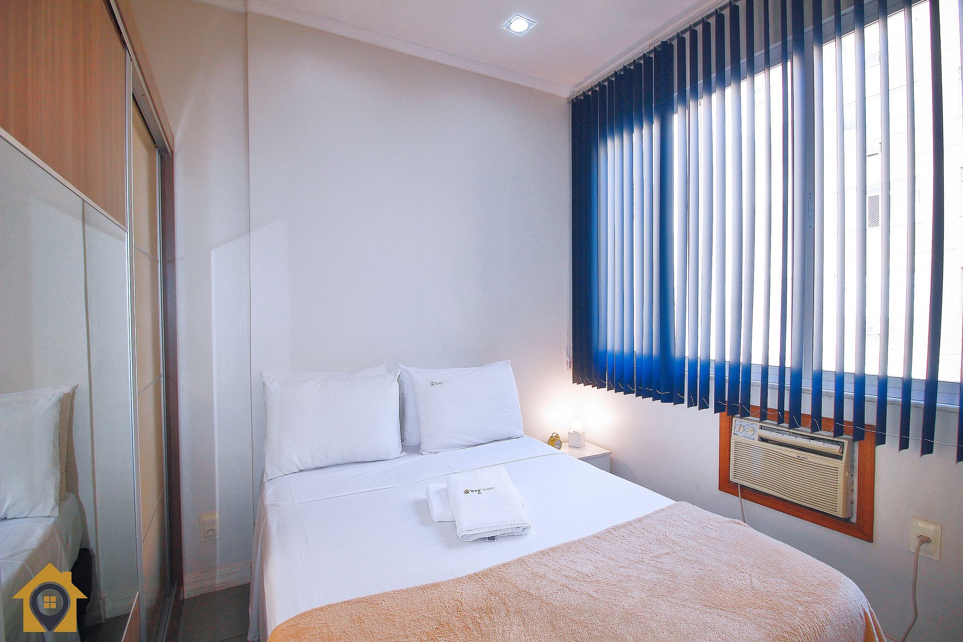 O quarto possui cama de casal, guarda-roupa, mesa de cabeceira com abajur e janela com vista para a rua.
