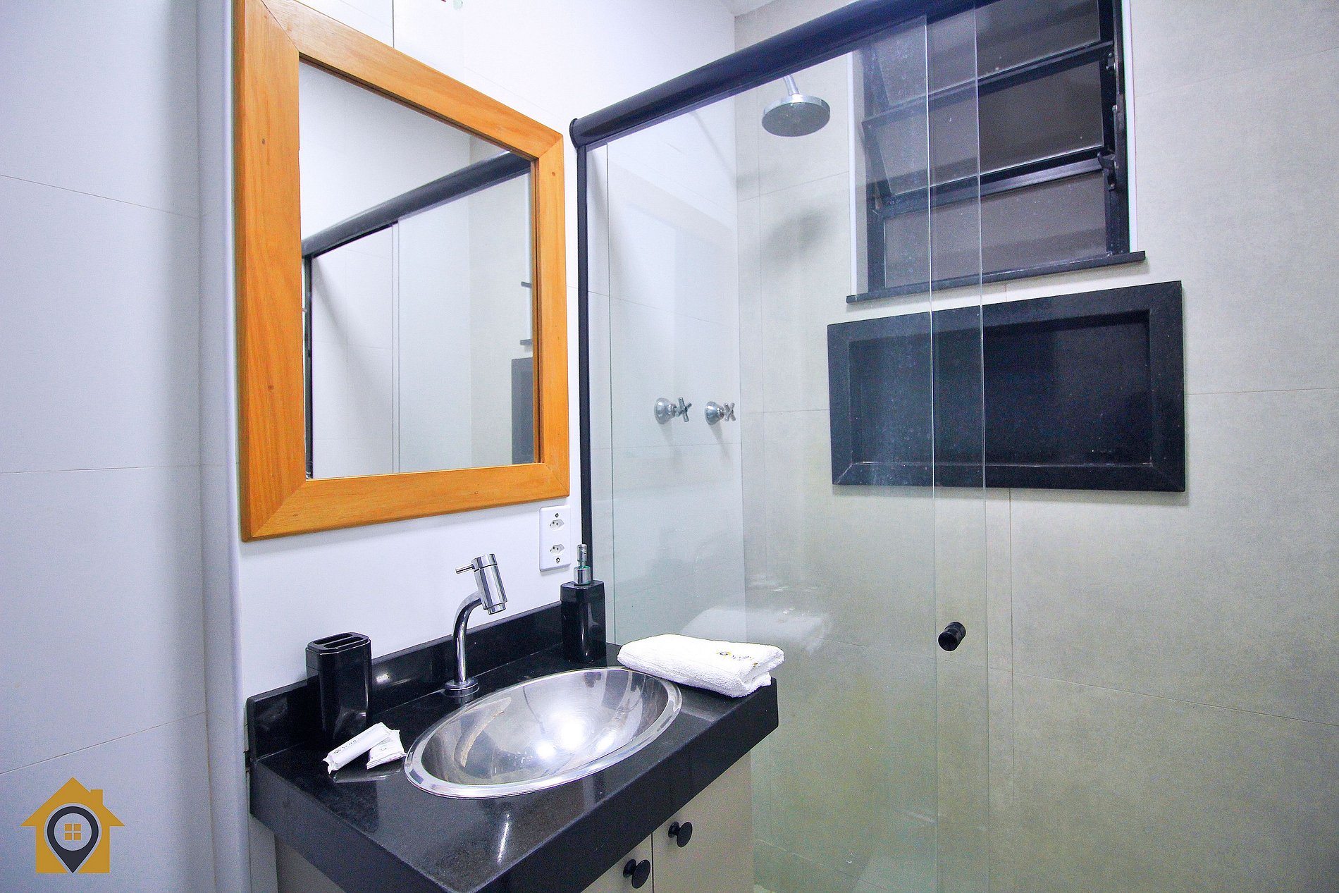 Cozinha moderna e completa, equipada com fogão 4 bocas, geladeira, micro-ondas, sanduicheira e utensílios para cozinhar, integrada a uma pequena área de serviço com tanque. Banheiro moderno com espelho amplo e água quente.