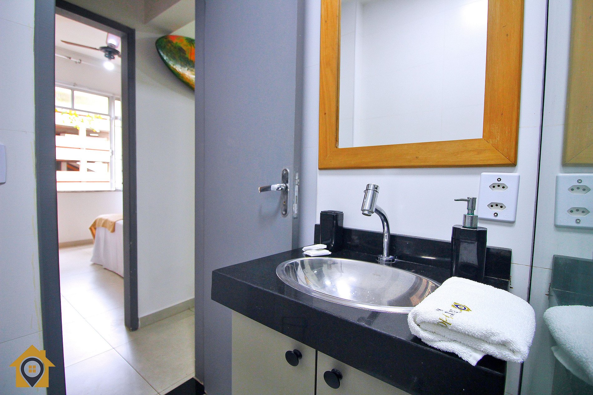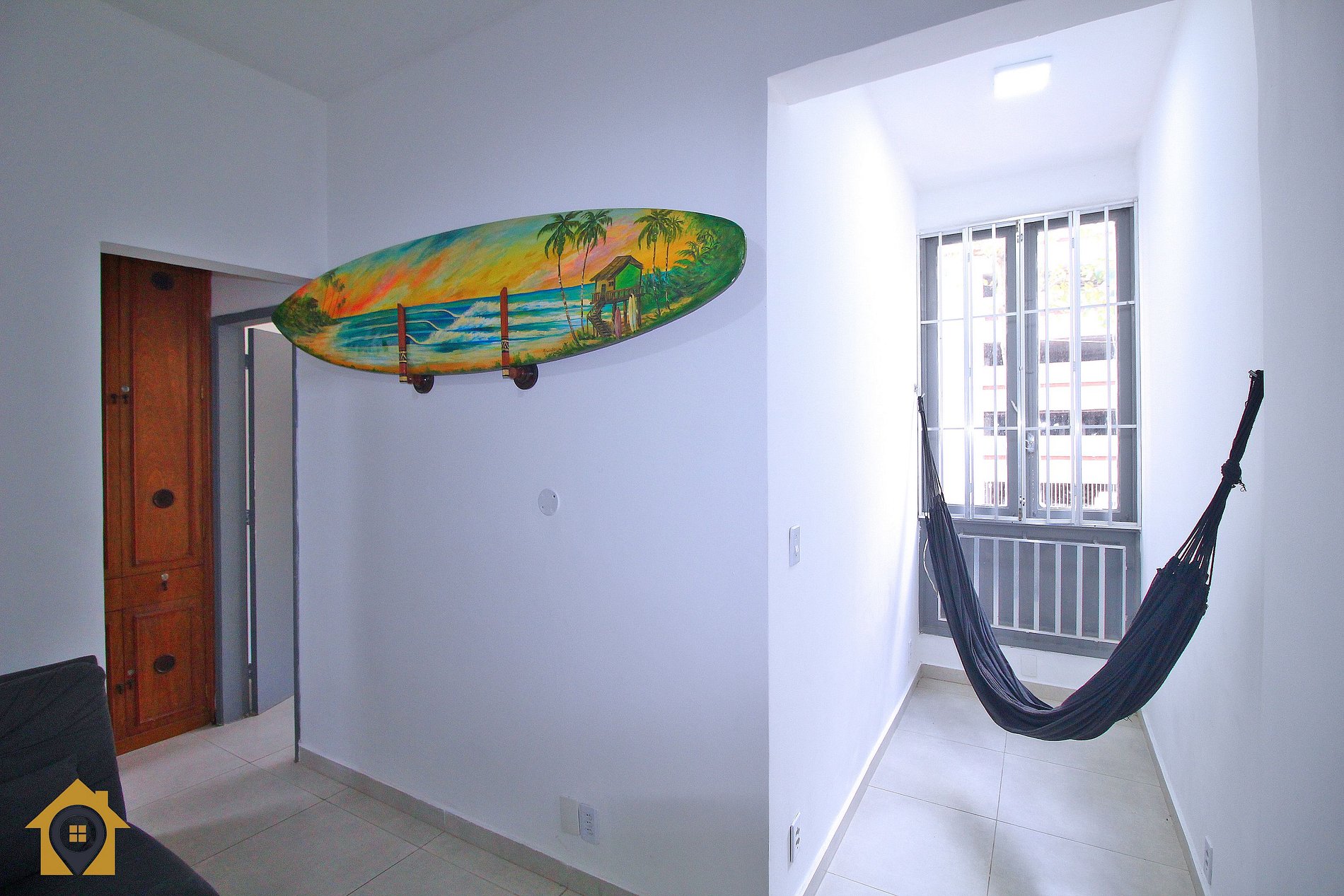 Dividido em sala confortável com sofá cama, ventilador de teto, bancada com três cadeiras, TV Smart 43" e rede de descanso.