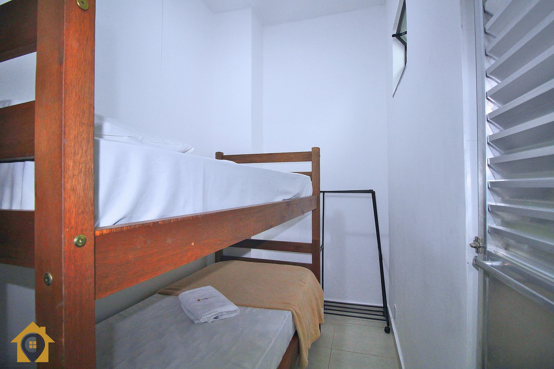 Quarto principal com cama de casal, ar-condicionado, ventilador de teto, mesa com cadeira para trabalho/estudo e cortina blackout. Quarto menor com beliche e pequeno banheiro.