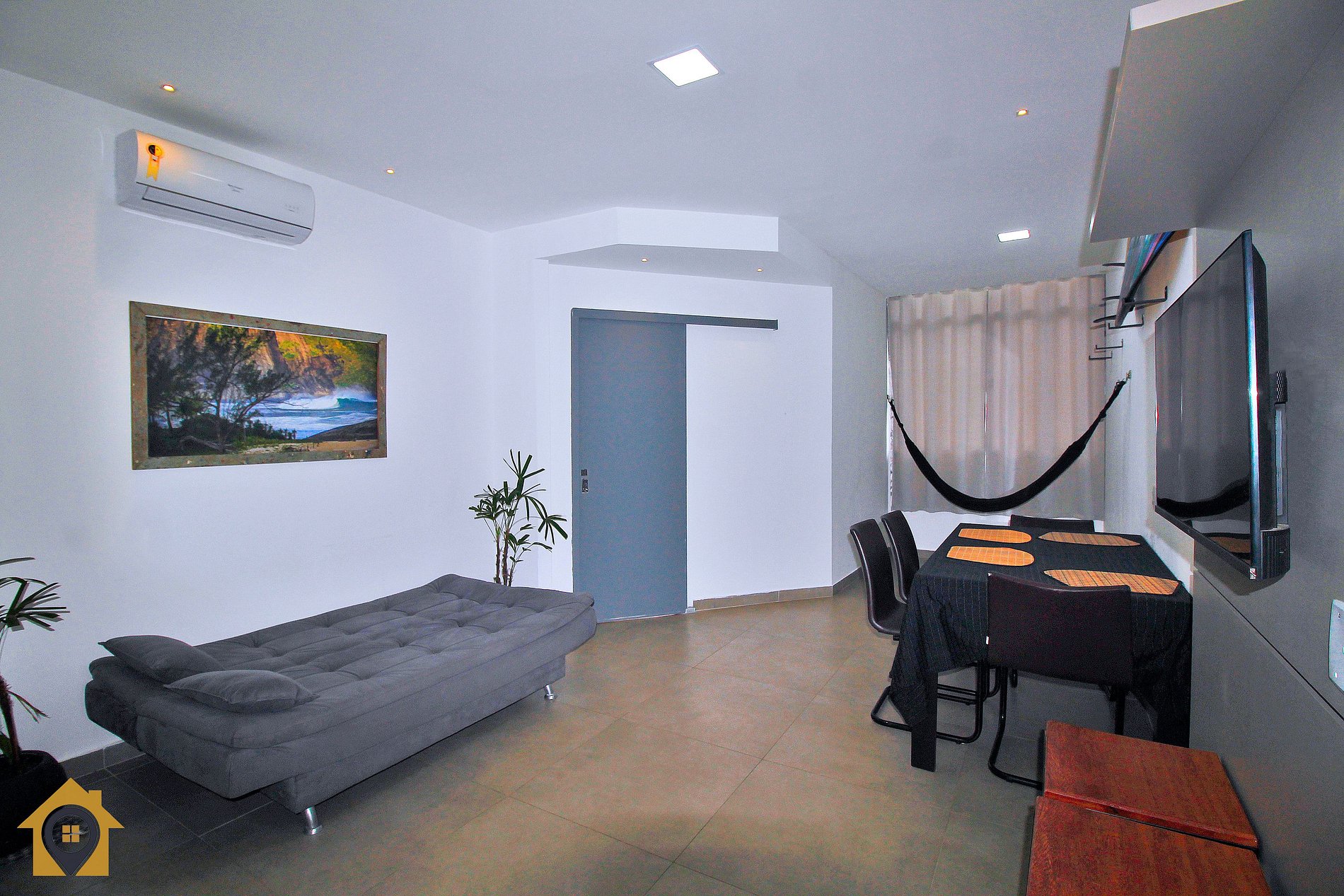 Dividido em sala confortável com sofá cama, mesa com quatro cadeiras, bancada com três cadeiras, TV Smart 43" e rede de descanso. Banheiro moderno com espelho amplo e água quente.