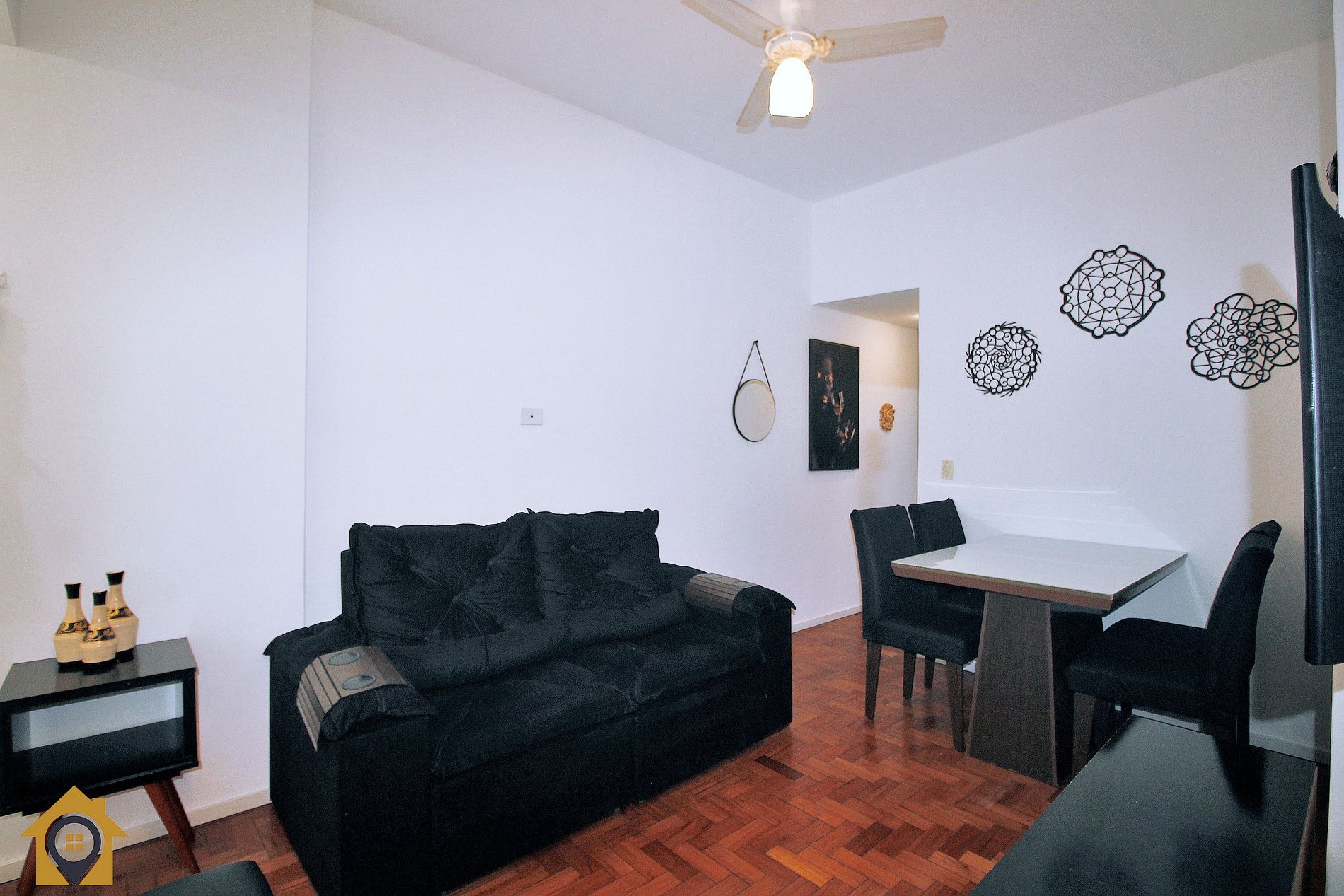 Na Sala temos: Sofá Retrátil, ventilador de teto, smart tv com canais básicos, mesa com 2 cadeiras e varanda integrada com rede.