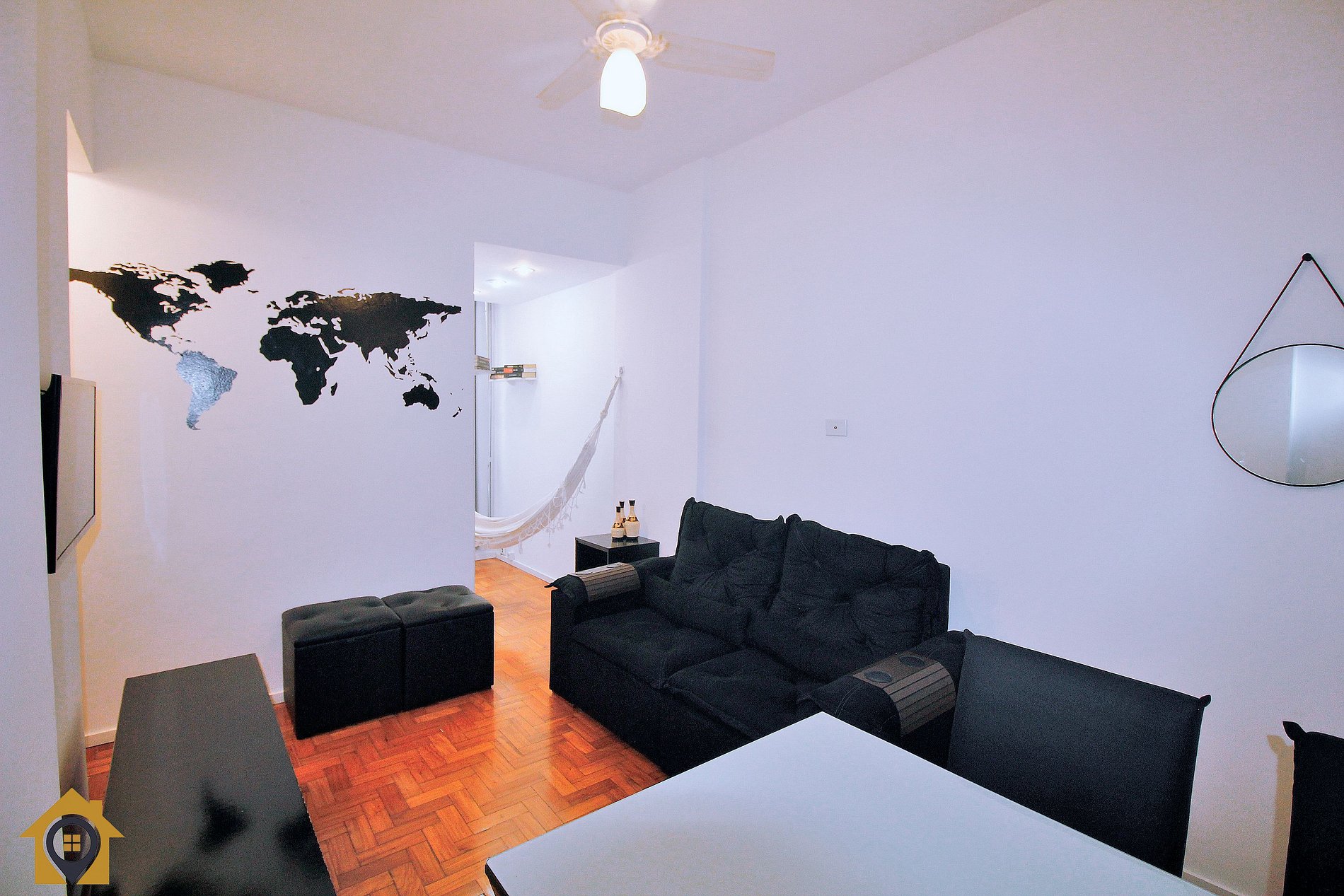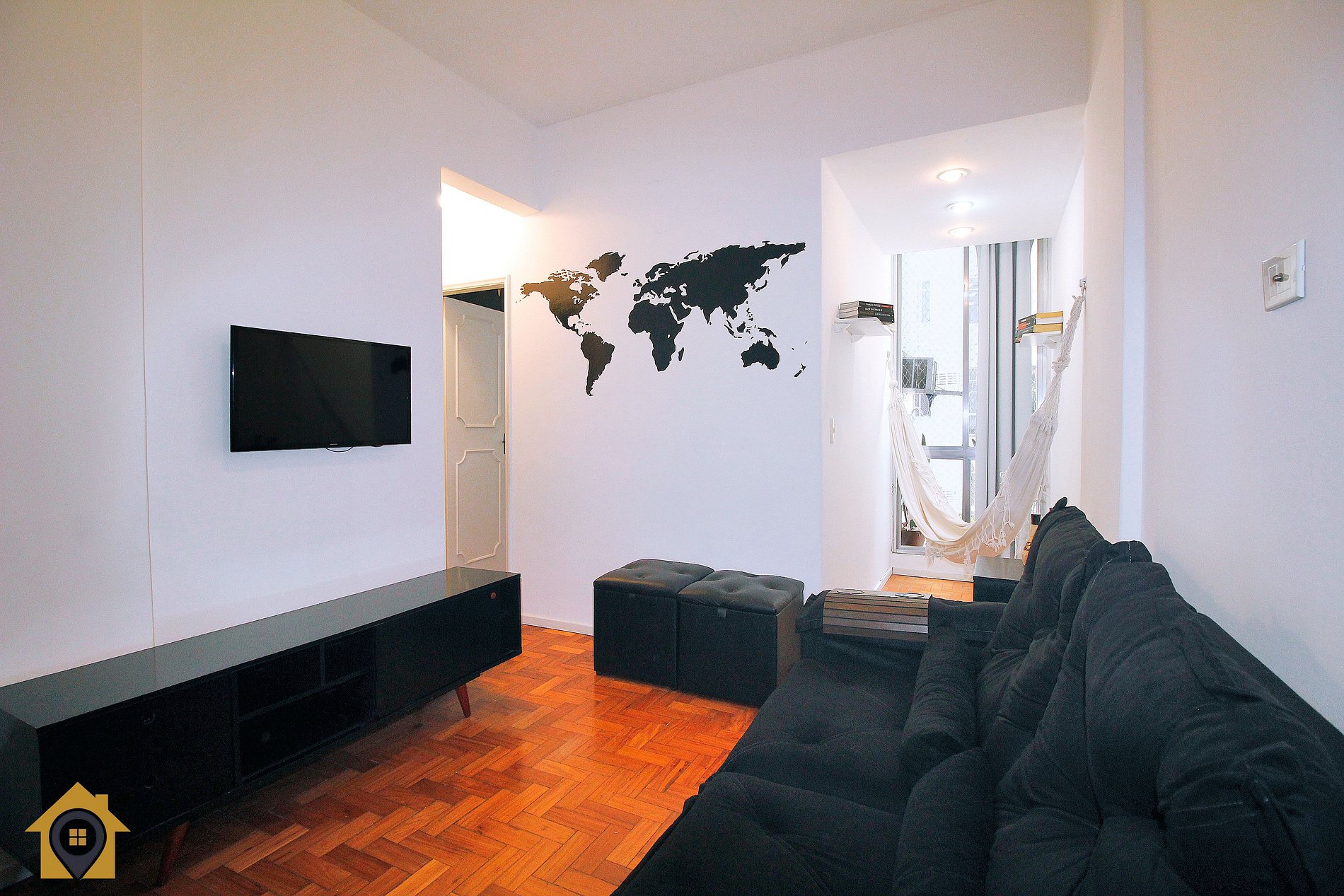 O Apartamento de 50m² dividido em Sala, 2 quartos, banheiro, cozinha e pequena varanda com Rede para descansar.