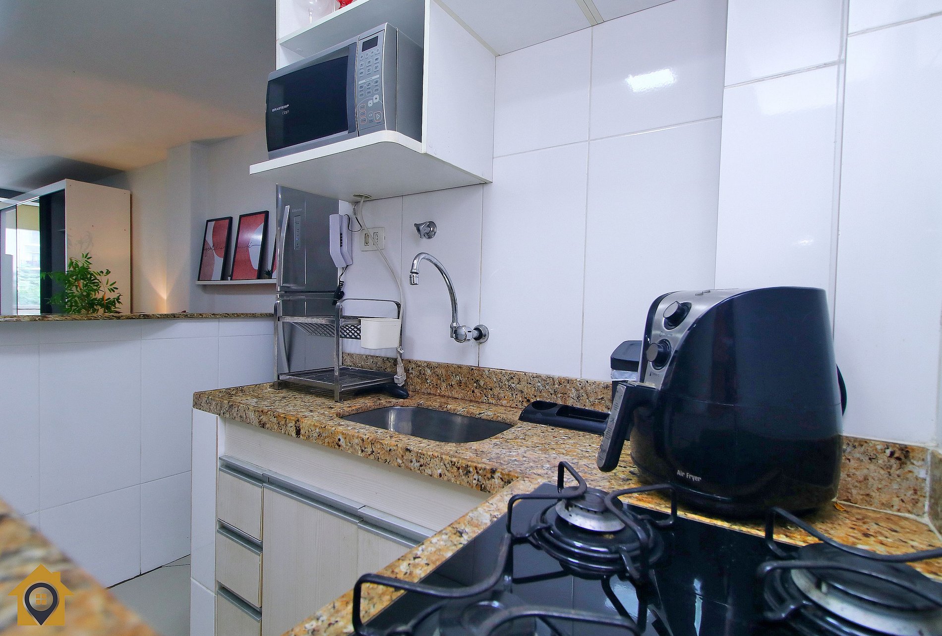 A cozinha é equipada com tudo o que você precisa para preparar suas refeições: micro-ondas, cooktop, airfryer, forno e geladeira garantem que você possa cozinhar com praticidade. Uma mesa com duas cadeiras oferece o espaço ideal para refeições rápidas ou para um jantar romântico.