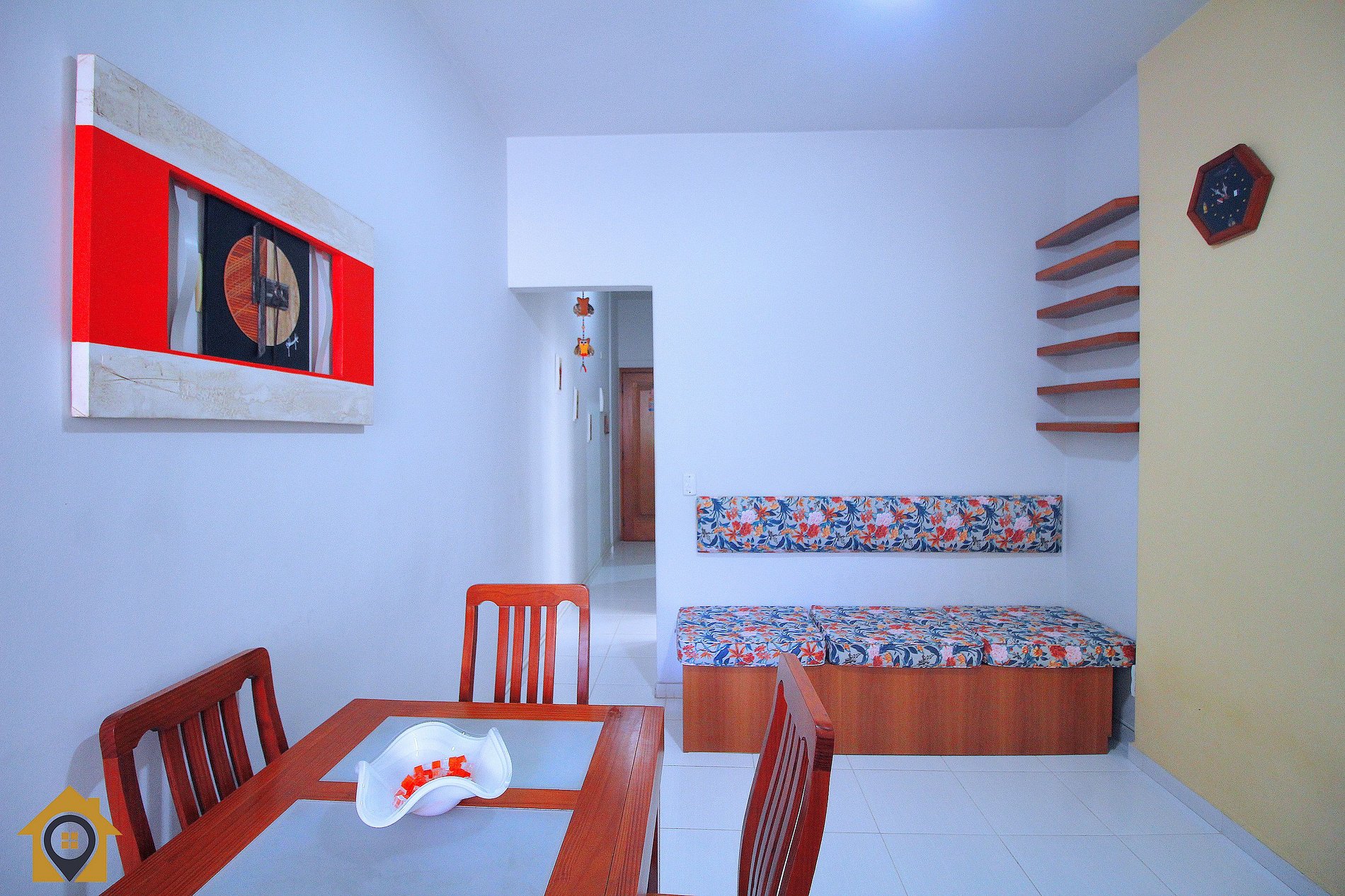 A sala é espaçosa e aconchegante, equipada com uma TV, sofá, ar condicionado, mesa de jantar com 4 cadeiras e uma decoração charmosa que traz um toque de elegância ao ambiente.