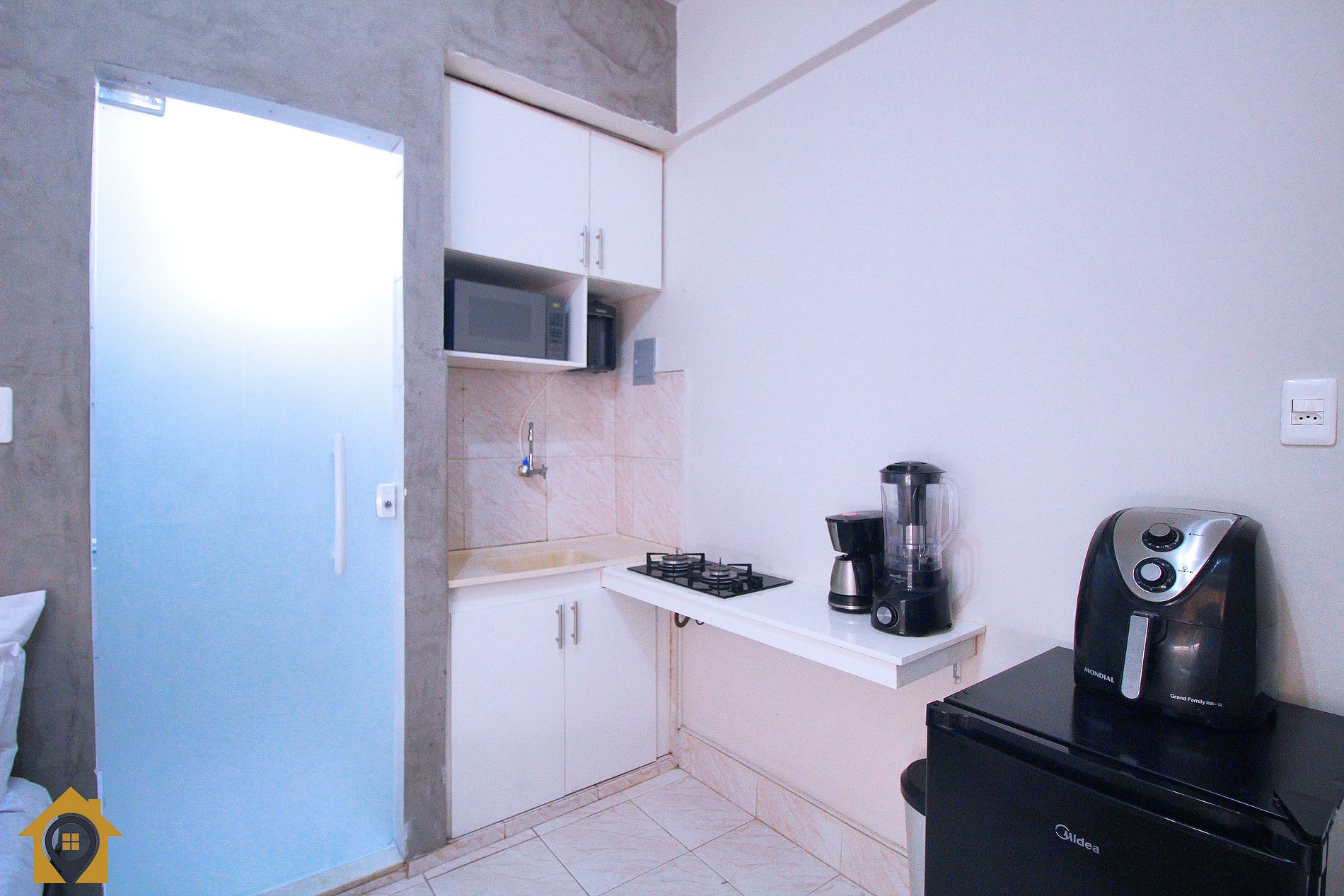 O apartamento é dividido em quarto e banheiro, oferecendo um ambiente funcional e bem equipado para sua estadia. Na área principal, você encontrará uma cozinha compacta com cooktop de 2 bocas, micro-ondas, air fryer, liquidificador, filtro de água e todos os utensílios necessários para preparar suas refeições no dia a dia. Além disso, há uma mesa com 3 cadeiras, proporcionando um espaço agradável tanto para suas refeições quanto para trabalhar ou relaxar.