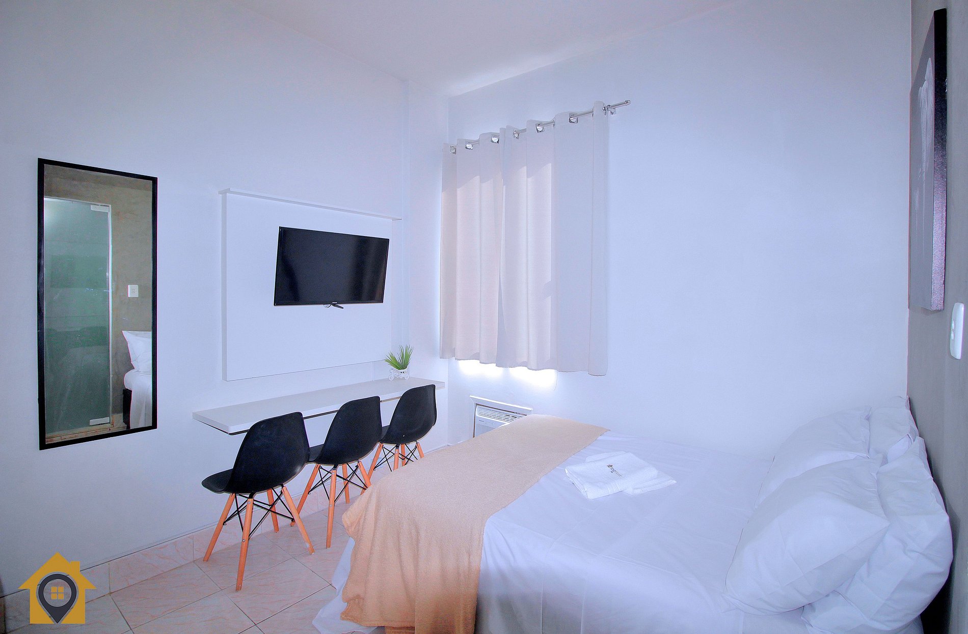 O apartamento é dividido em quarto e banheiro, oferecendo um ambiente funcional e bem equipado para sua estadia. Na área principal, você encontrará uma cozinha compacta com cooktop de 2 bocas, micro-ondas, air fryer, liquidificador, filtro de água e todos os utensílios necessários para preparar suas refeições no dia a dia. Além disso, há uma mesa com 3 cadeiras, proporcionando um espaço agradável tanto para suas refeições quanto para trabalhar ou relaxar.