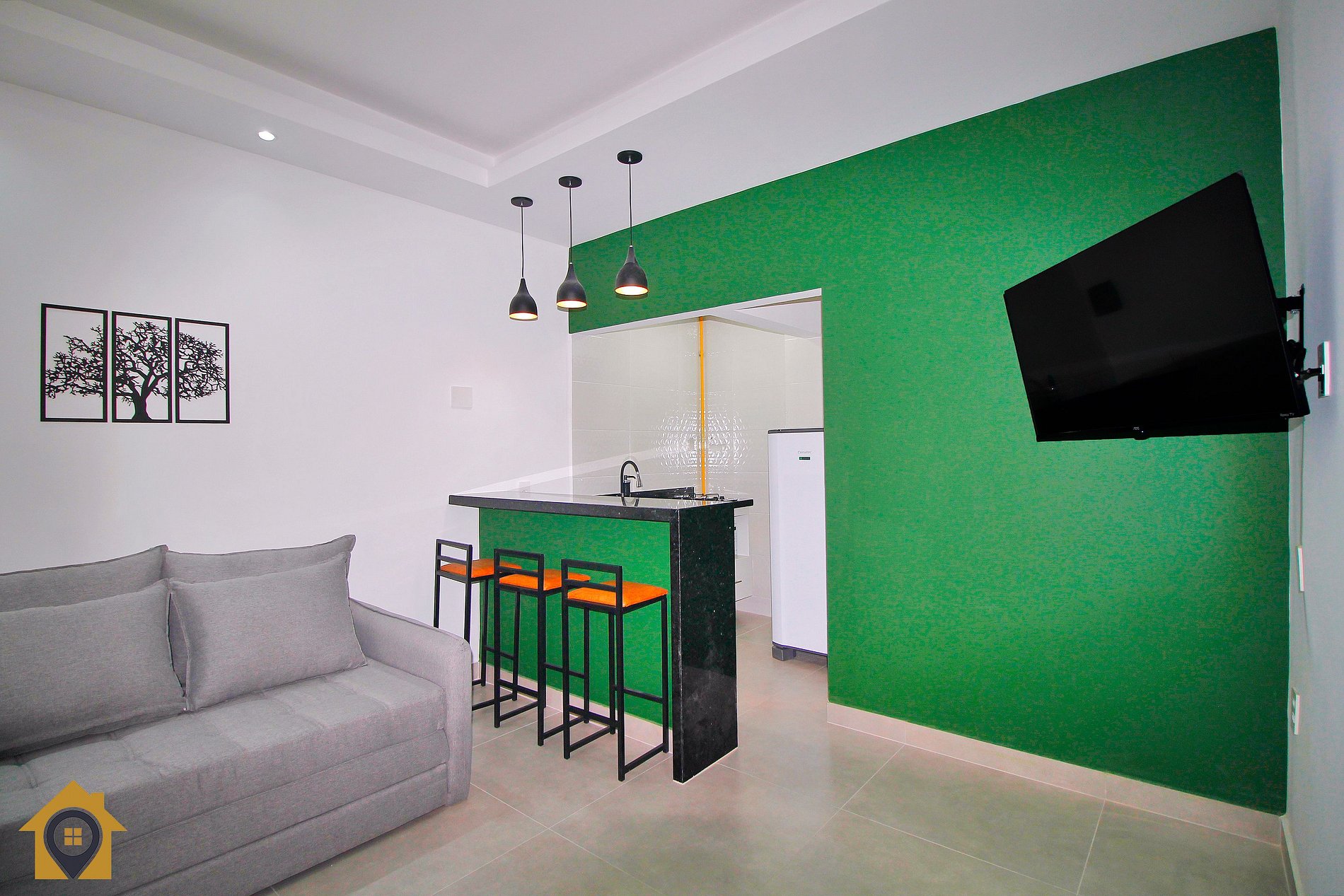 Este studio recém-reformado acomoda até 4 pessoas com conforto e praticidade. O quarto conta com cama de casal com cabeceira, ar-condicionado, armário, sofá-cama e uma TV de 43’’, oferecendo um ambiente aconchegante para descansar após um dia de praia ou passeios.