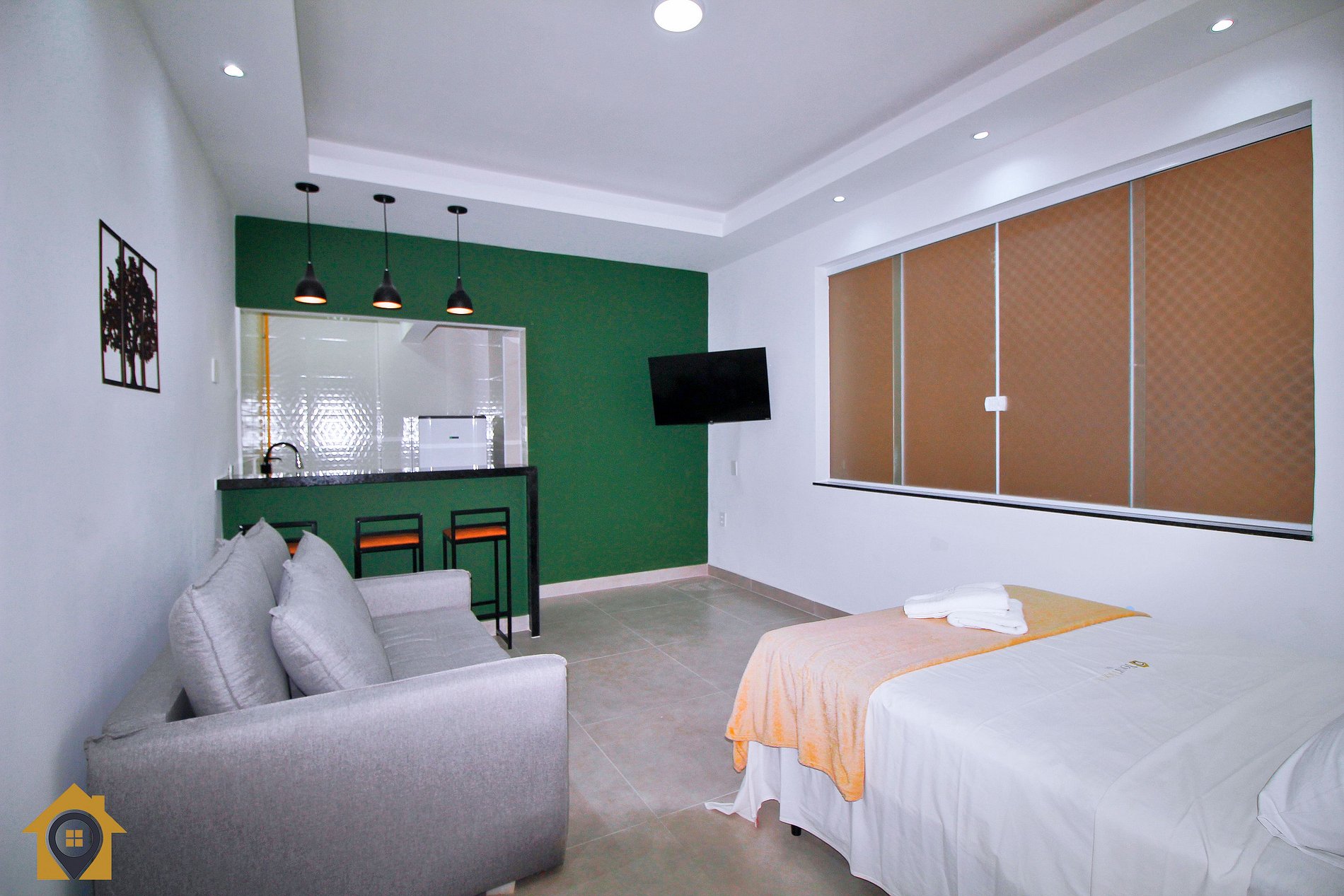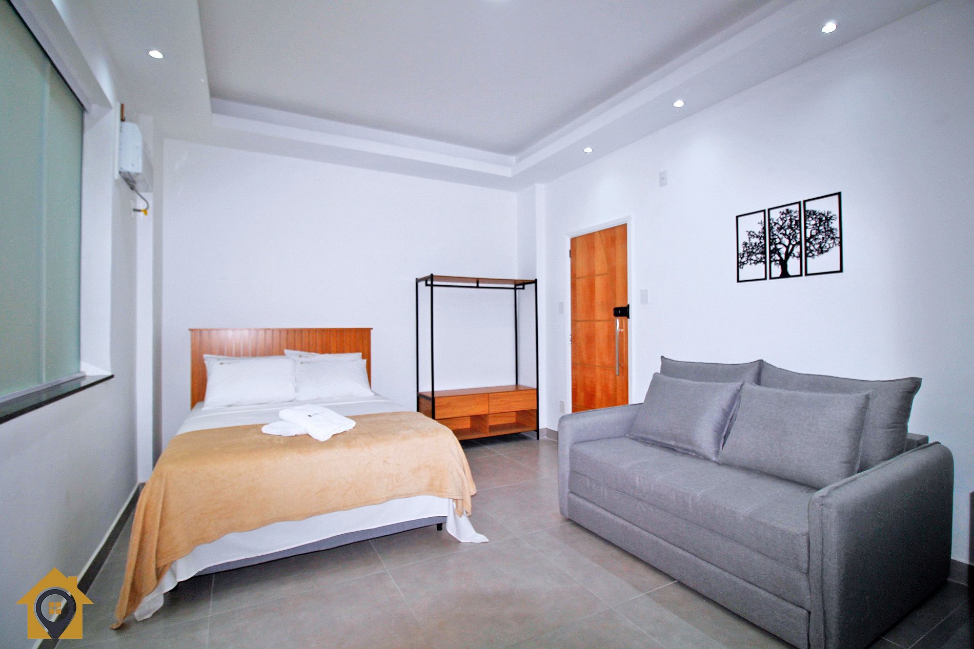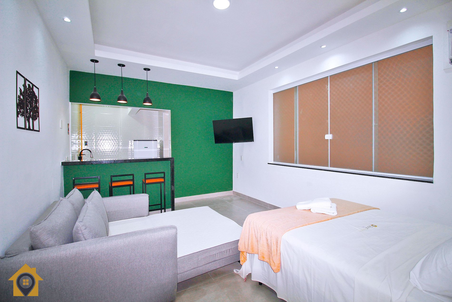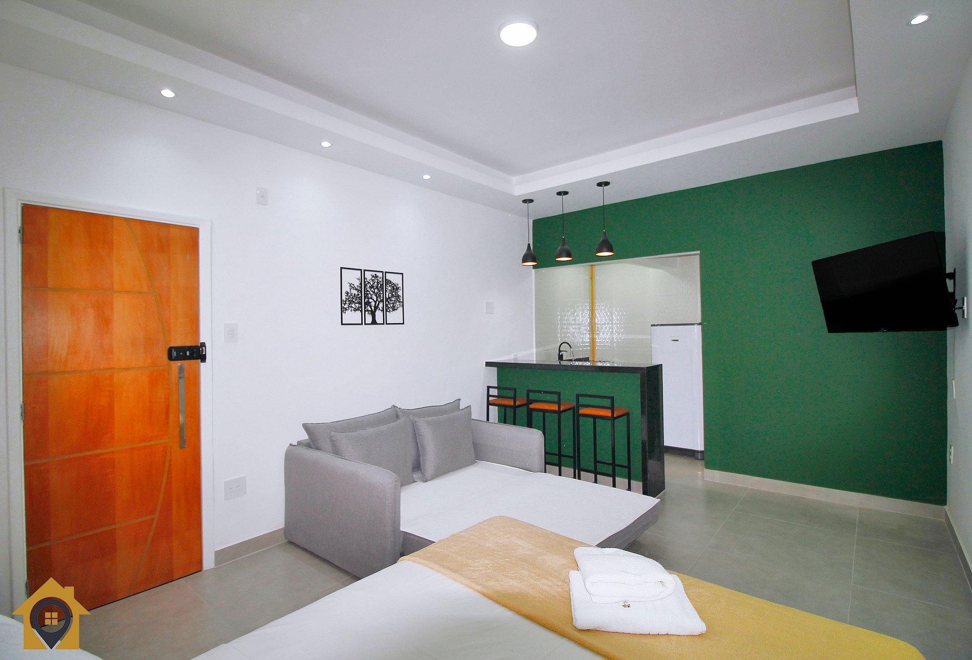 Este studio recém-reformado acomoda até 4 pessoas com conforto e praticidade. O quarto conta com cama de casal com cabeceira, ar-condicionado, armário, sofá-cama e uma TV de 43’’, oferecendo um ambiente aconchegante para descansar após um dia de praia ou passeios.