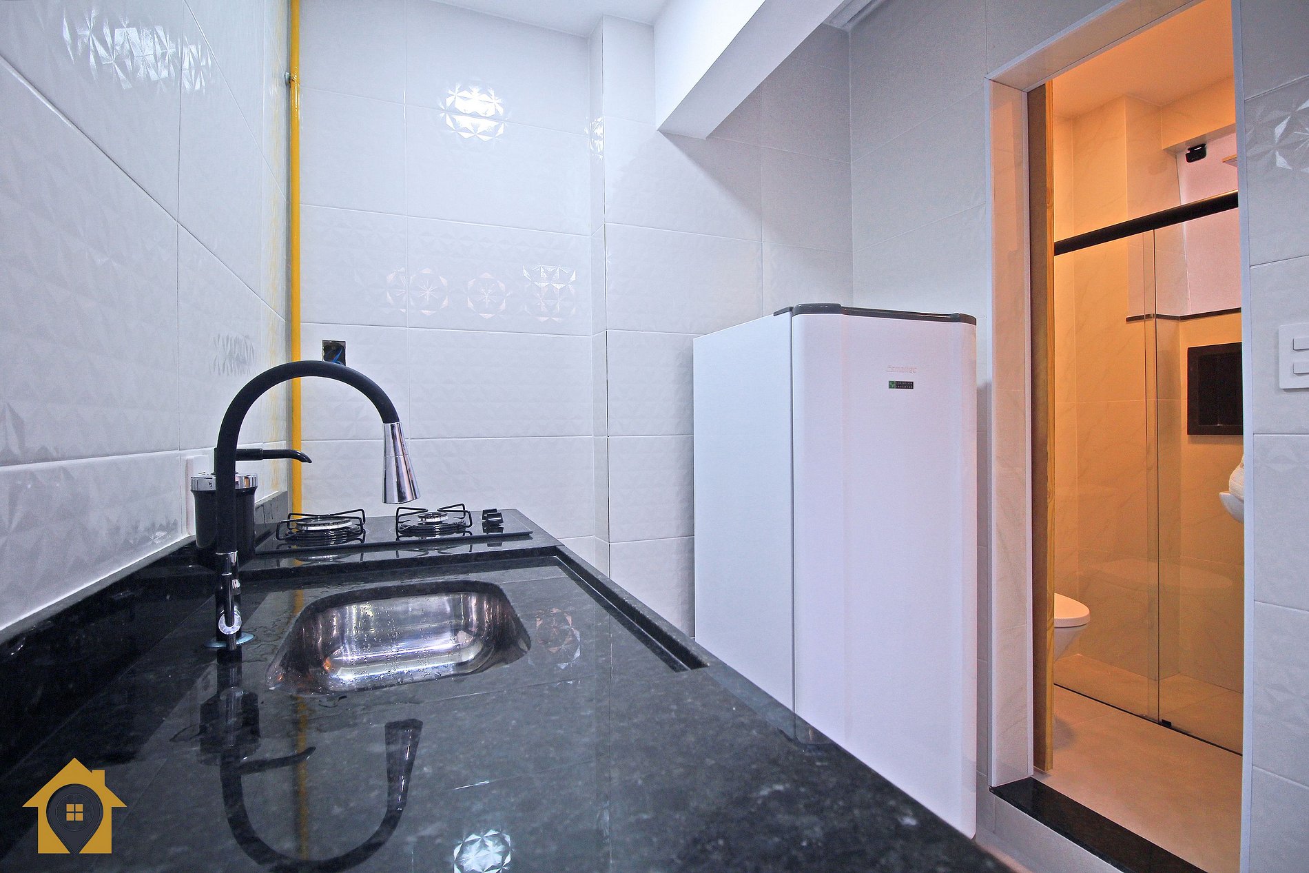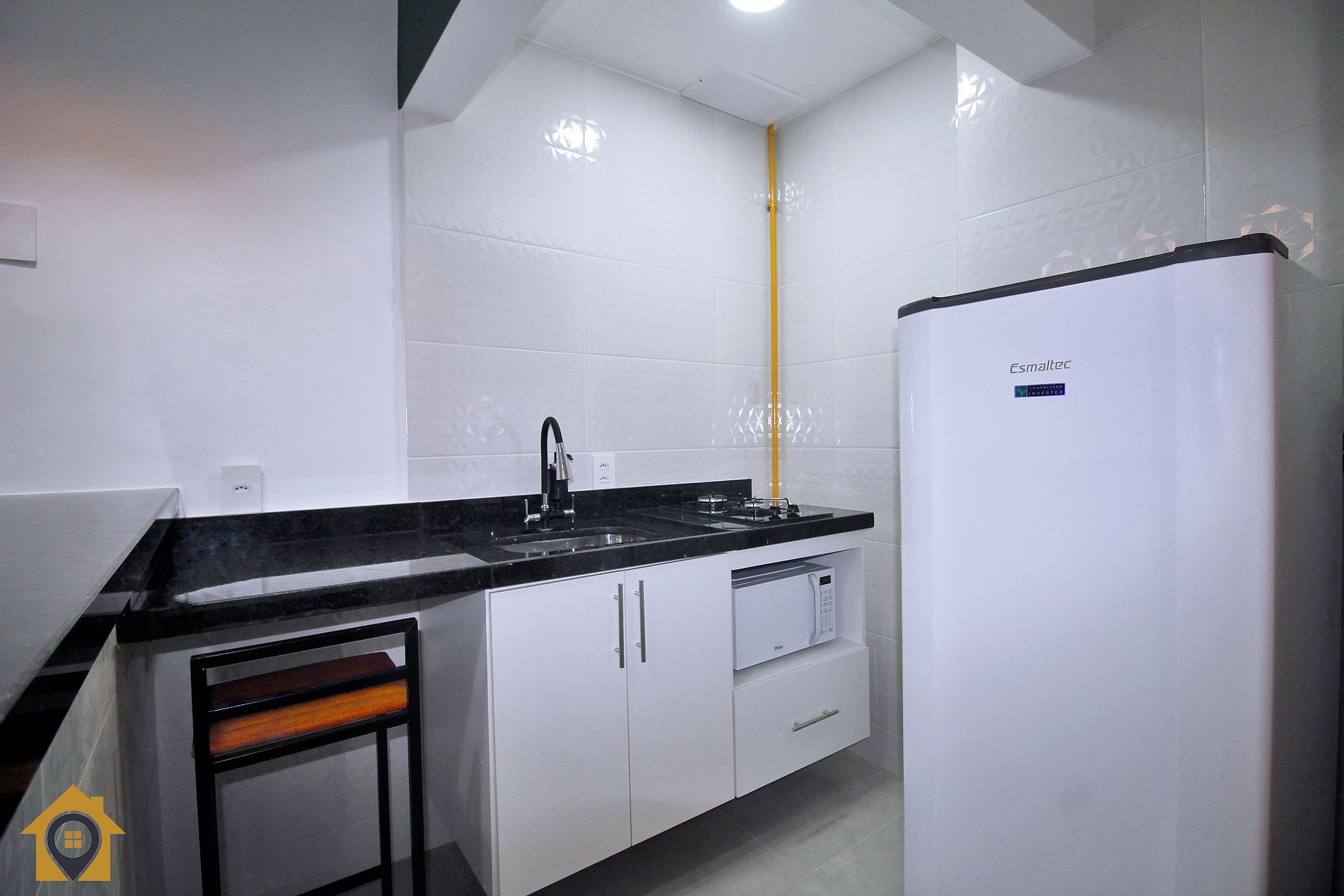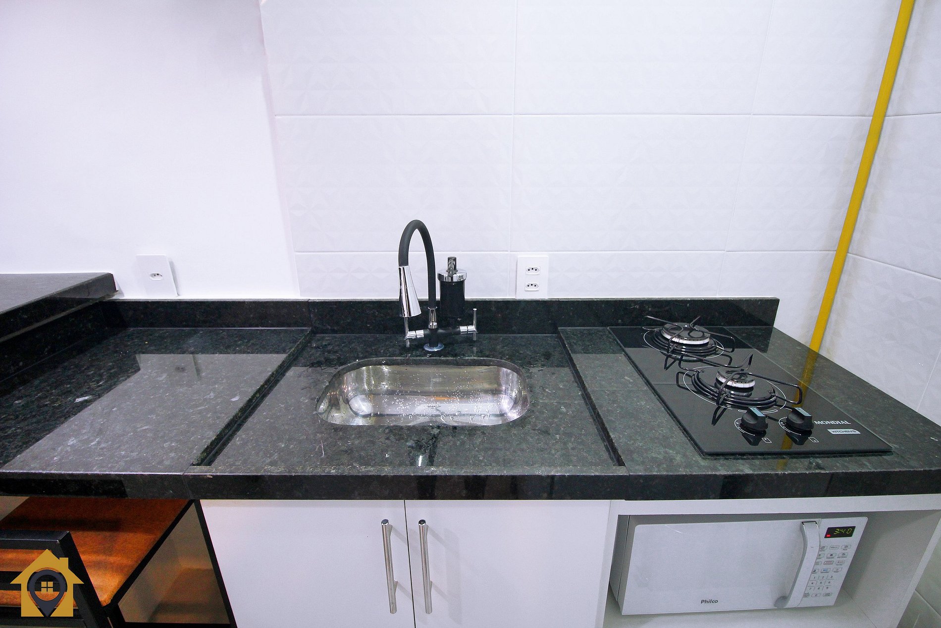 A cozinha é equipada com cooktop de 2 bocas, micro-ondas, geladeira e utensílios para cozinhar, ideal para refeições rápidas ou completas durante a estadia.