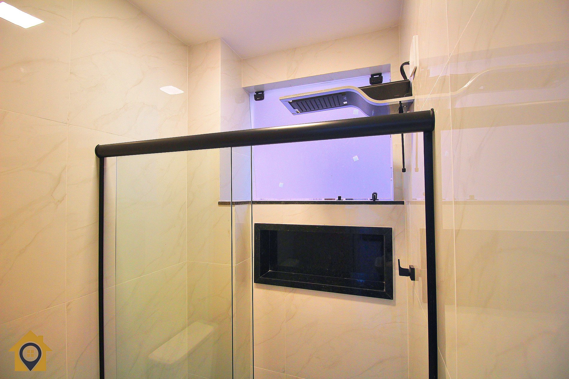 O banheiro possui água quente e estrutura funcional para garantir comodidade aos hóspedes.
