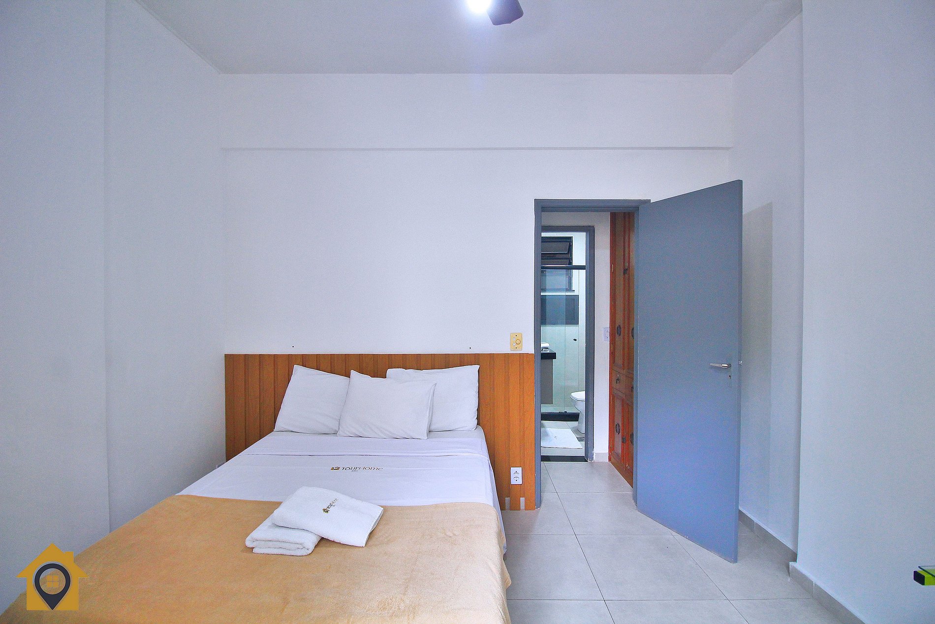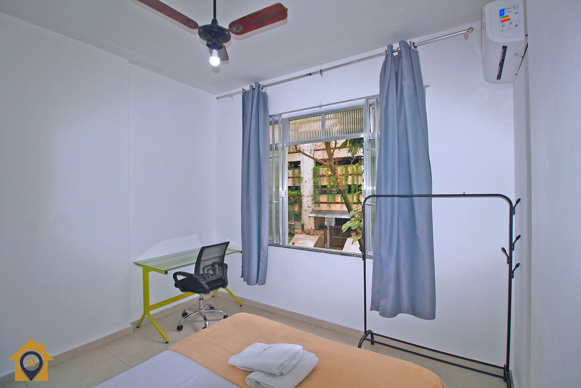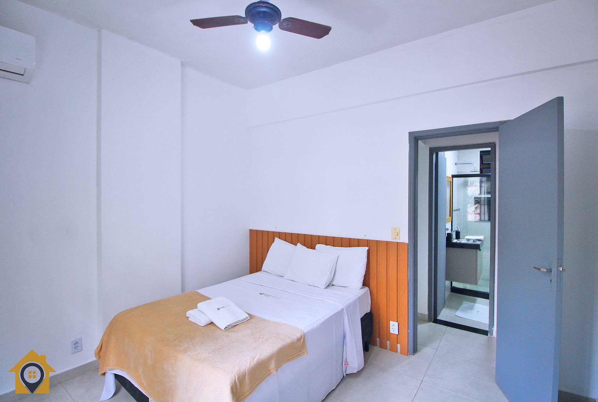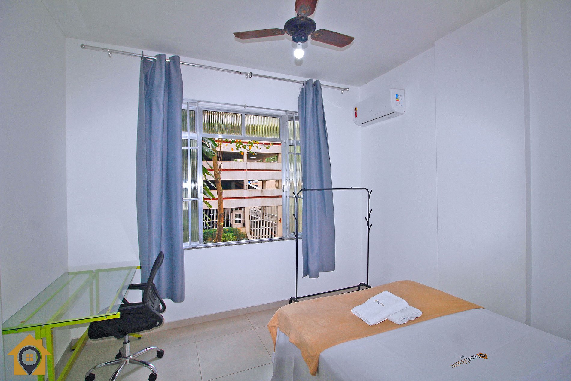 Quarto principal com cama de casal, ar-condicionado, ventilador de teto, mesa com cadeira para trabalho/estudo e cortina blackout. Quarto menor com beliche e pequeno banheiro.