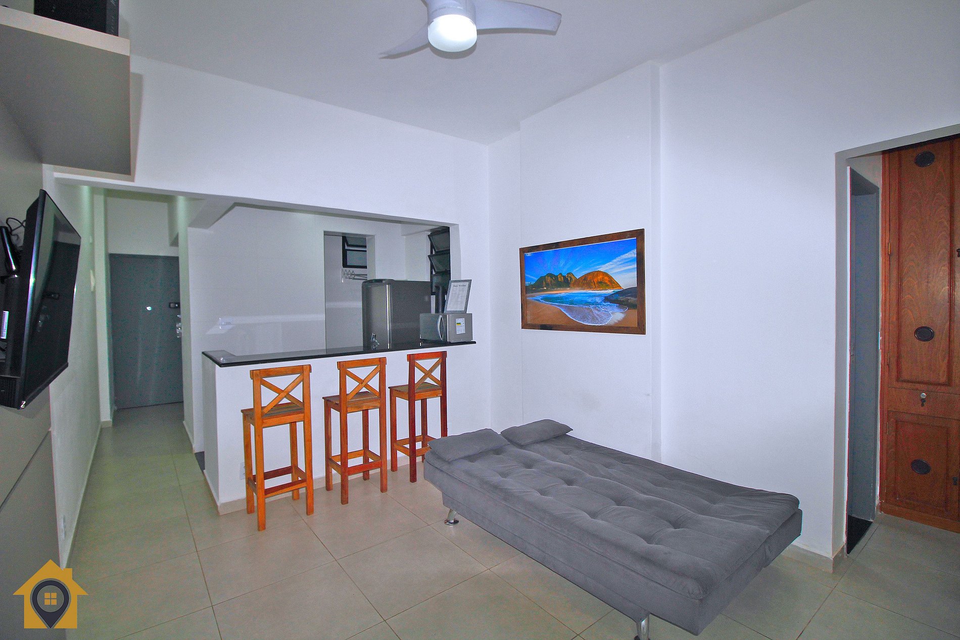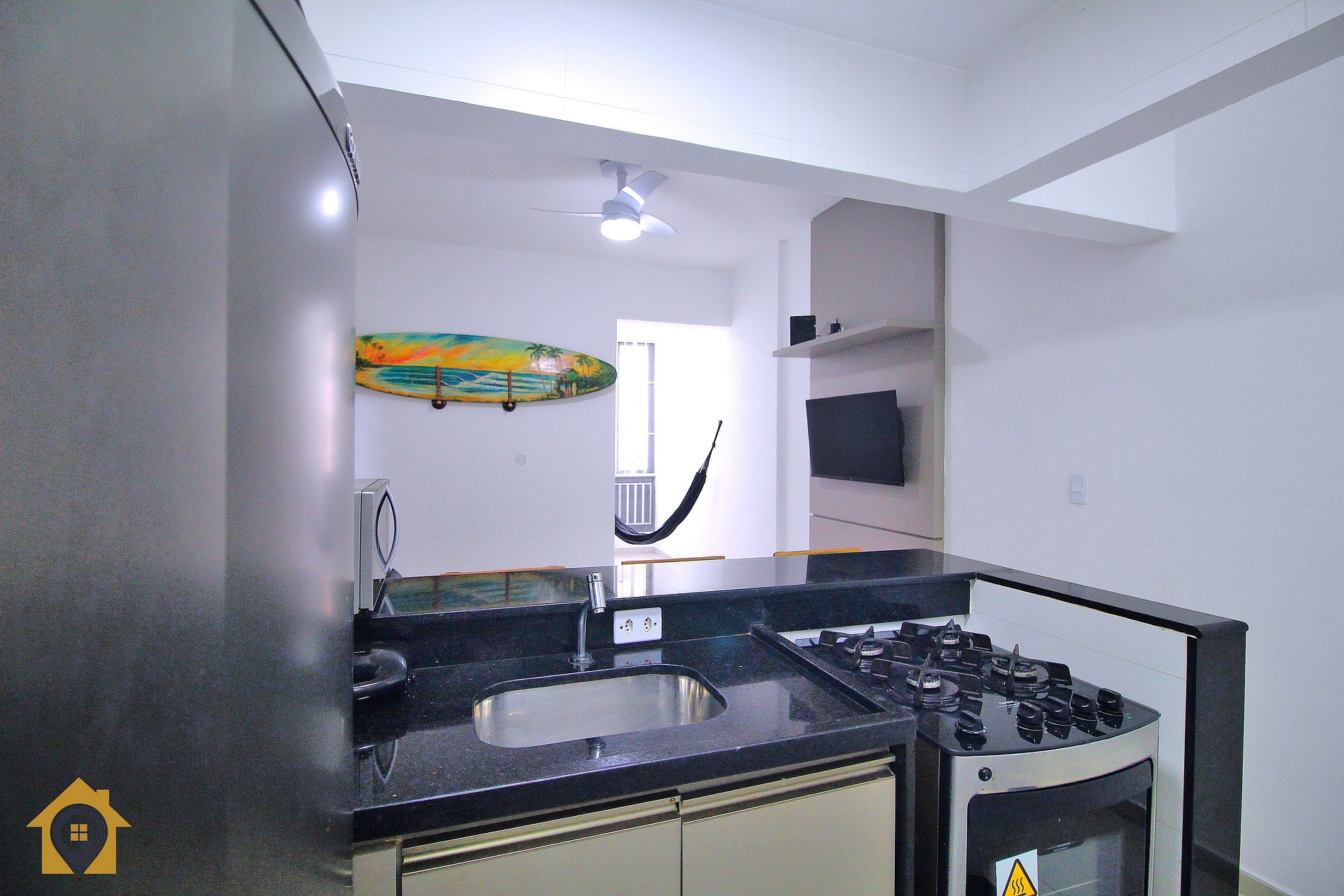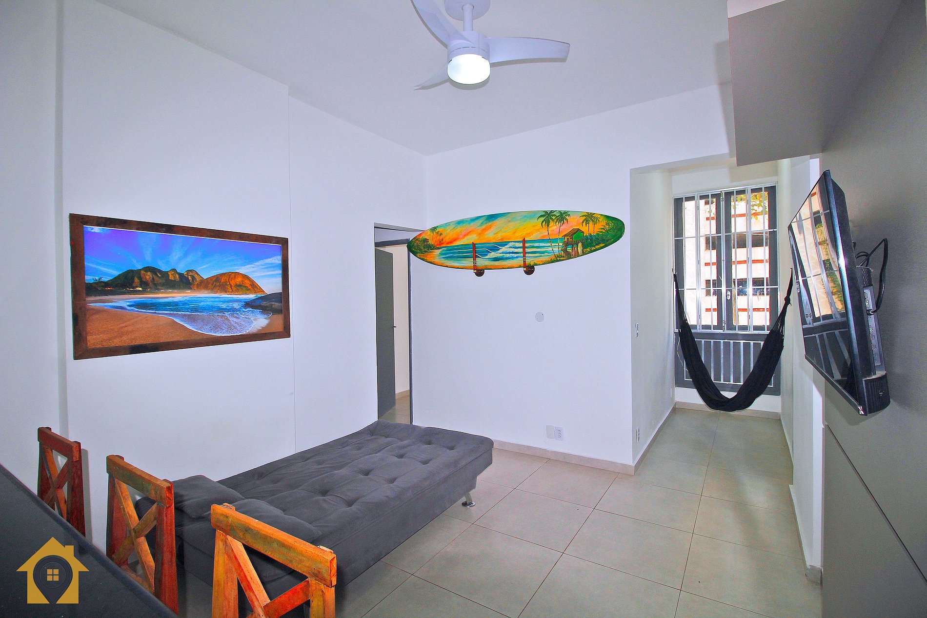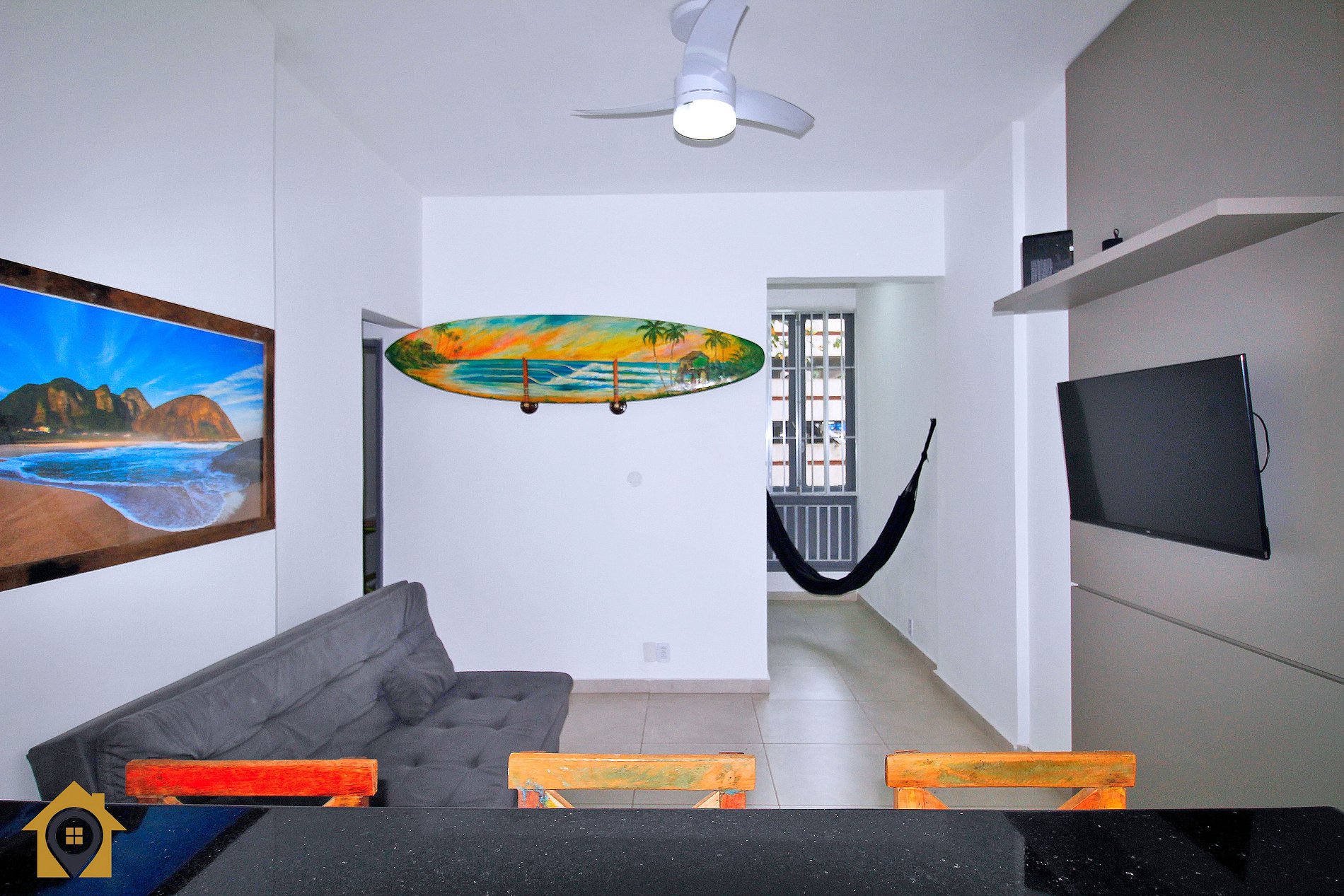 Dividido em sala confortável com sofá cama, ventilador de teto, bancada com três cadeiras, TV Smart 43" e rede de descanso.