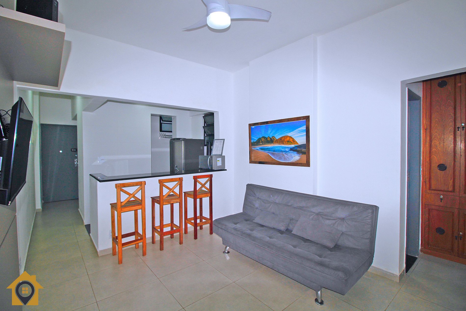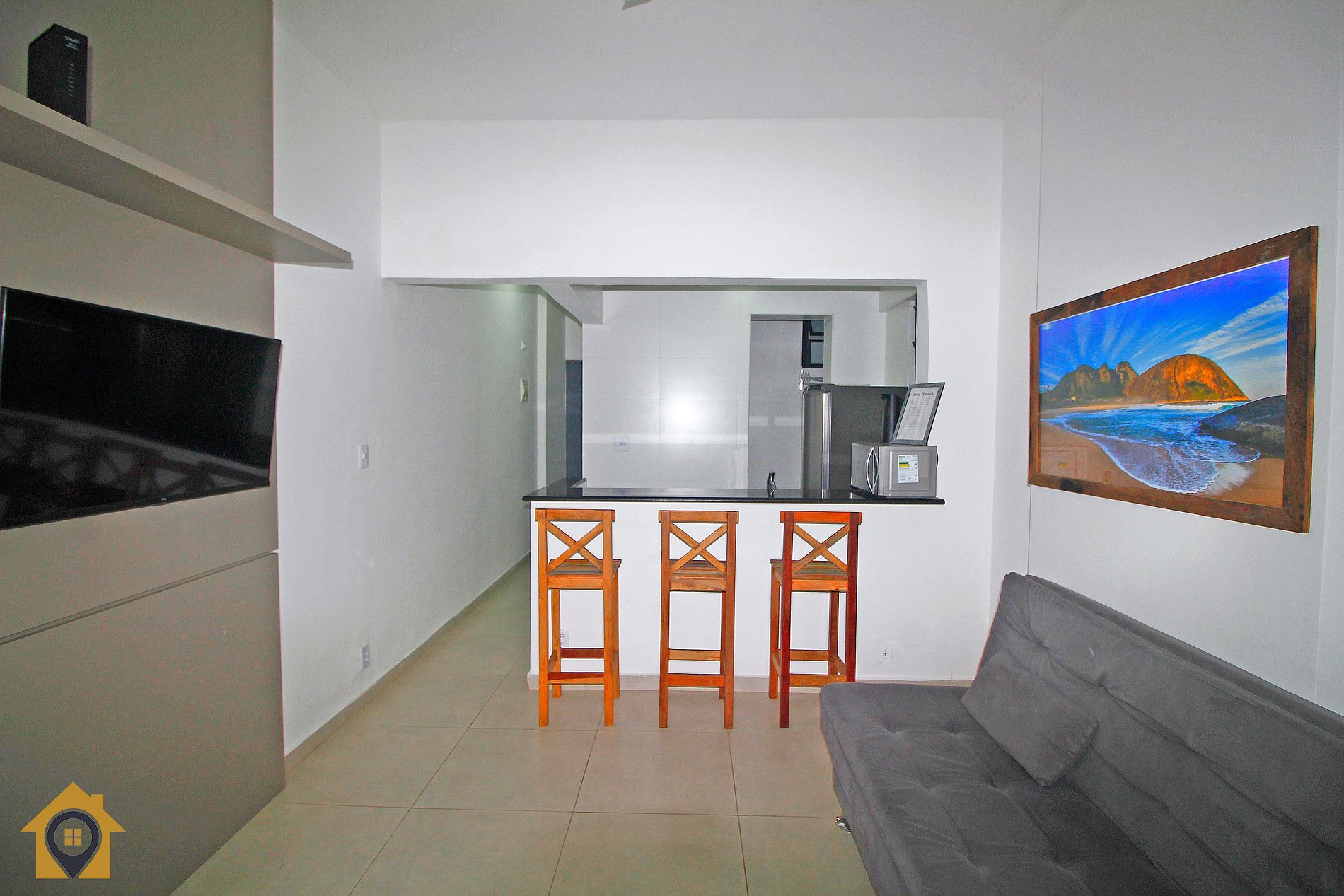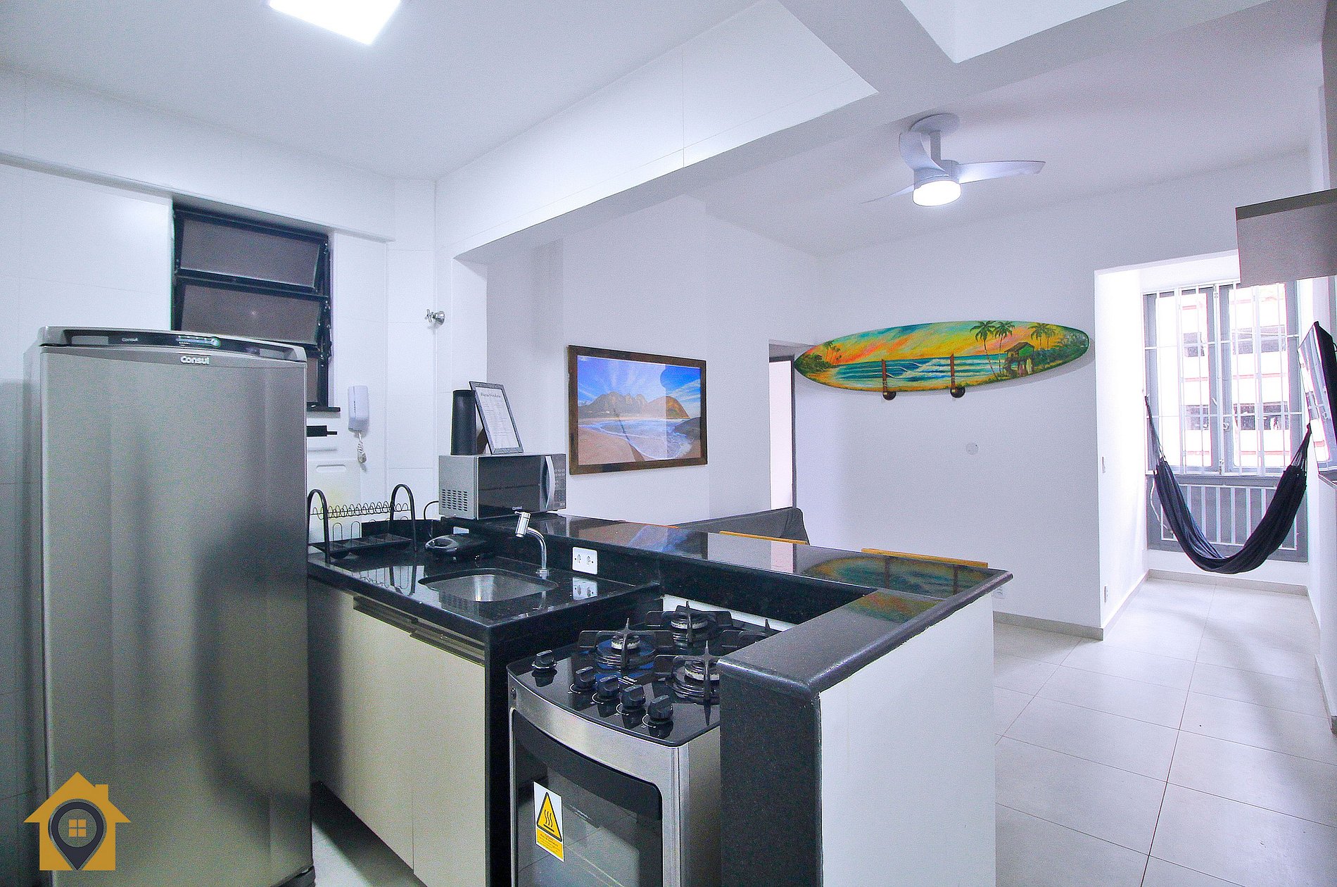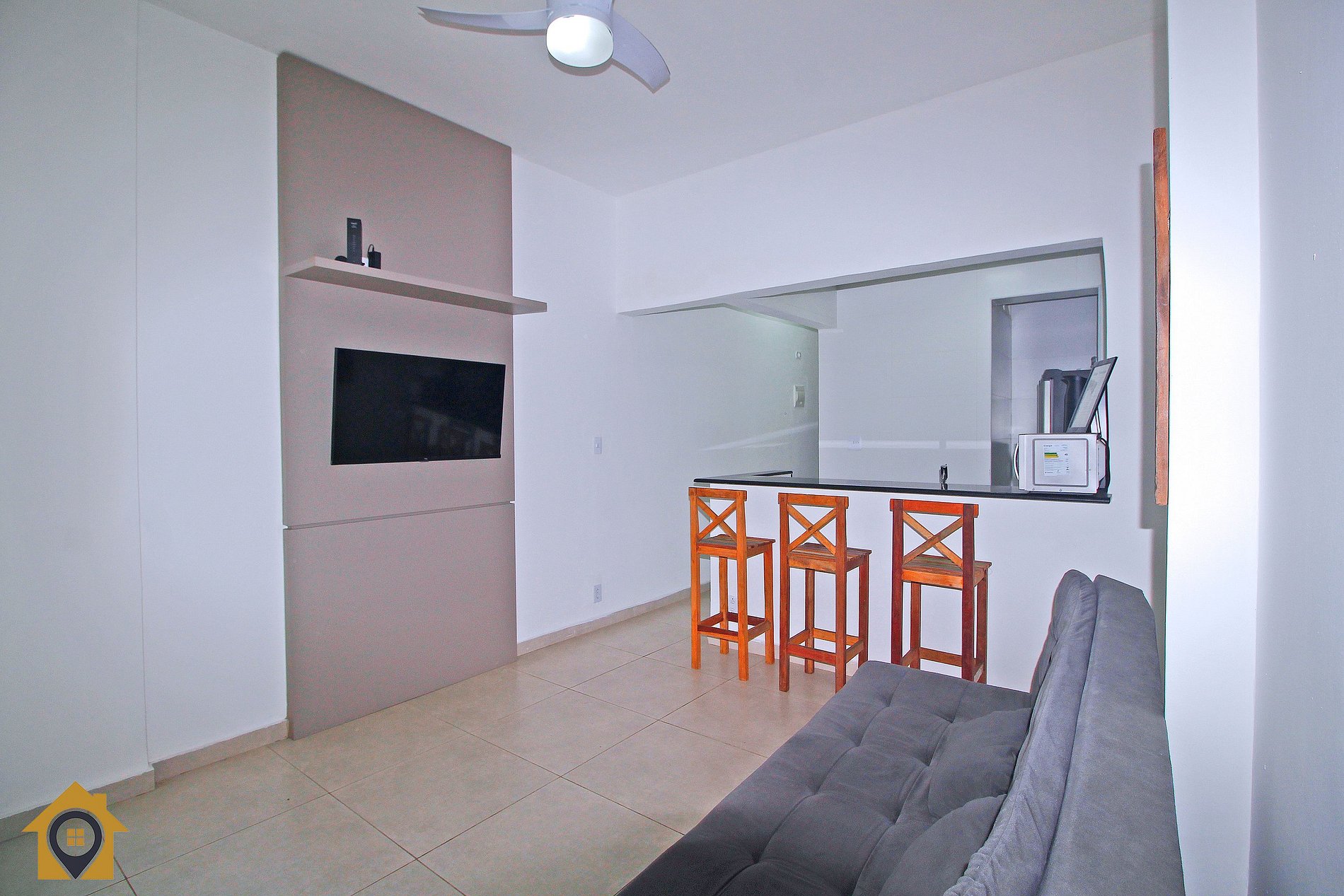 Dividido em sala confortável com sofá cama, ventilador de teto, bancada com três cadeiras, TV Smart 43" e rede de descanso.