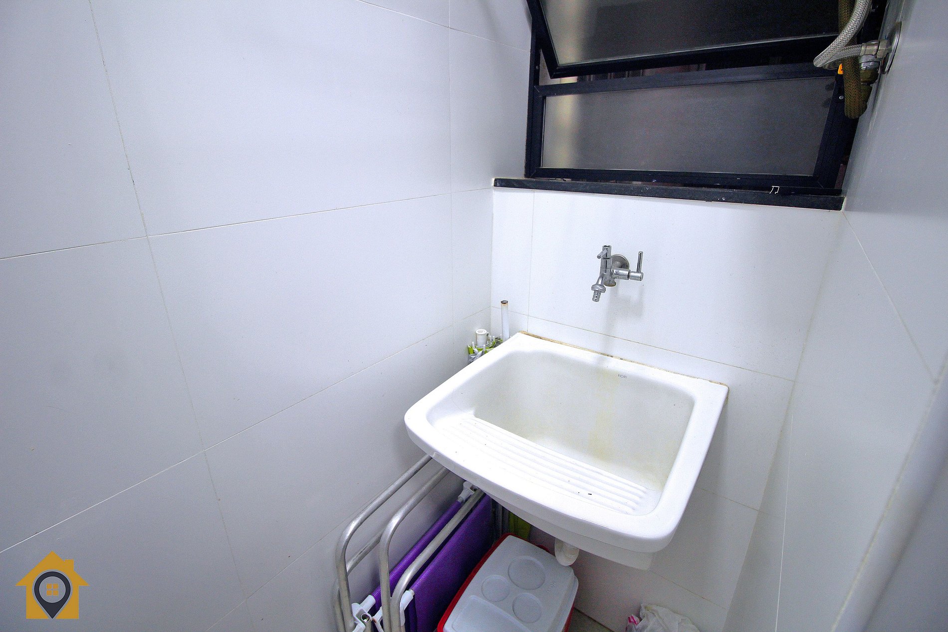Cozinha moderna e completa, equipada com fogão 4 bocas, geladeira, micro-ondas, sanduicheira e utensílios para cozinhar, integrada a uma pequena área de serviço com tanque. Banheiro moderno com espelho amplo e água quente.