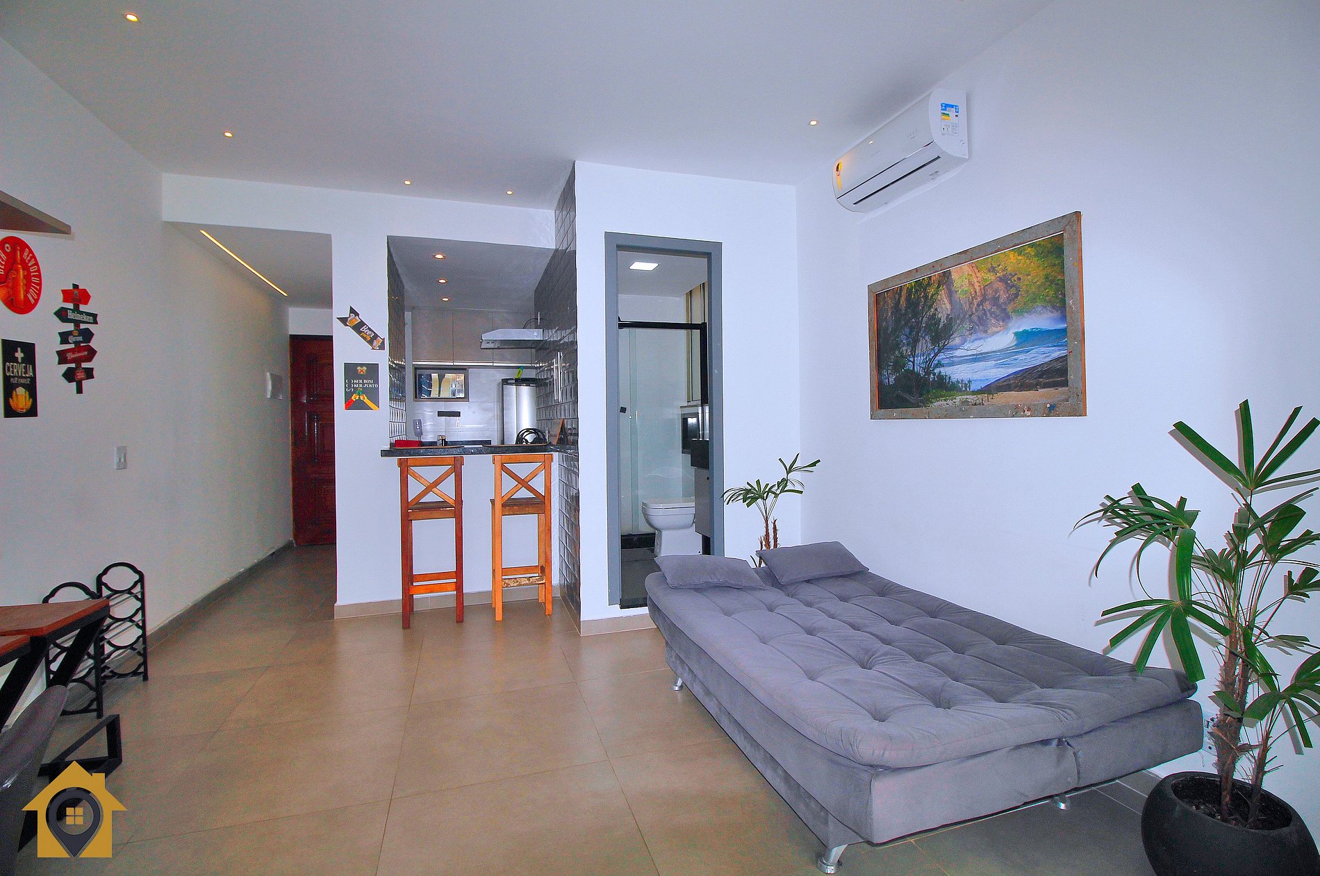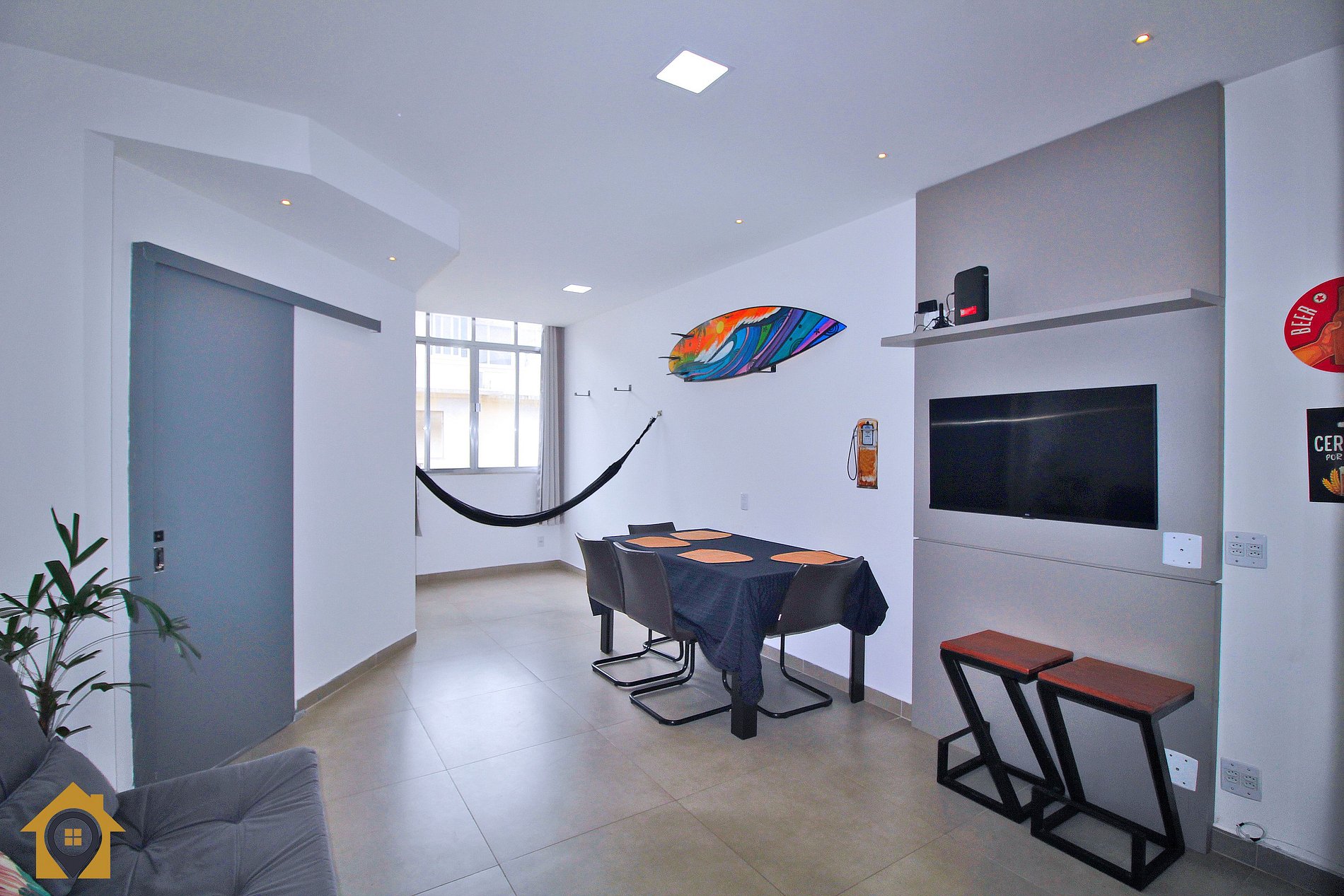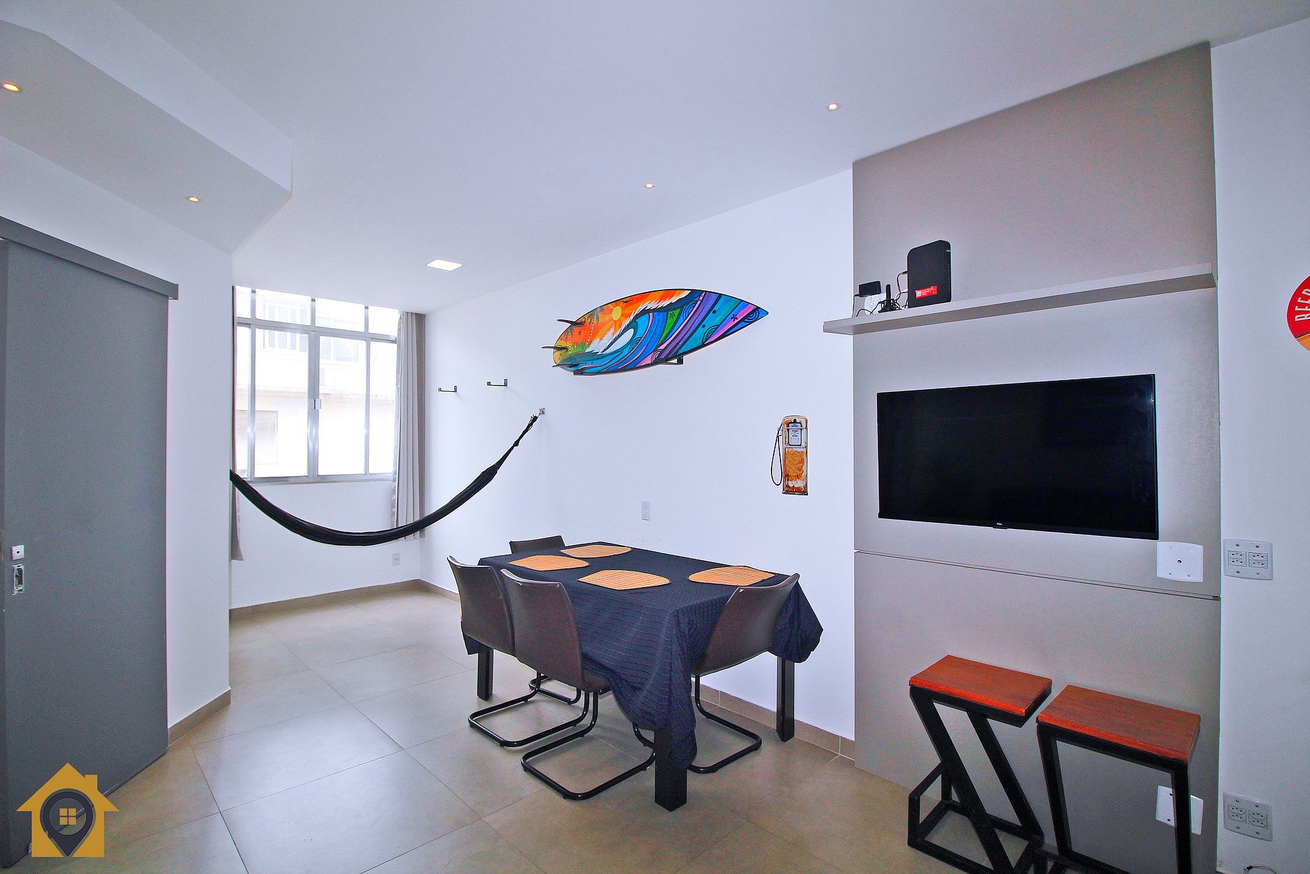 Dividido em sala confortável com sofá cama, mesa com quatro cadeiras, bancada com três cadeiras, TV Smart 43" e rede de descanso. Banheiro moderno com espelho amplo e água quente.