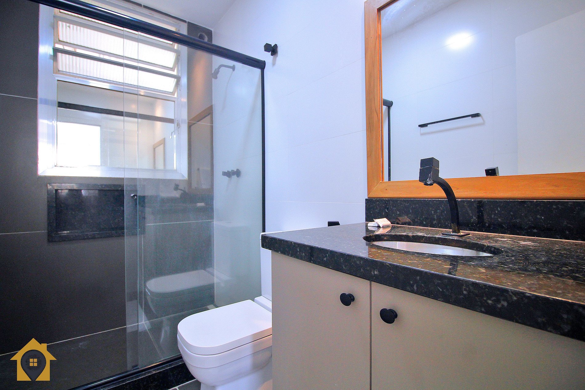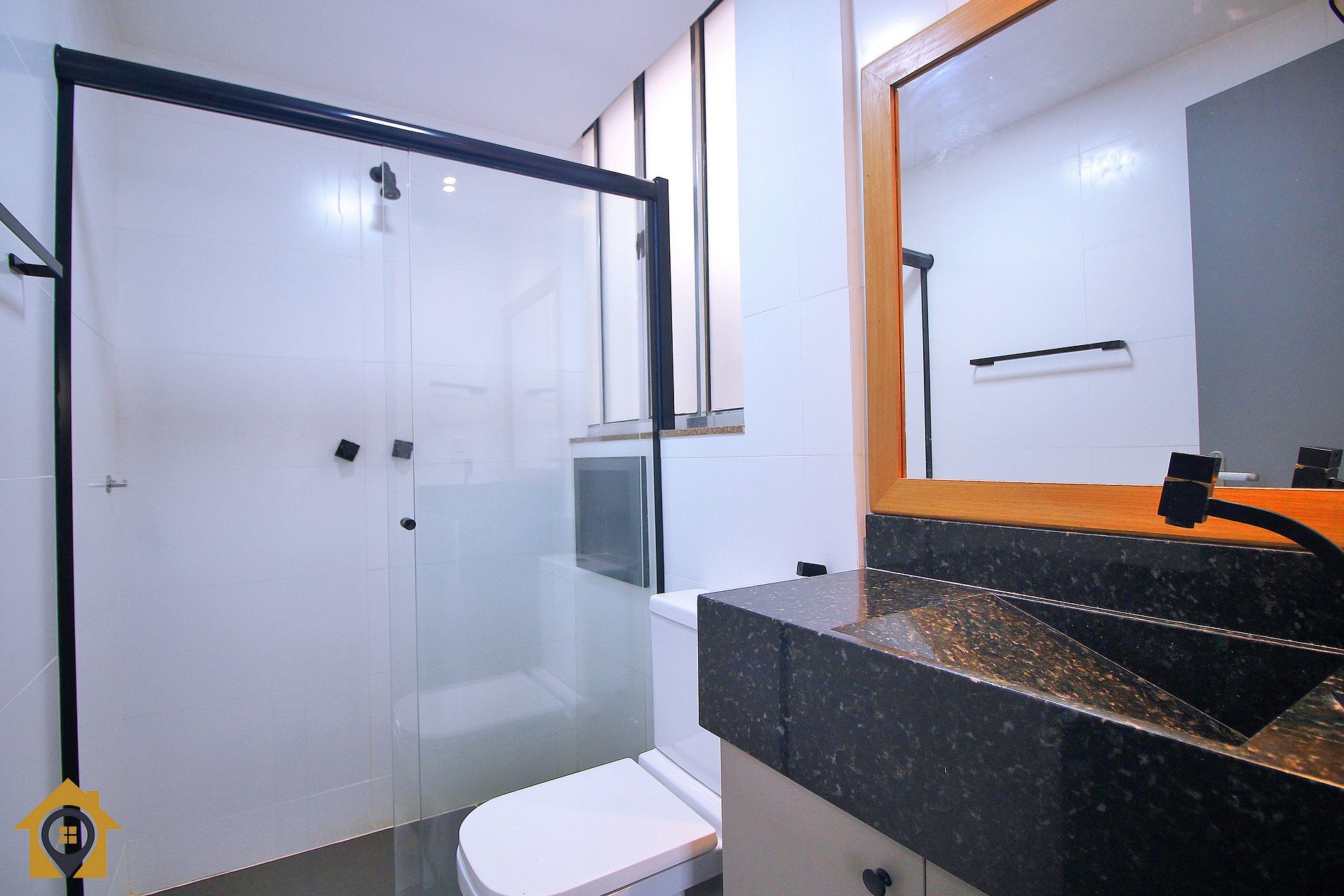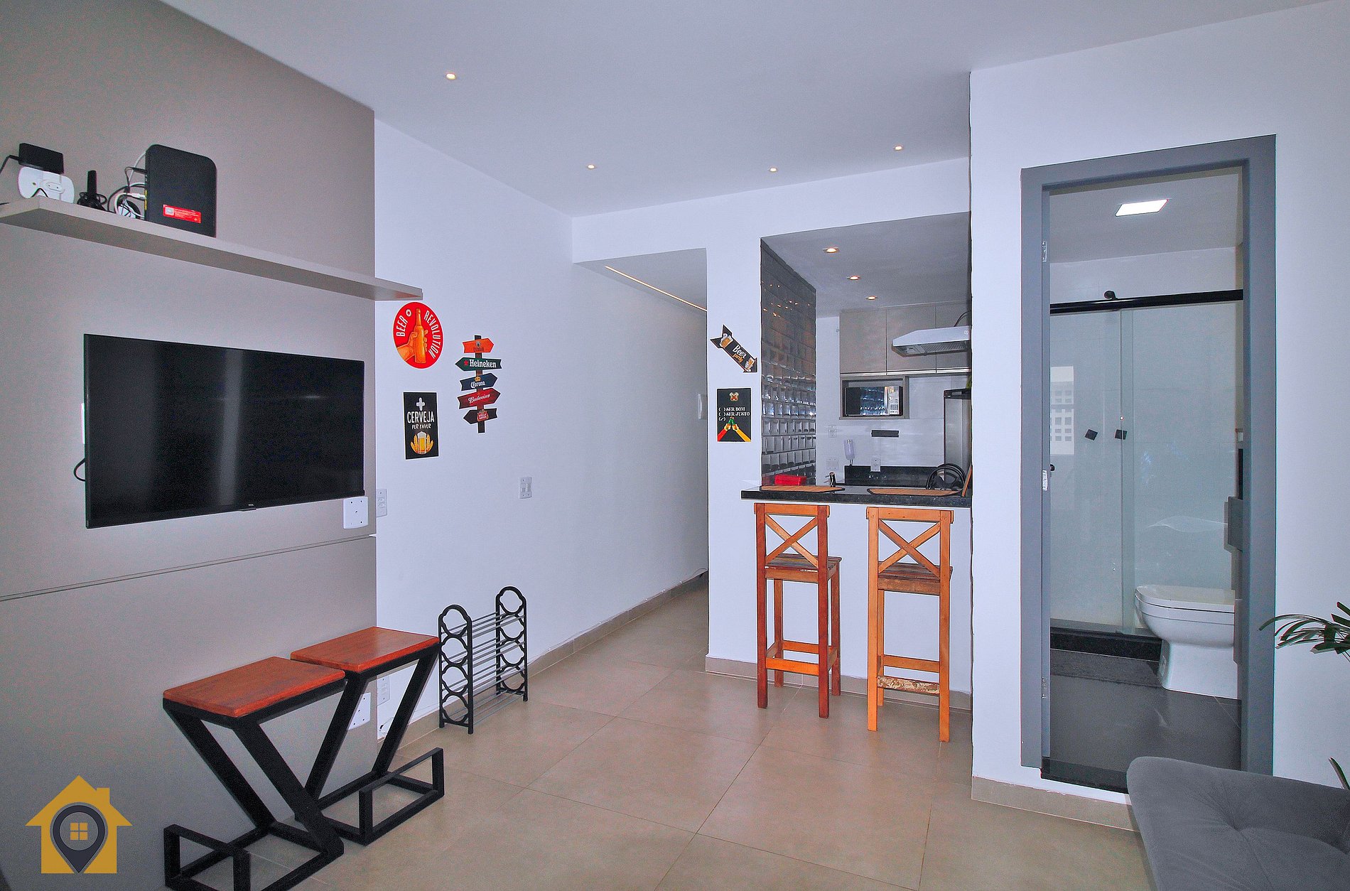 Dividido em sala confortável com sofá cama, mesa com quatro cadeiras, bancada com três cadeiras, TV Smart 43" e rede de descanso. Banheiro moderno com espelho amplo e água quente.