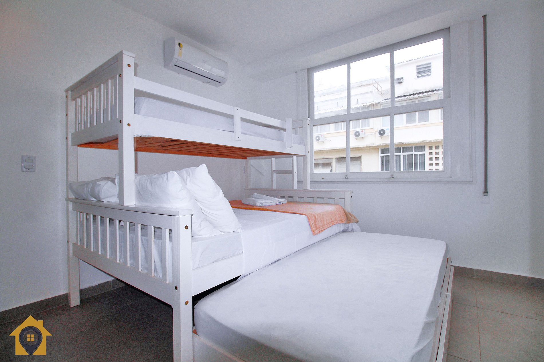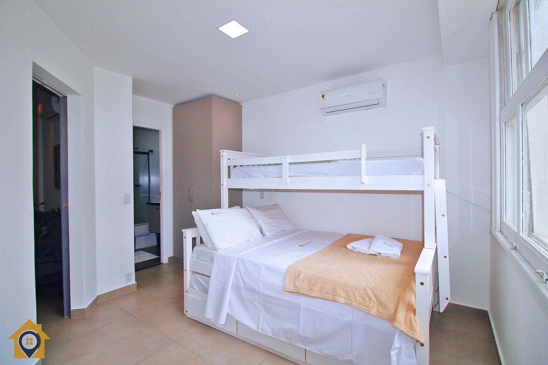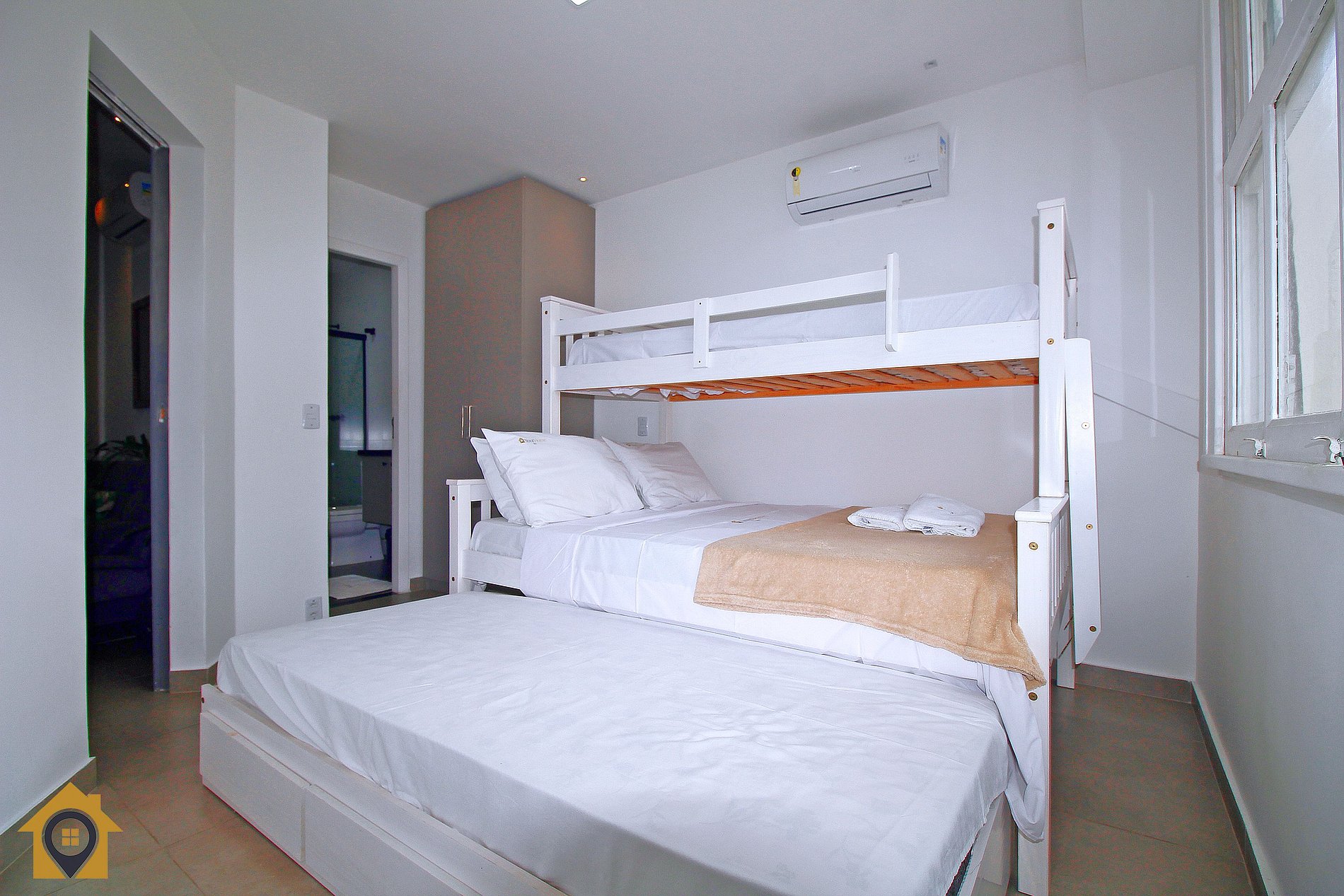 Quarto para 4 pessoas com cama de casal, duas camas de solteiro, ar-condicionado, cortina blackout e banheiro integrado.