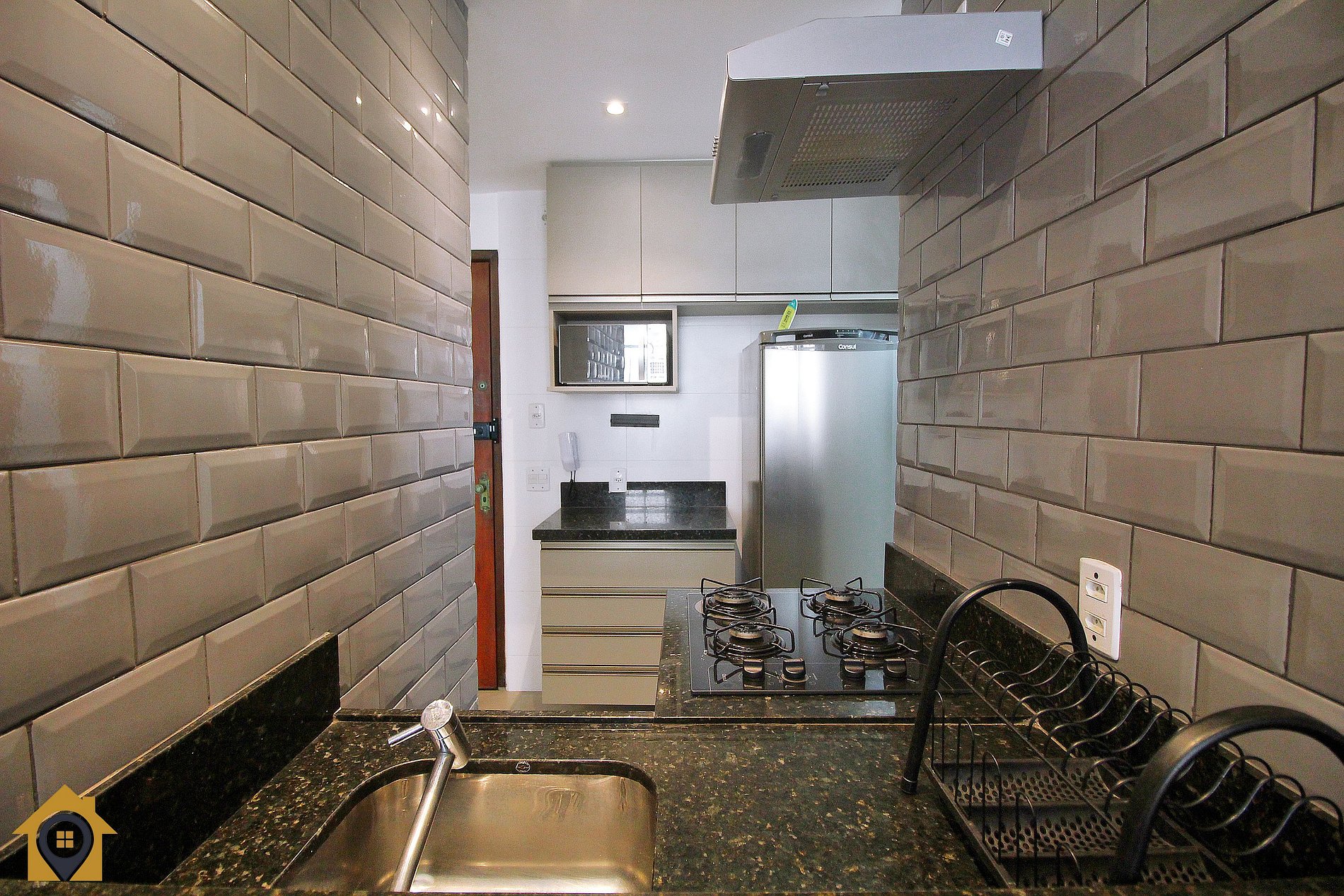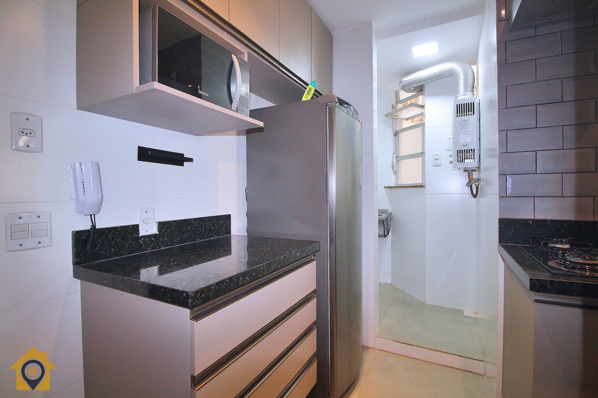 Cozinha moderna e completa, equipada com cooktop 4 bocas, geladeira, micro-ondas, sanduicheira e utensílios para cozinhar, integrada a uma pequena área de serviço com tanque.