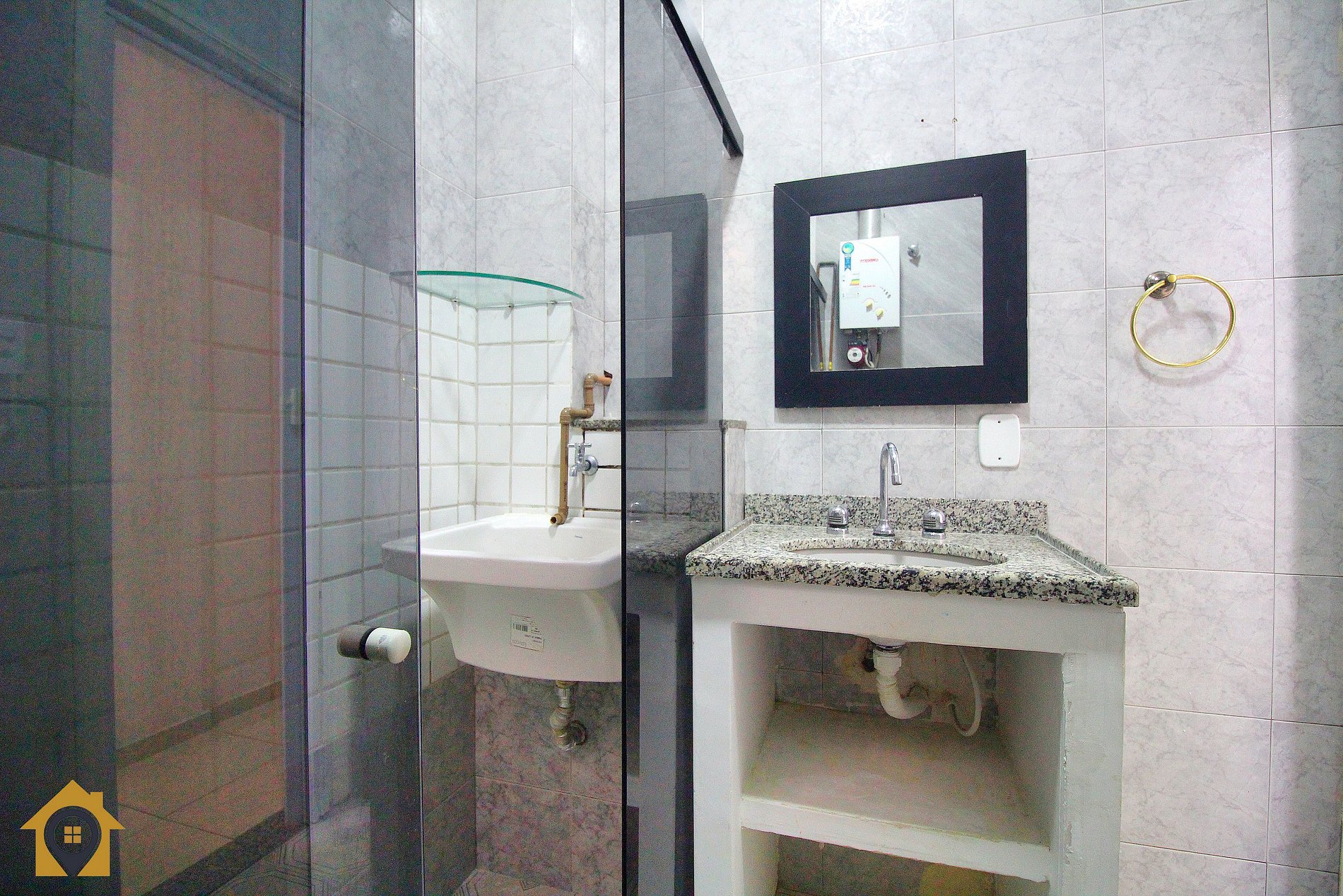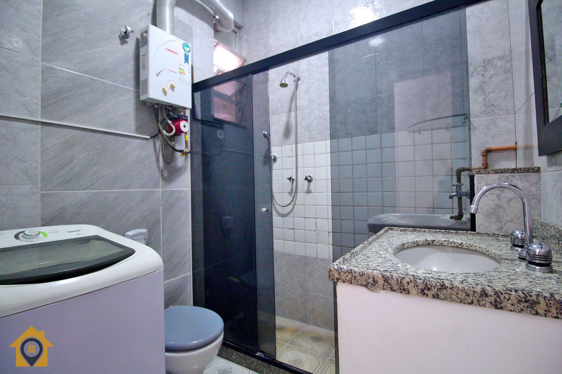 O banheiro dispõe de água quente, tanque dentro do box, espelho e máquina de lavar, trazendo praticidade durante a estadia.