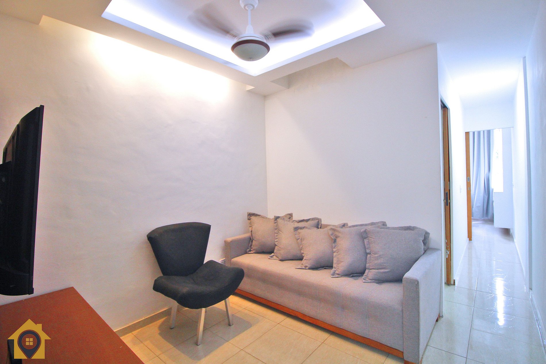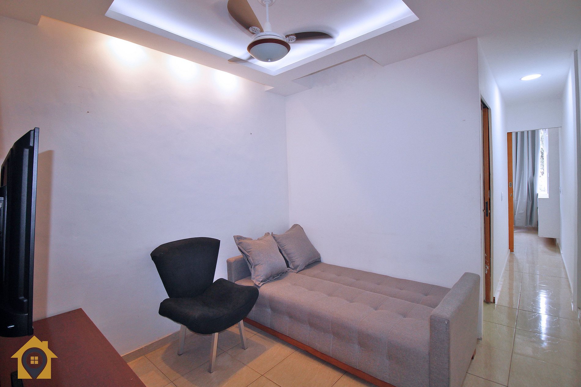 Na sala, os hóspedes encontram sofá-cama de casal, TV Smart de 43", poltrona e ventilador de teto, criando um ambiente aconchegante para descanso e lazer.
