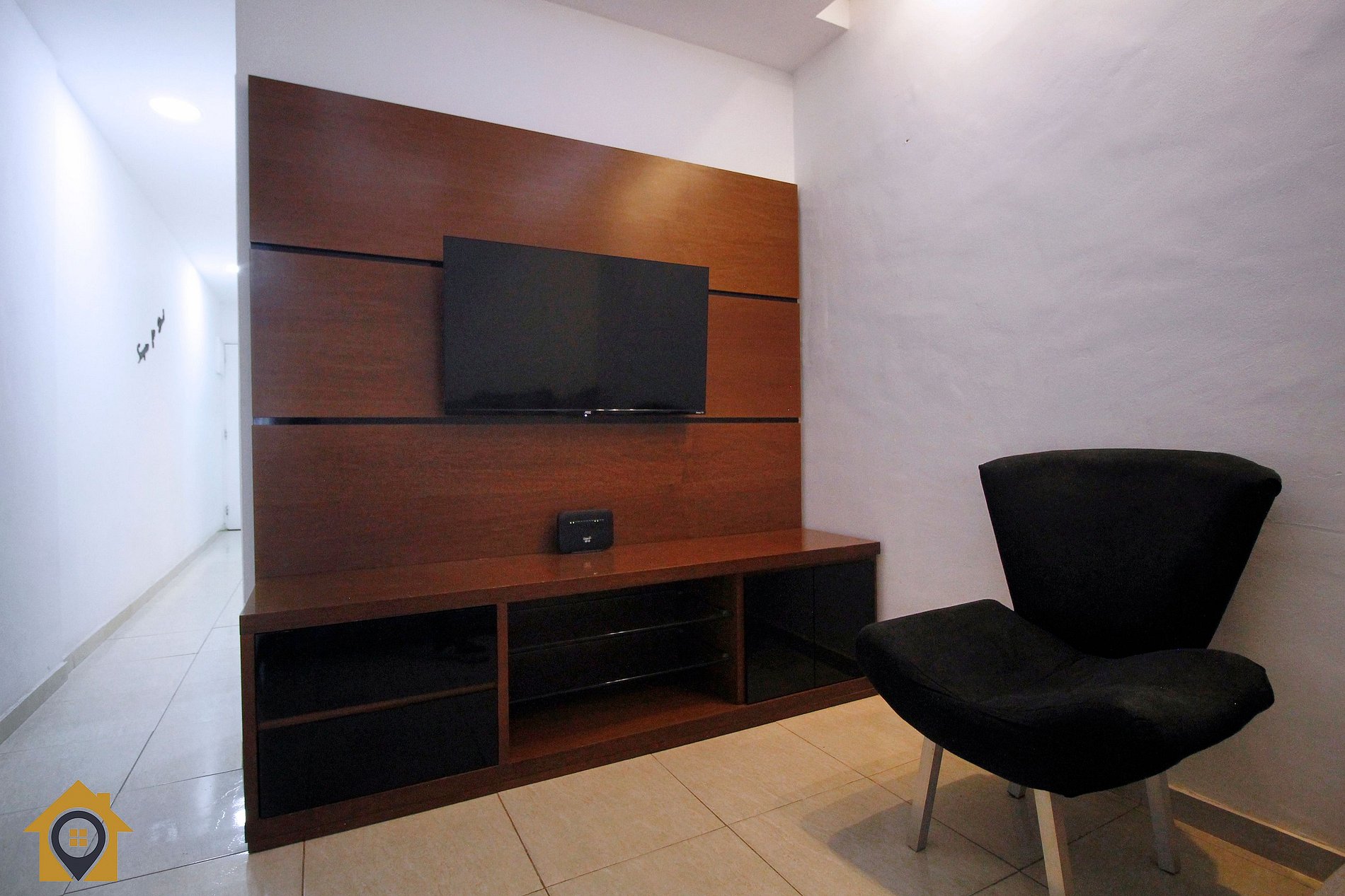 Na sala, os hóspedes encontram sofá-cama de casal, TV Smart de 43", poltrona e ventilador de teto, criando um ambiente aconchegante para descanso e lazer.