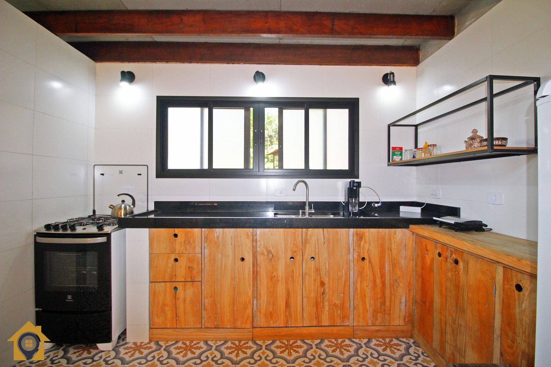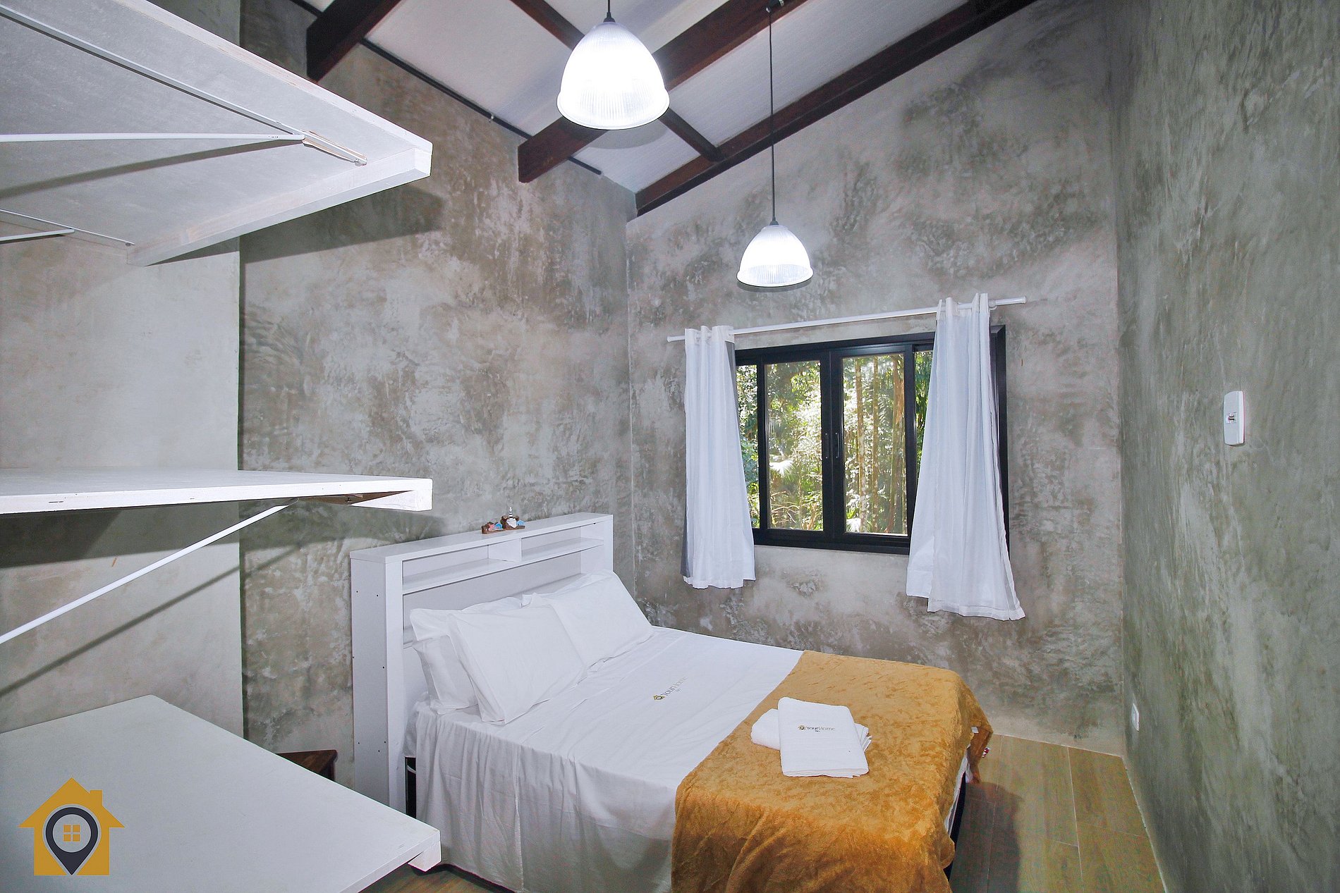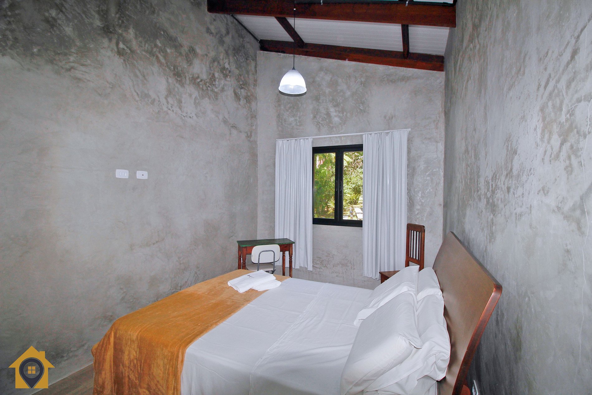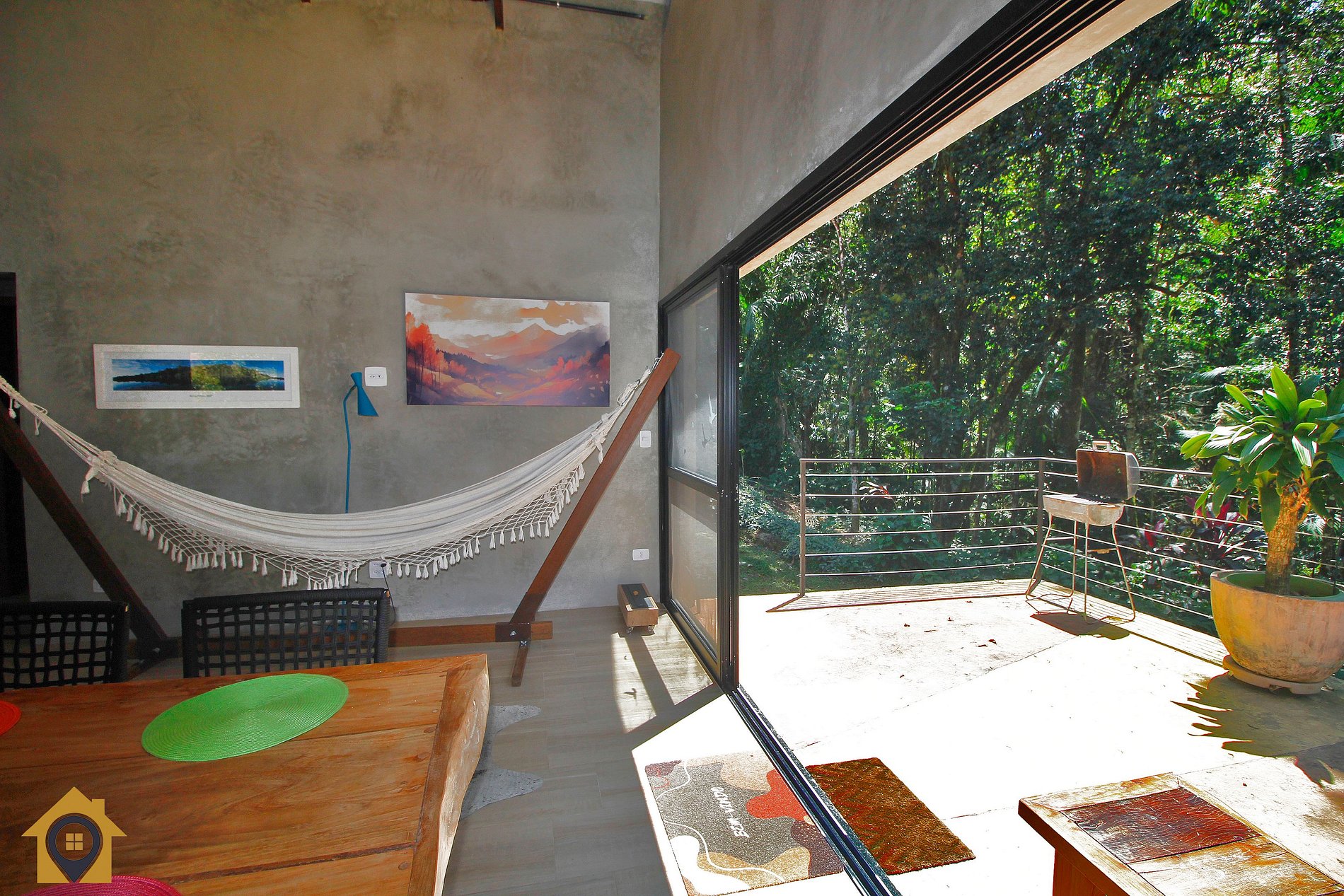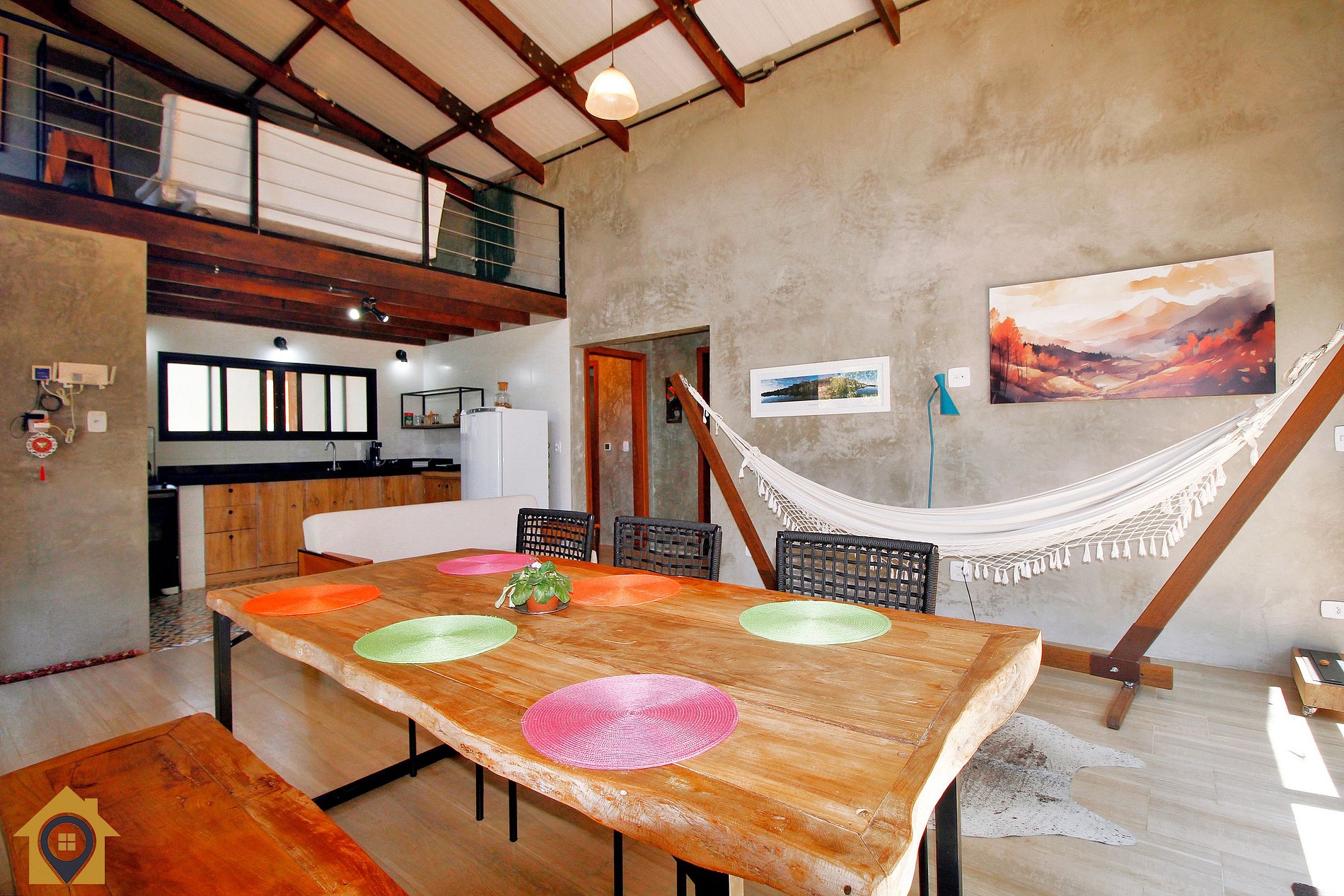 Casa aconchegante e bem equipada, perfeita para quem busca descanso em meio à natureza. A sala conta com mesa de jantar para até 6 pessoas, sofá de 3 lugares e rede de descanso, integrada à cozinha completa com fogão de 5 bocas com forno, geladeira, filtro de água e utensílios para cozinhar. Os quartos possuem cama de casal, armário para roupas e cortinas blackout, garantindo conforto e privacidade. Os banheiros têm chuveiro com água quente.