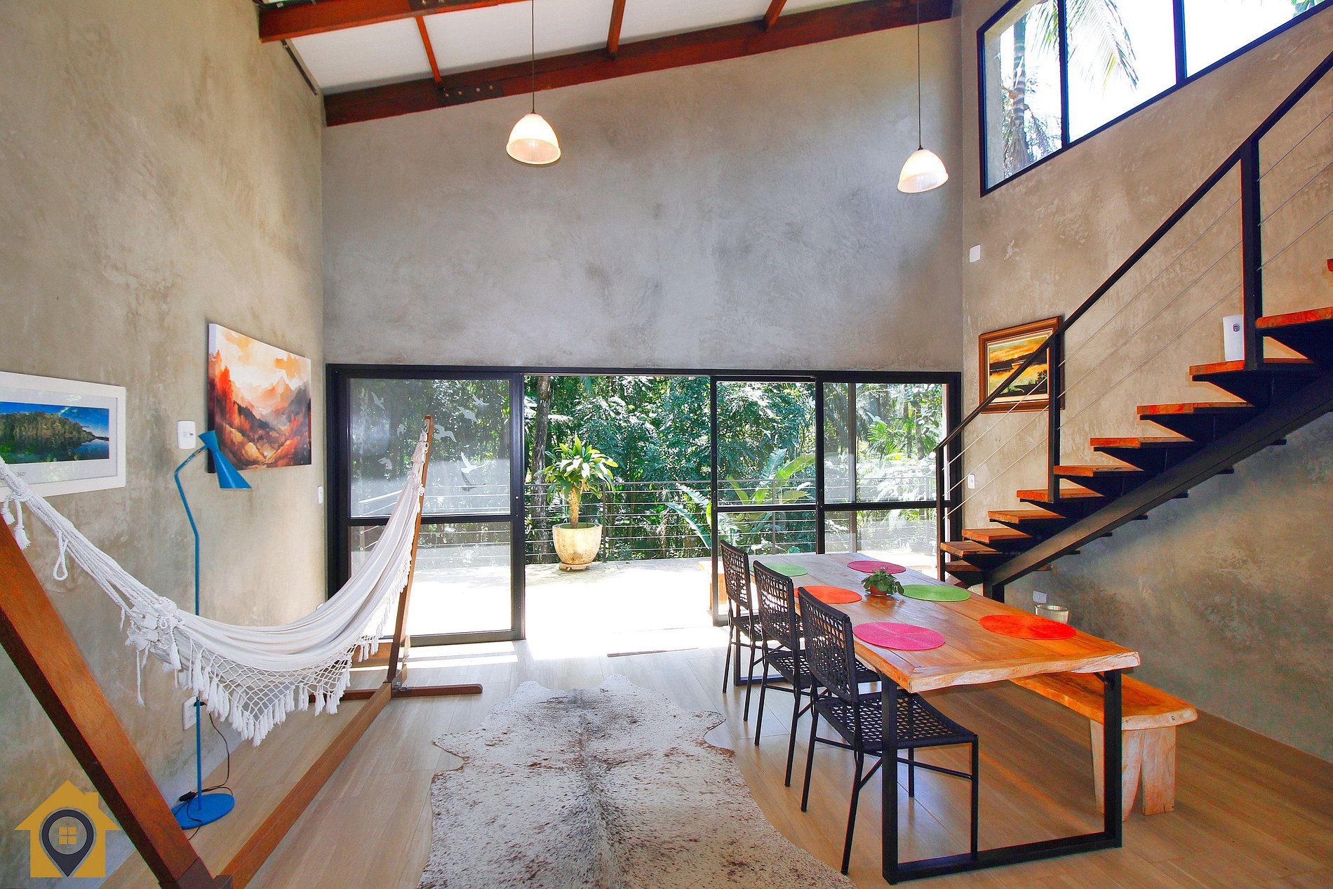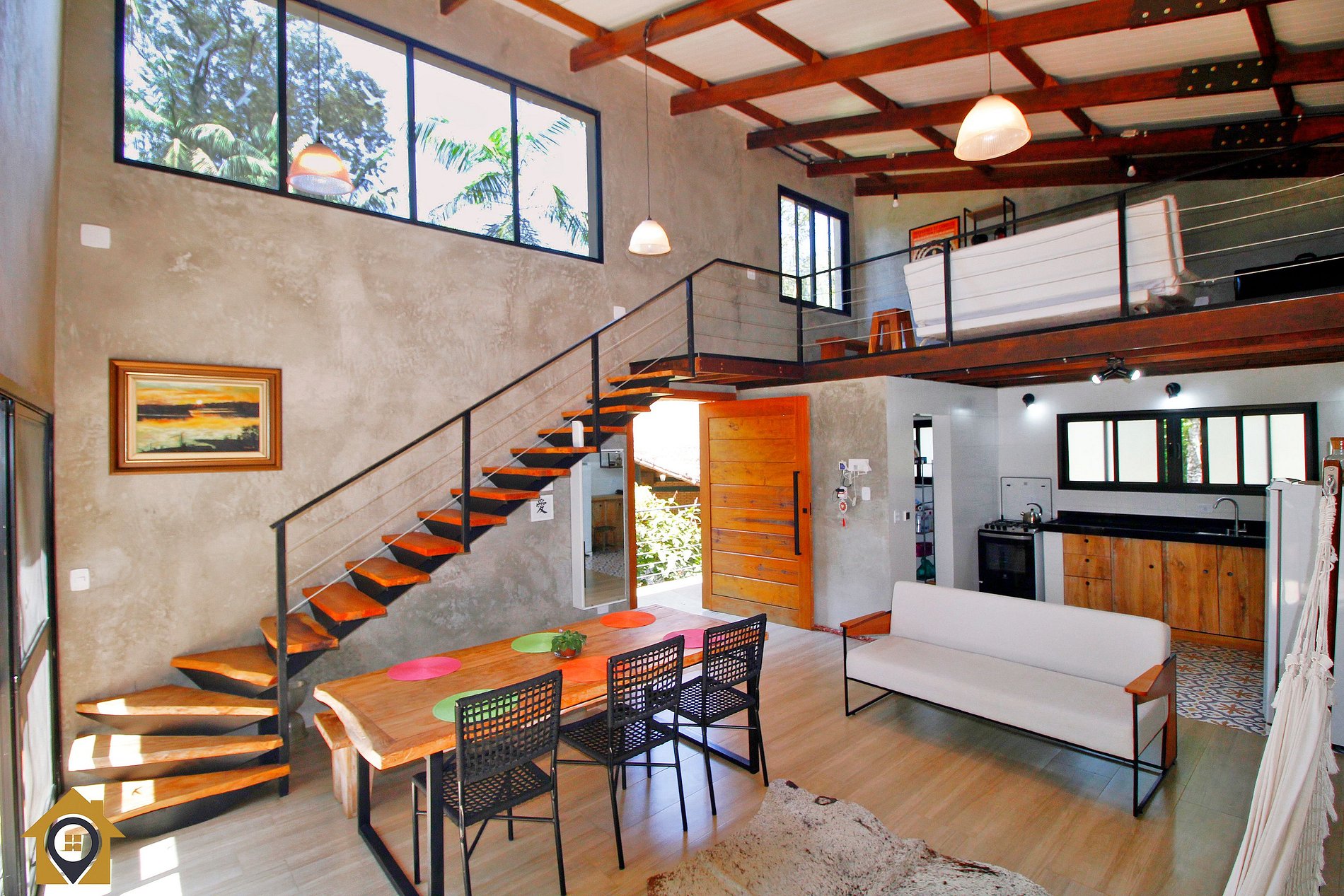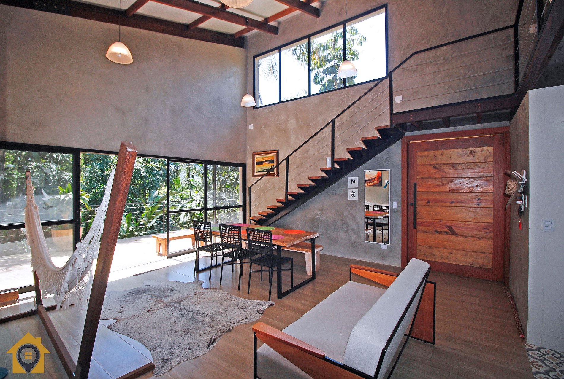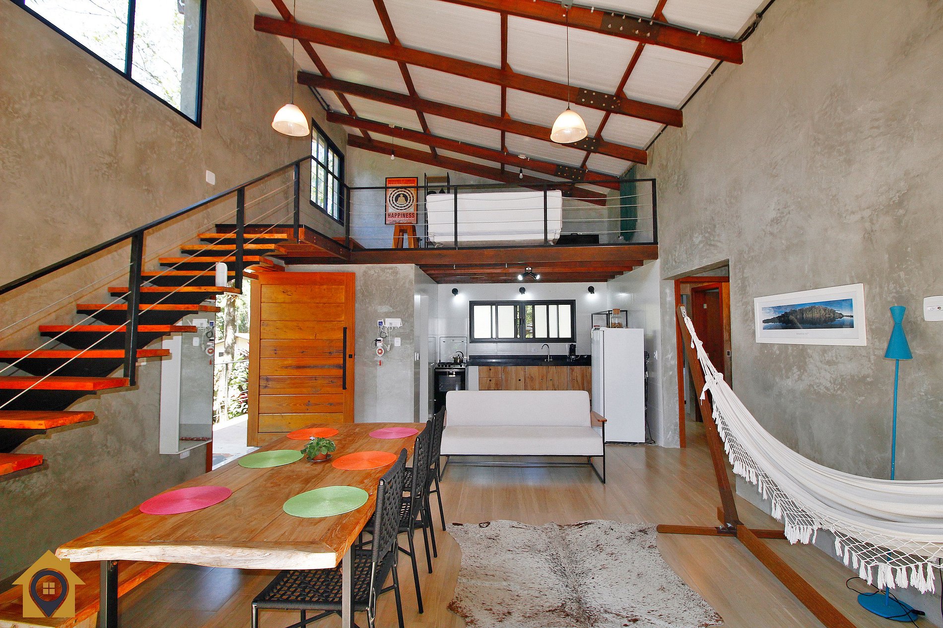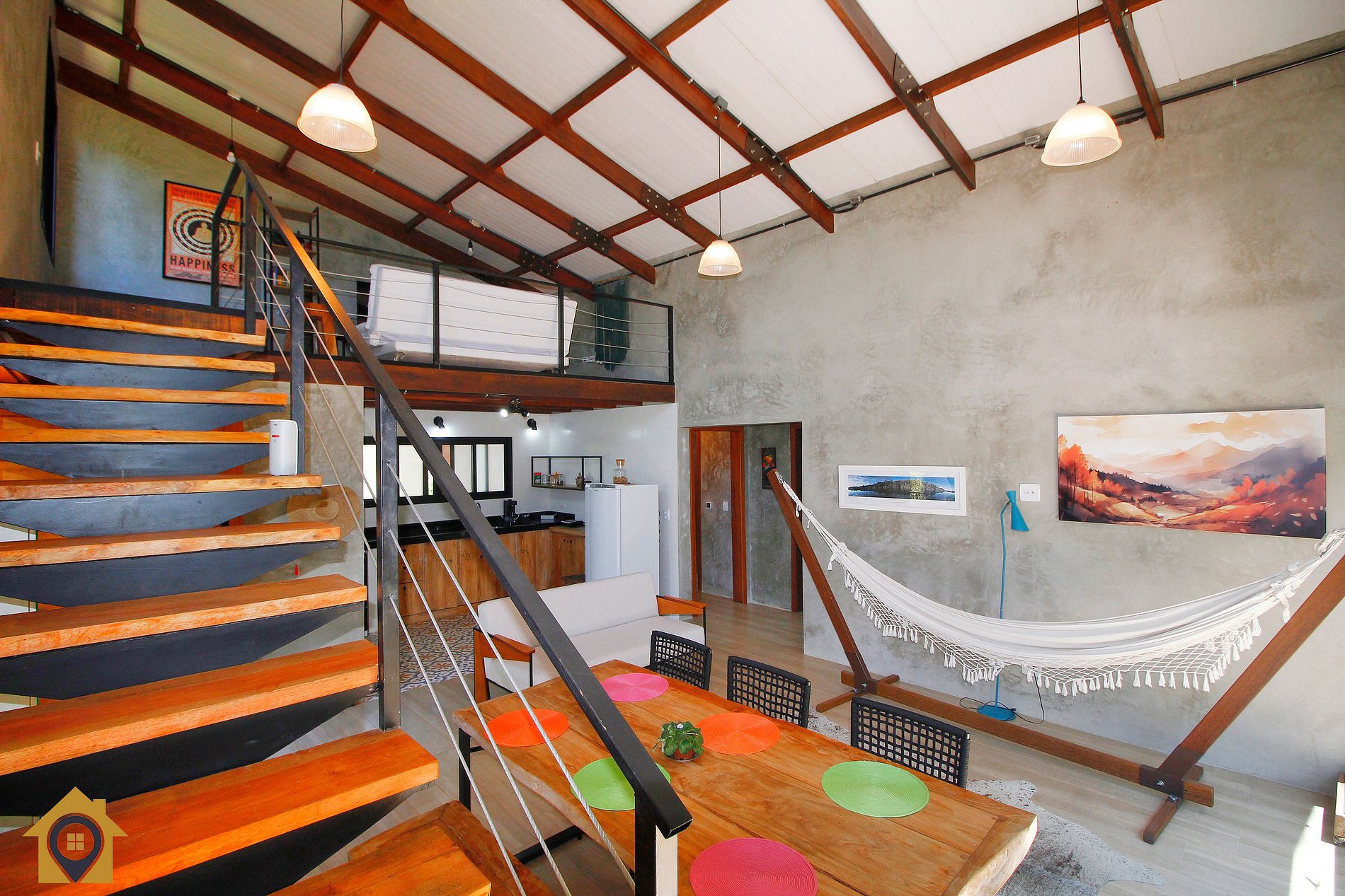 Casa aconchegante e bem equipada, perfeita para quem busca descanso em meio à natureza. A sala conta com mesa de jantar para até 6 pessoas, sofá de 3 lugares e rede de descanso, integrada à cozinha completa com fogão de 5 bocas com forno, geladeira, filtro de água e utensílios para cozinhar. Os quartos possuem cama de casal, armário para roupas e cortinas blackout, garantindo conforto e privacidade. Os banheiros têm chuveiro com água quente.