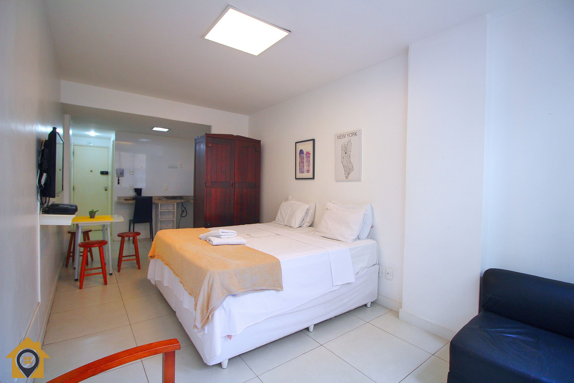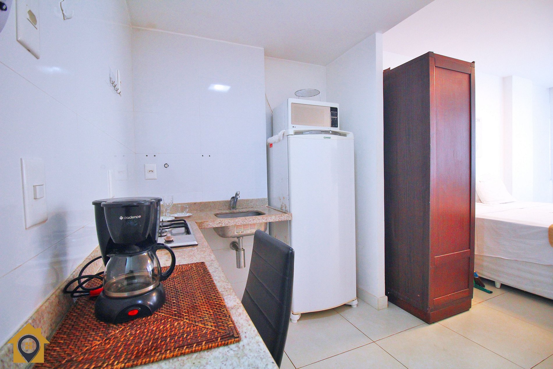 O ambiente é dividido entre quarto e cozinha integrados, proporcionando conforto e funcionalidade: