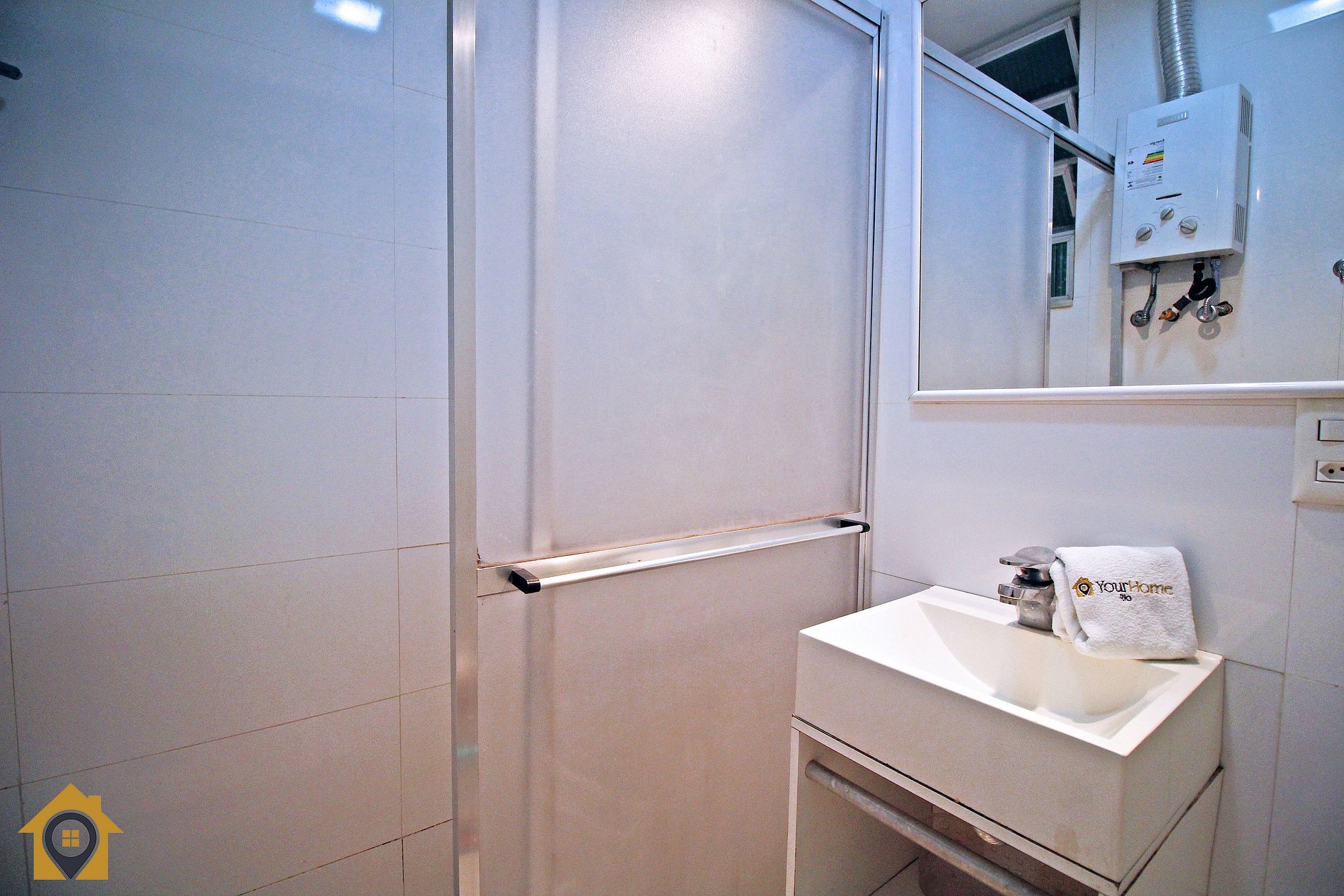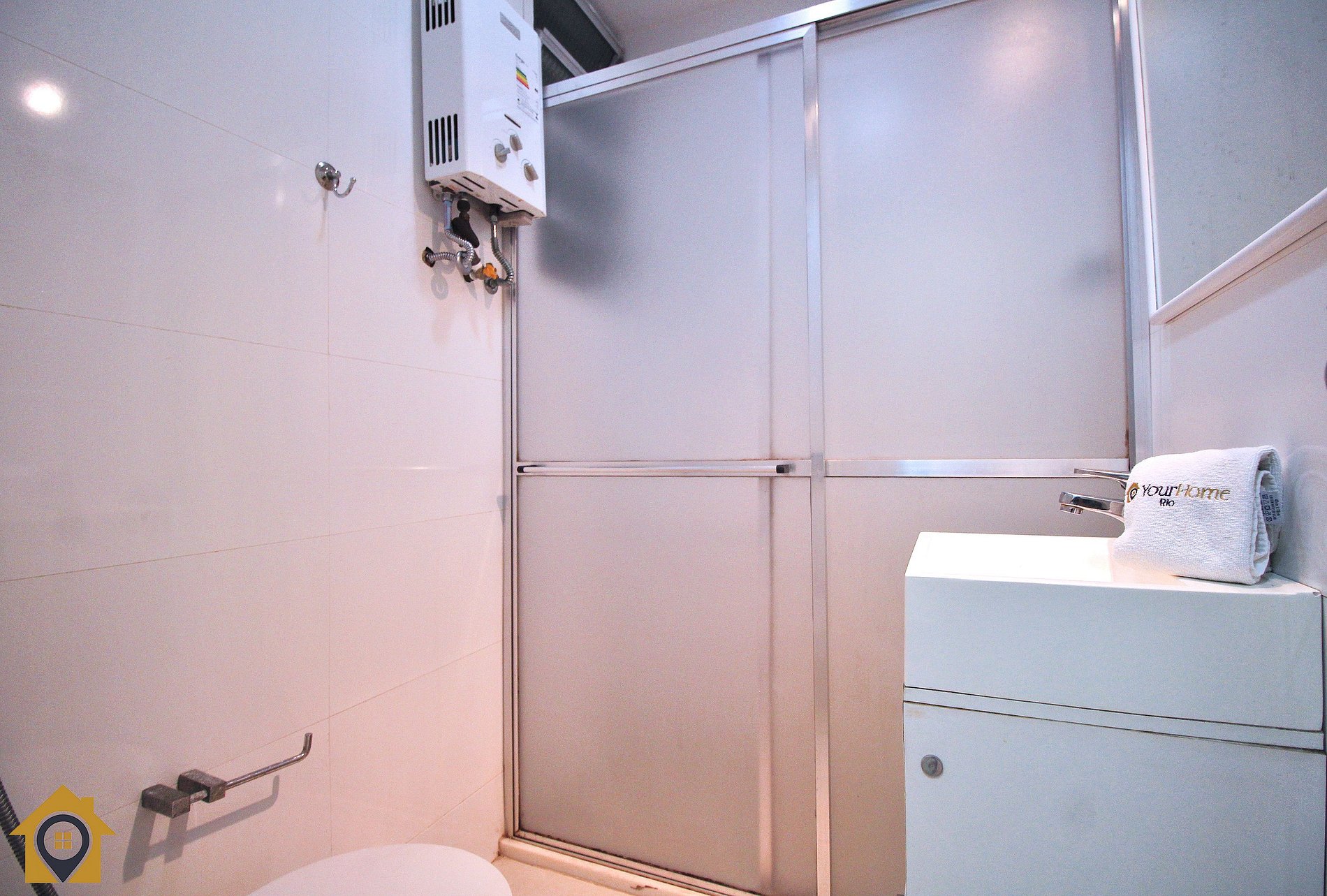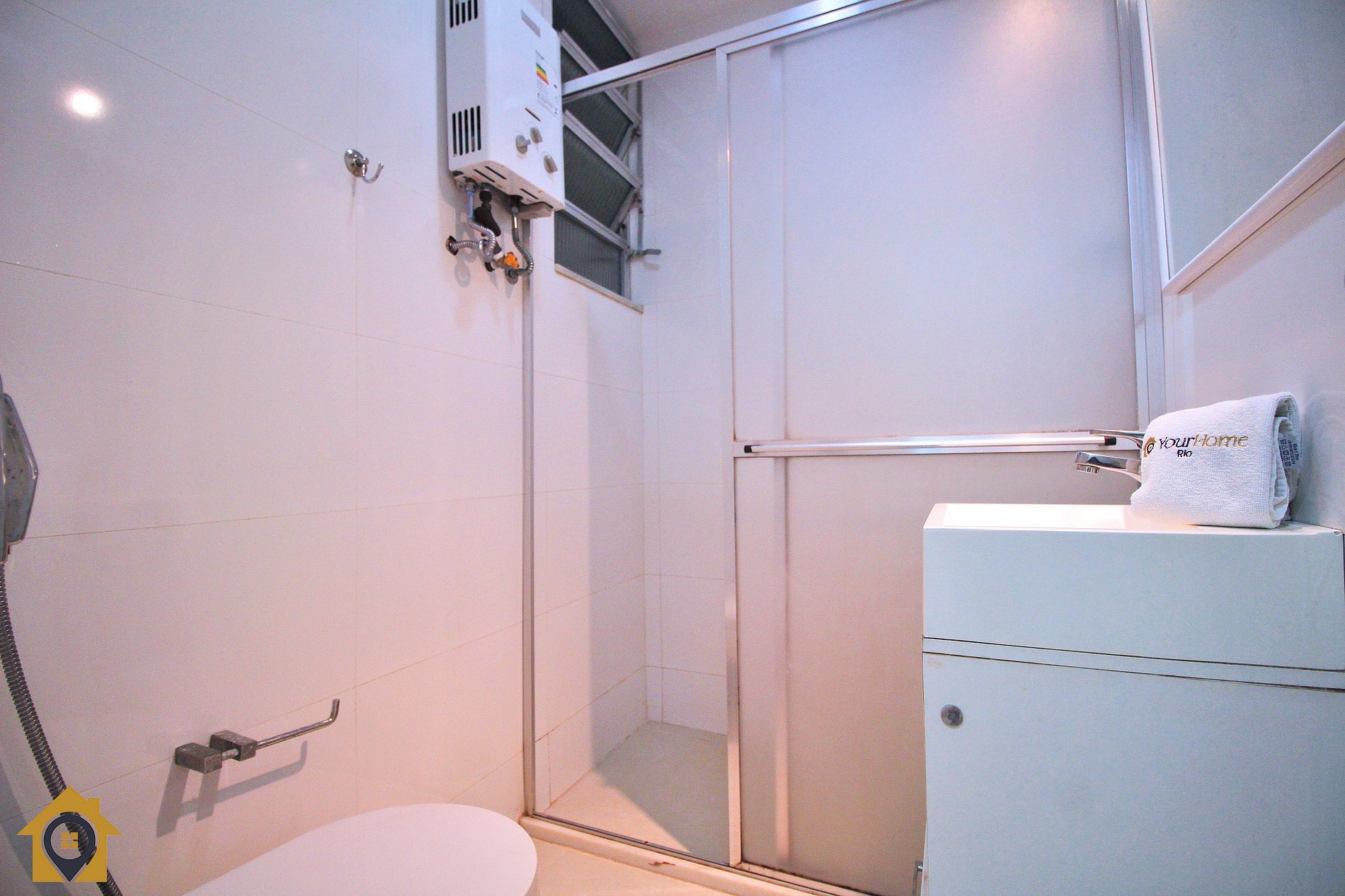 Banheiro com chuveiro a gás e água quente.