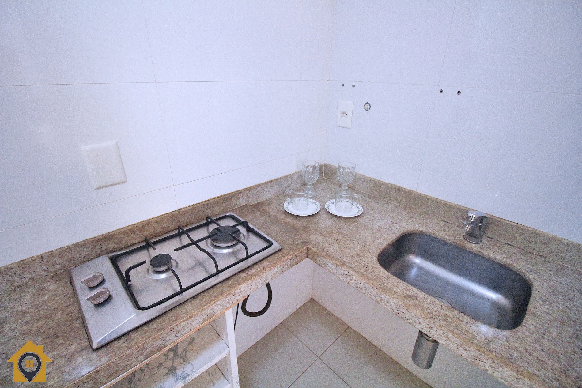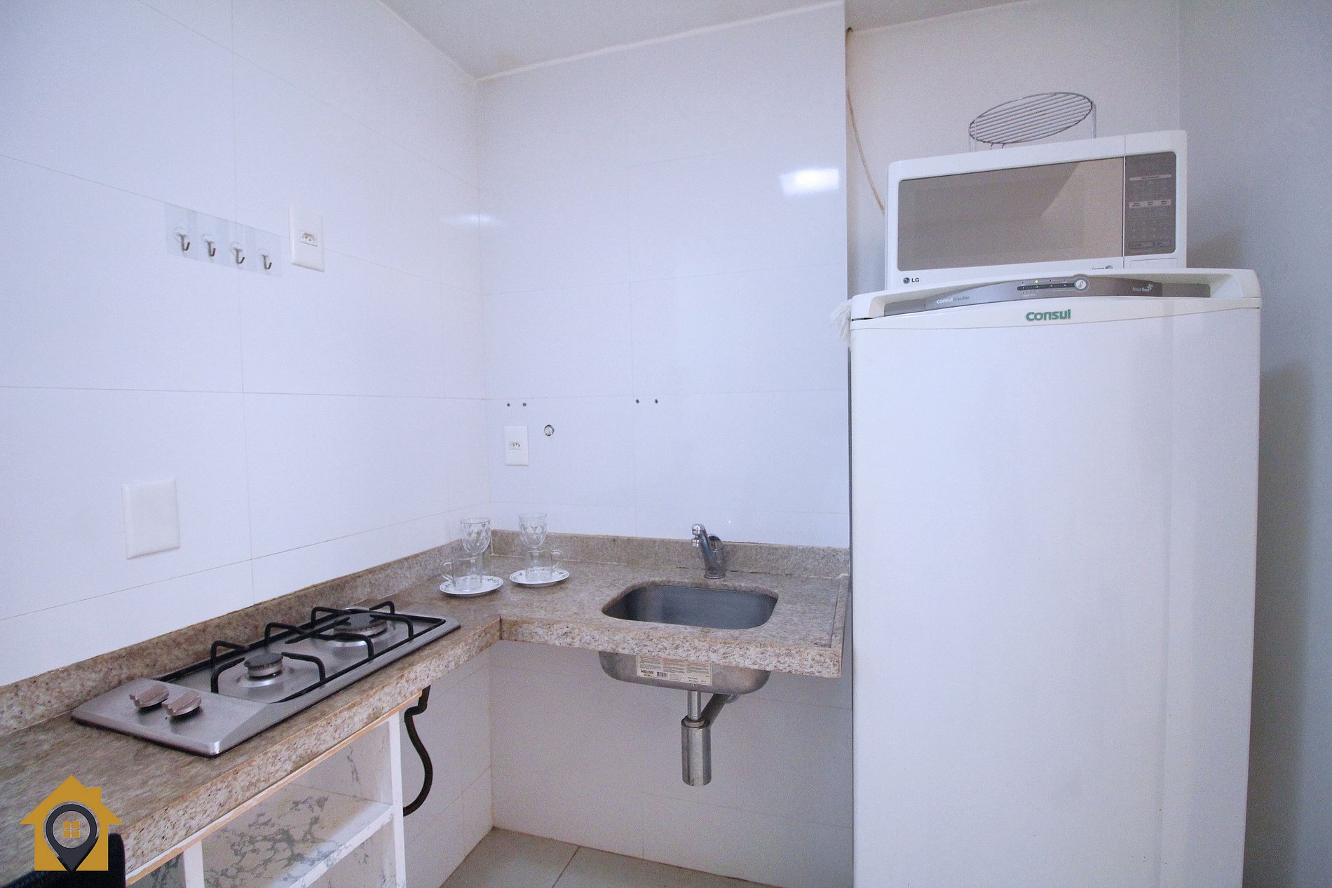 Cozinha equipada com mesa para três pessoas, geladeira, cooktop de duas bocas e utensílios básicos para o preparo de refeições.